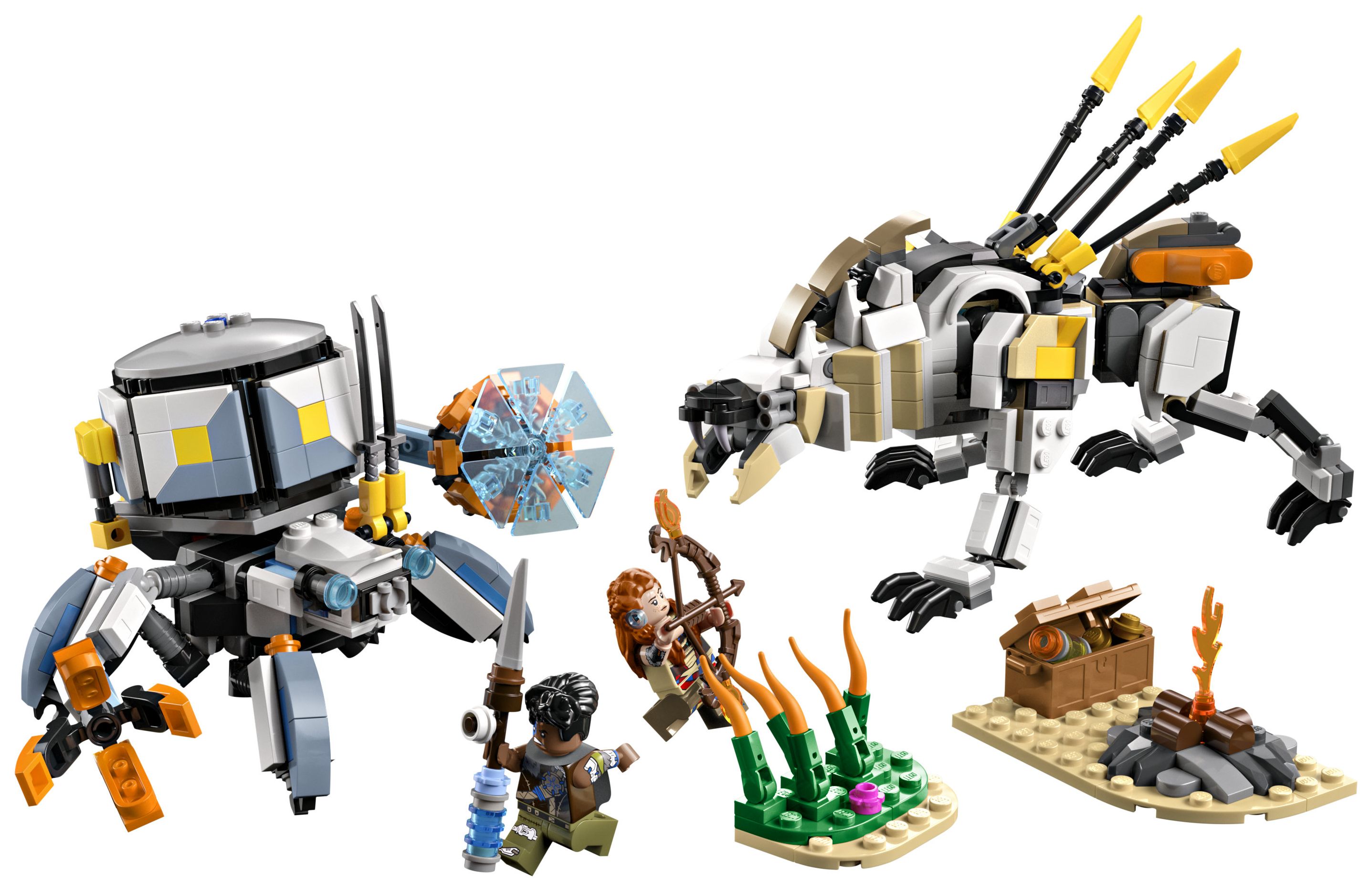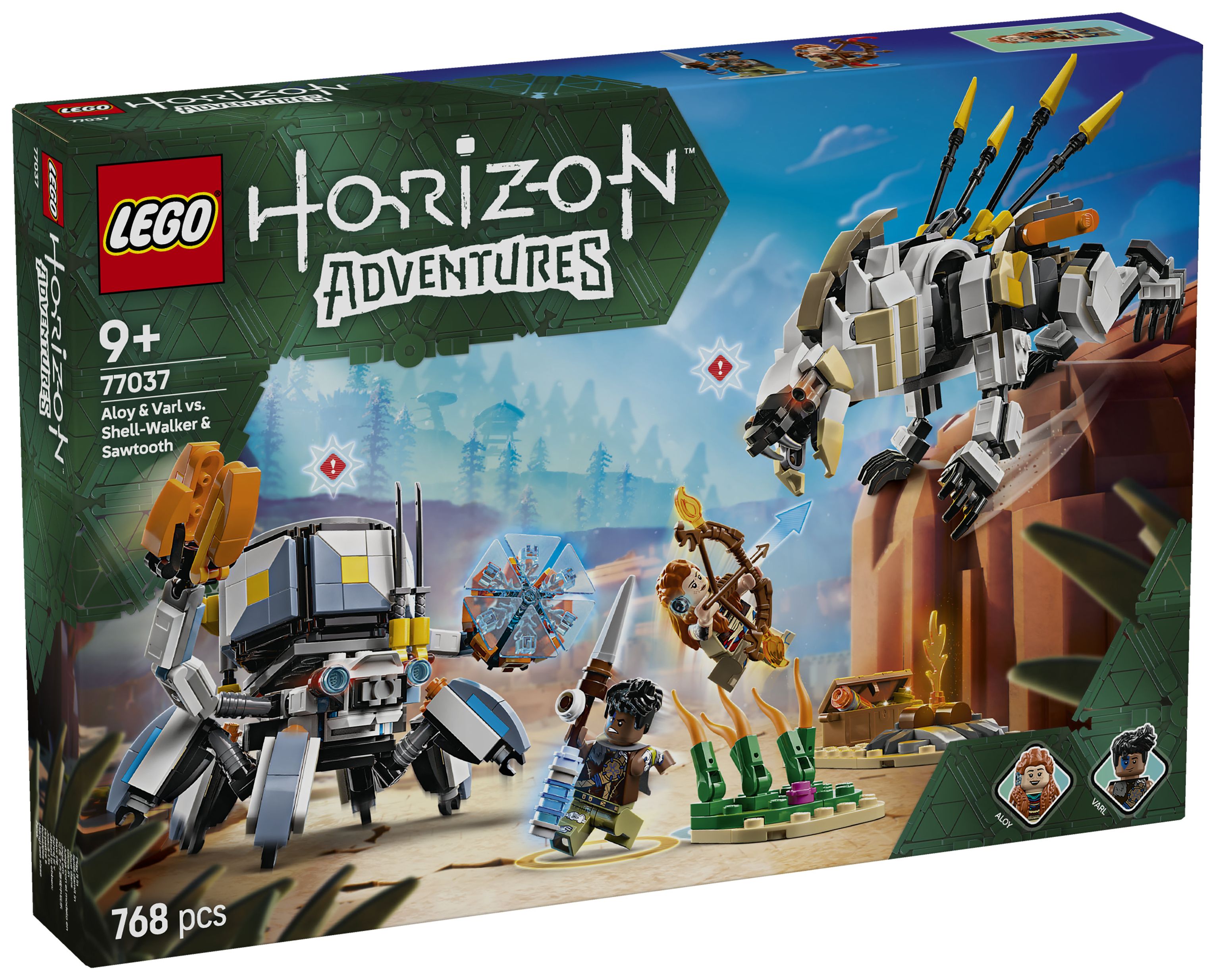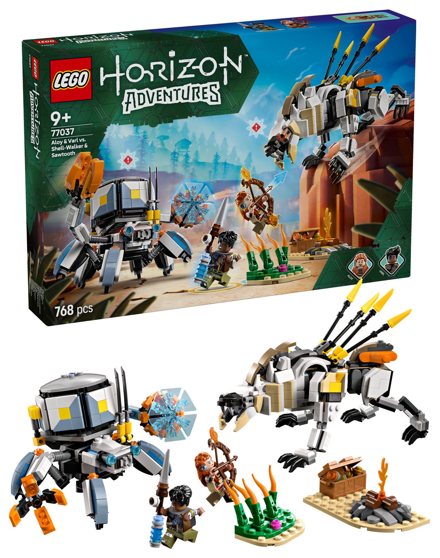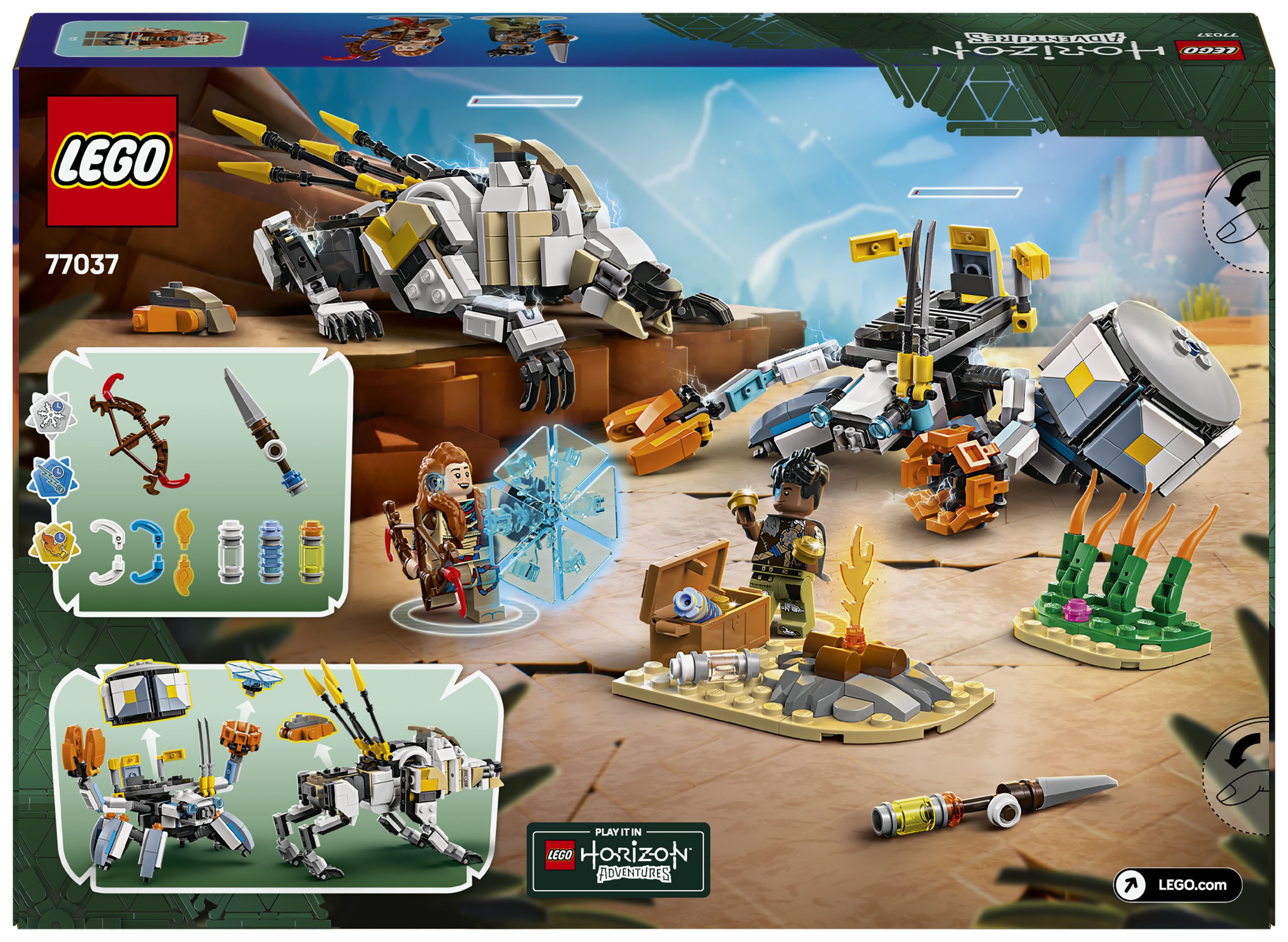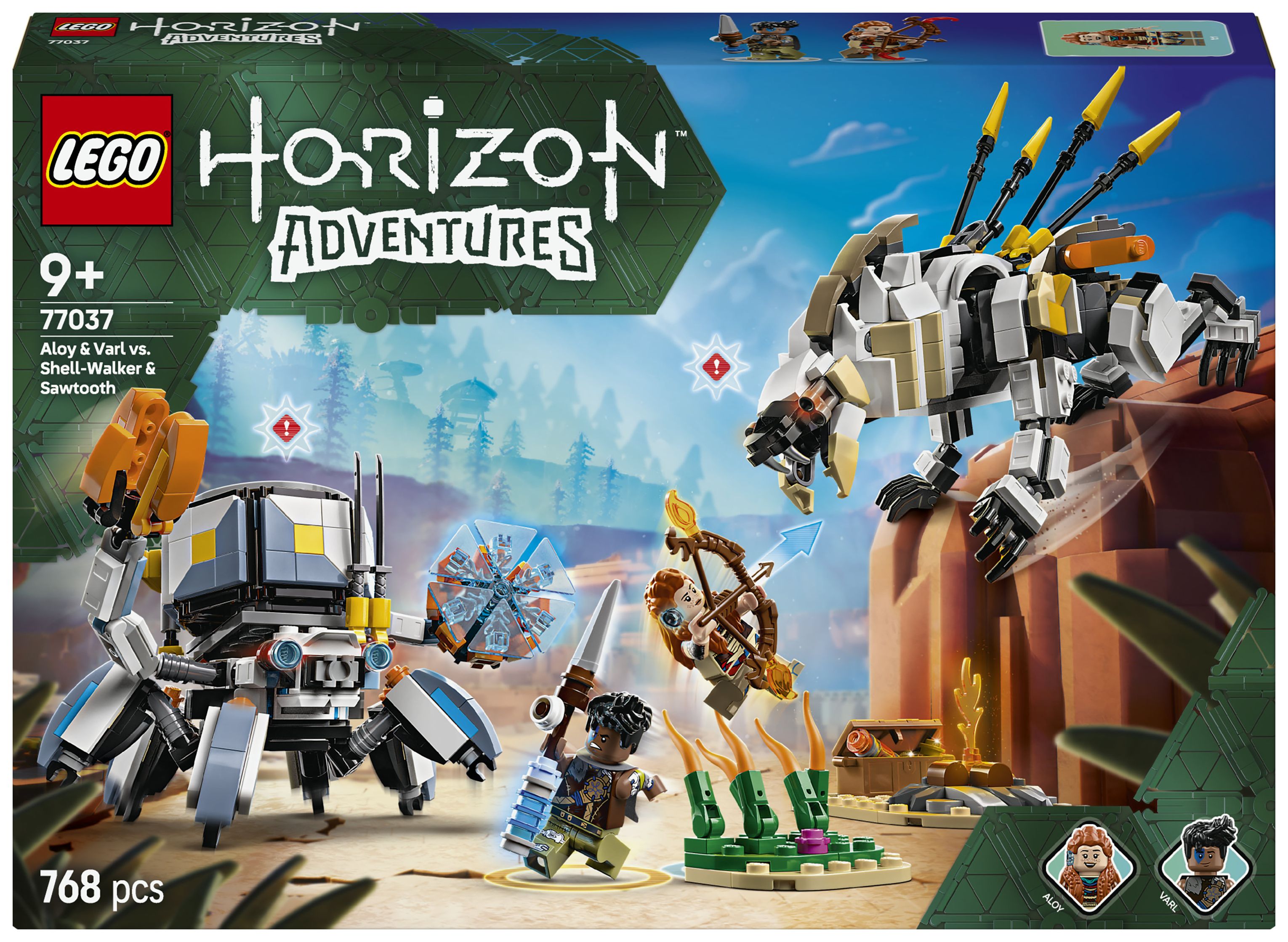 Dieses LEGO Gaming-Set basiert auf dem Videospiel LEGO Horizon Adventures und beinhaltet neben den Spielzeug-Monstermaschinen auch die beiden Minifiguren Aloy und Varl. Aloy trägt einen Bogen, und ihr treuer Begleiter Varl hält einen Speer. Beide Ausrüstungsgegenstände lassen sich upgraden, um Feuer-, Schock- oder Gefrier-Attacken durchzuführen – genau wie im Videospiel. 2 baubare Spielzeug-Robotermonster sind ebenfalls enthalten. Der Panzerwanderer hat bewegliche Arme und Beine, aufklappbare Klauen, eine abnehmbare Frachtkapsel und einen Energieschild. Der Sägezahn kann seinen Oberkörper drehen und Hals, Kopf und Beine bewegen. Hohes Schilf, ein Lagerfeuer und eine Schatzkiste laden zu fantasievollen Rollenspielen ein. Zusätzlichen digitalen Bauspaß bietet die LEGO Builder App.