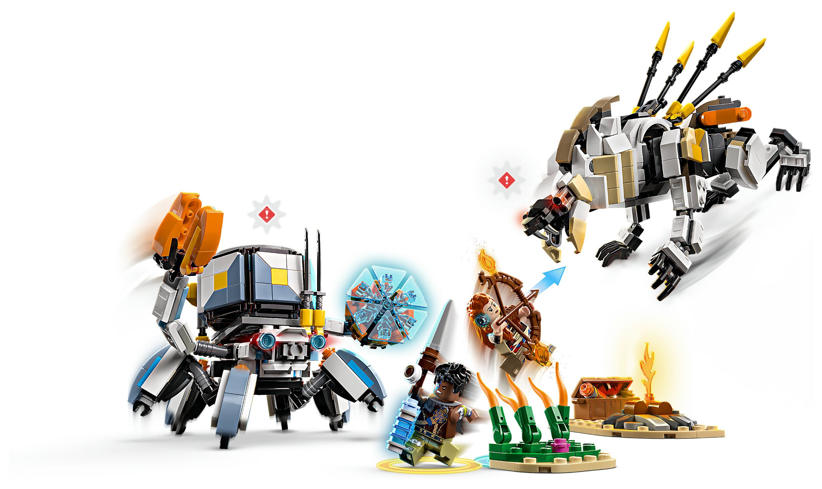 LEGO® Abenteuerspielzeug: Kinder begleiten Aloy und Varl in ein Duell mit 2 voll beweglichen Maschinen, dem Panzerwanderer und dem Sägezahn. Für Feuer-, Schock- oder Gefrier-Attacken lassen sich Elemente am Speer und Bogen austauschen