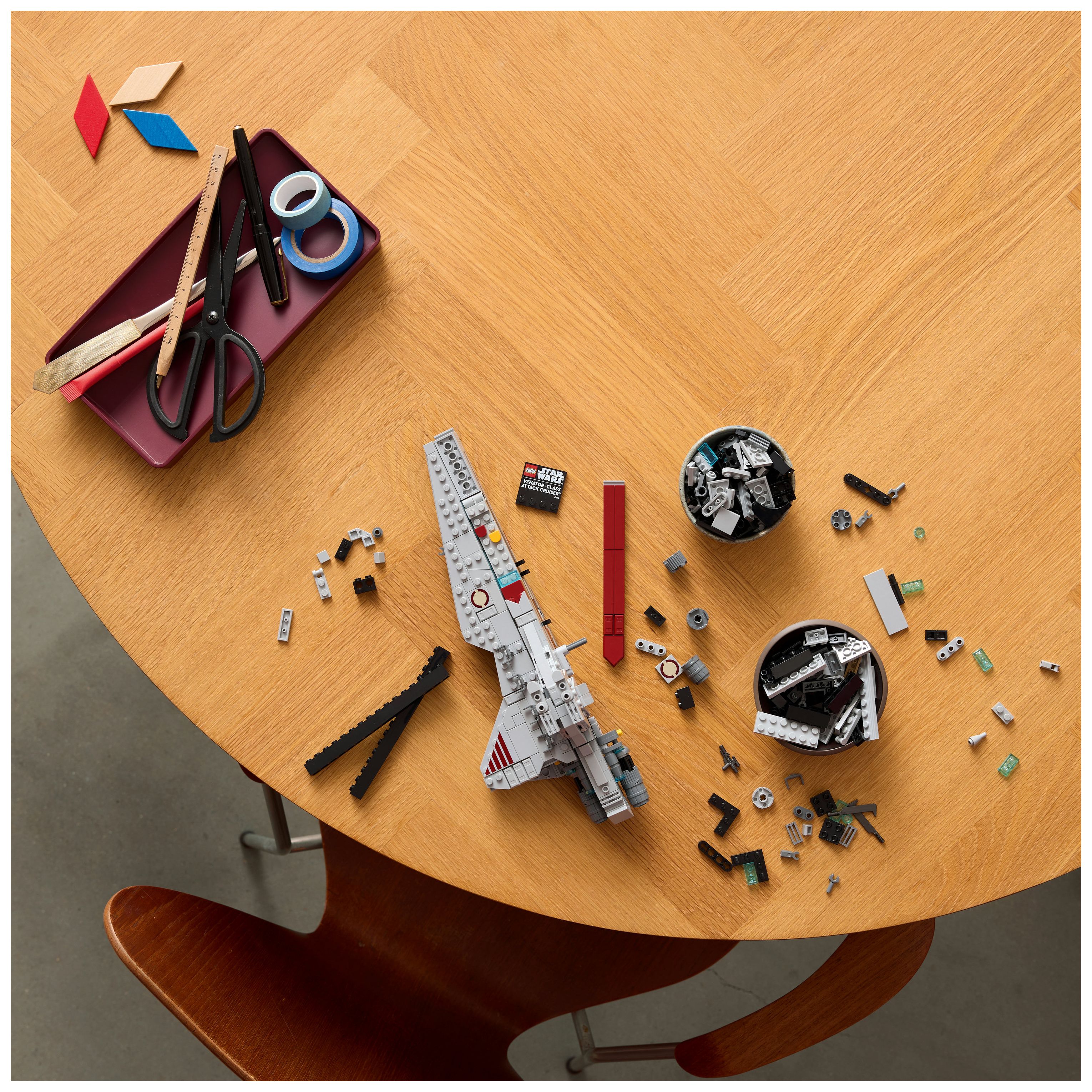 AUTHENTISCHE DETAILS: Bilde die stromlinienförmige Silhouette und die markanten Erkennungszeichen des legendären Angriffskreuzers der Venator-Klasse mit LEGO® Steinen nach