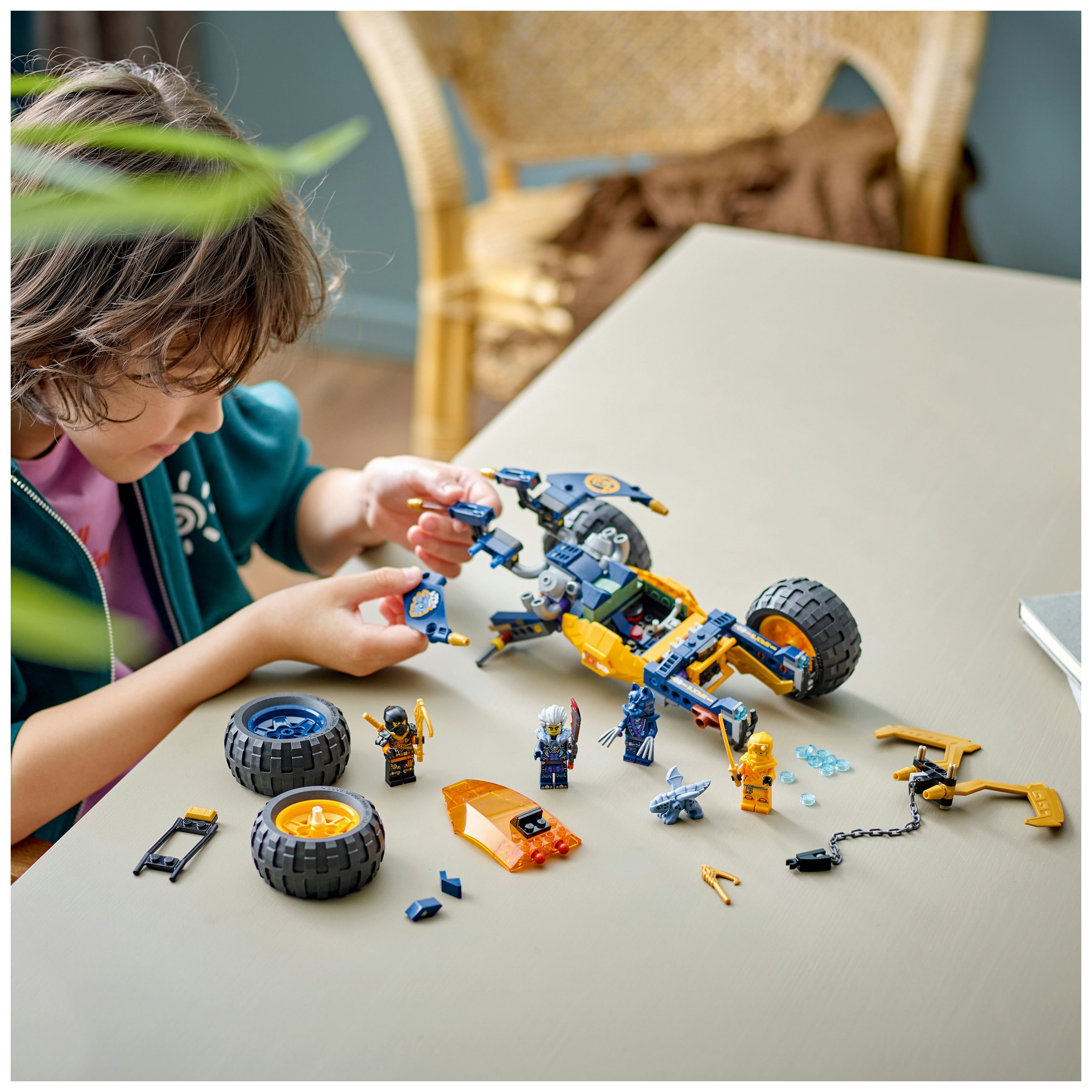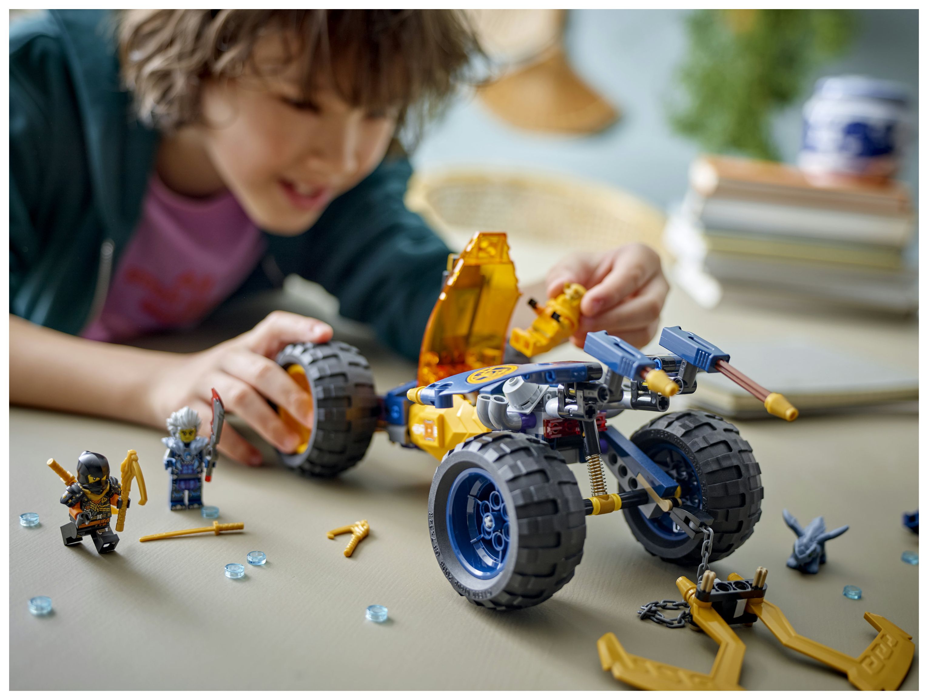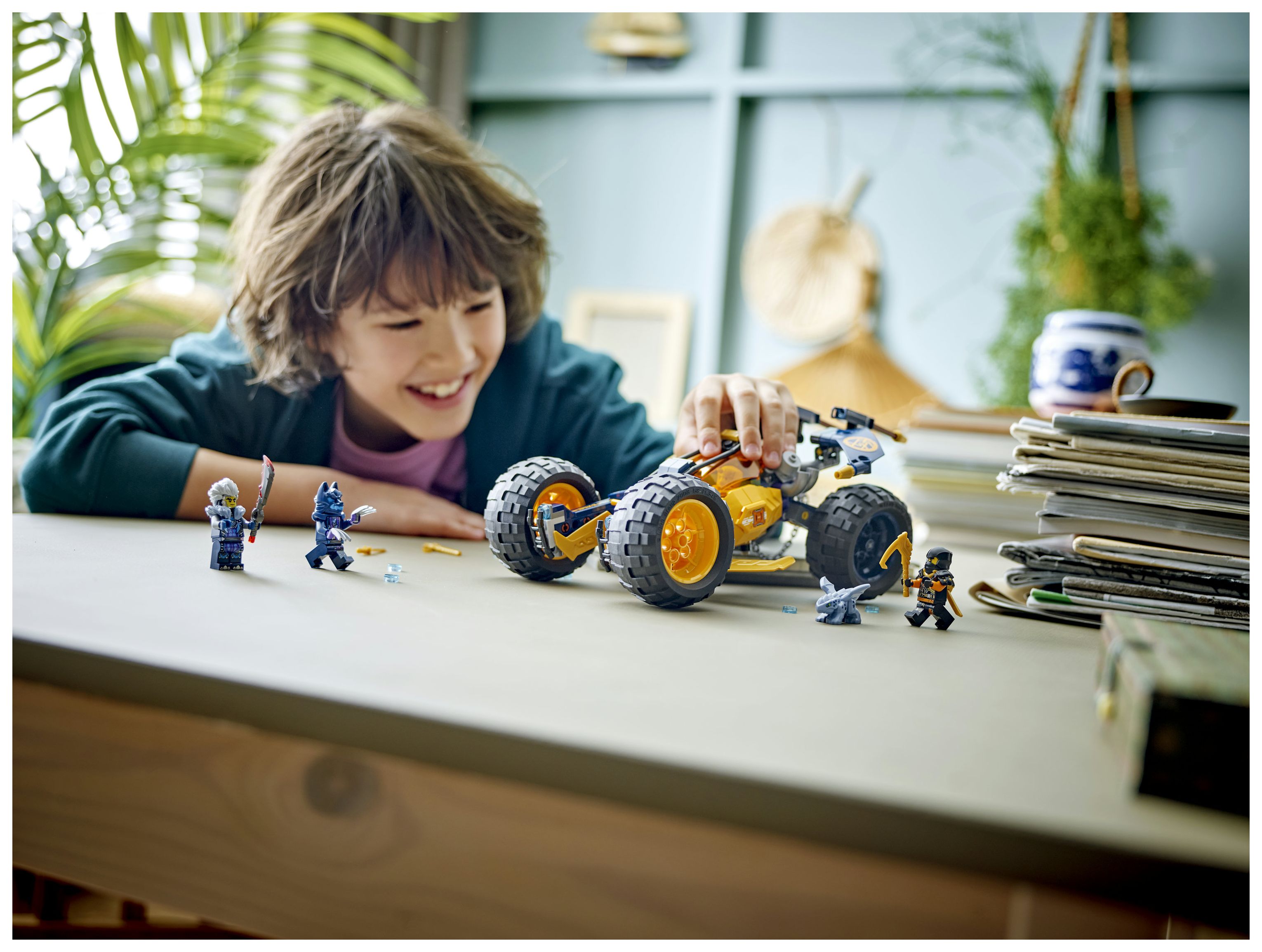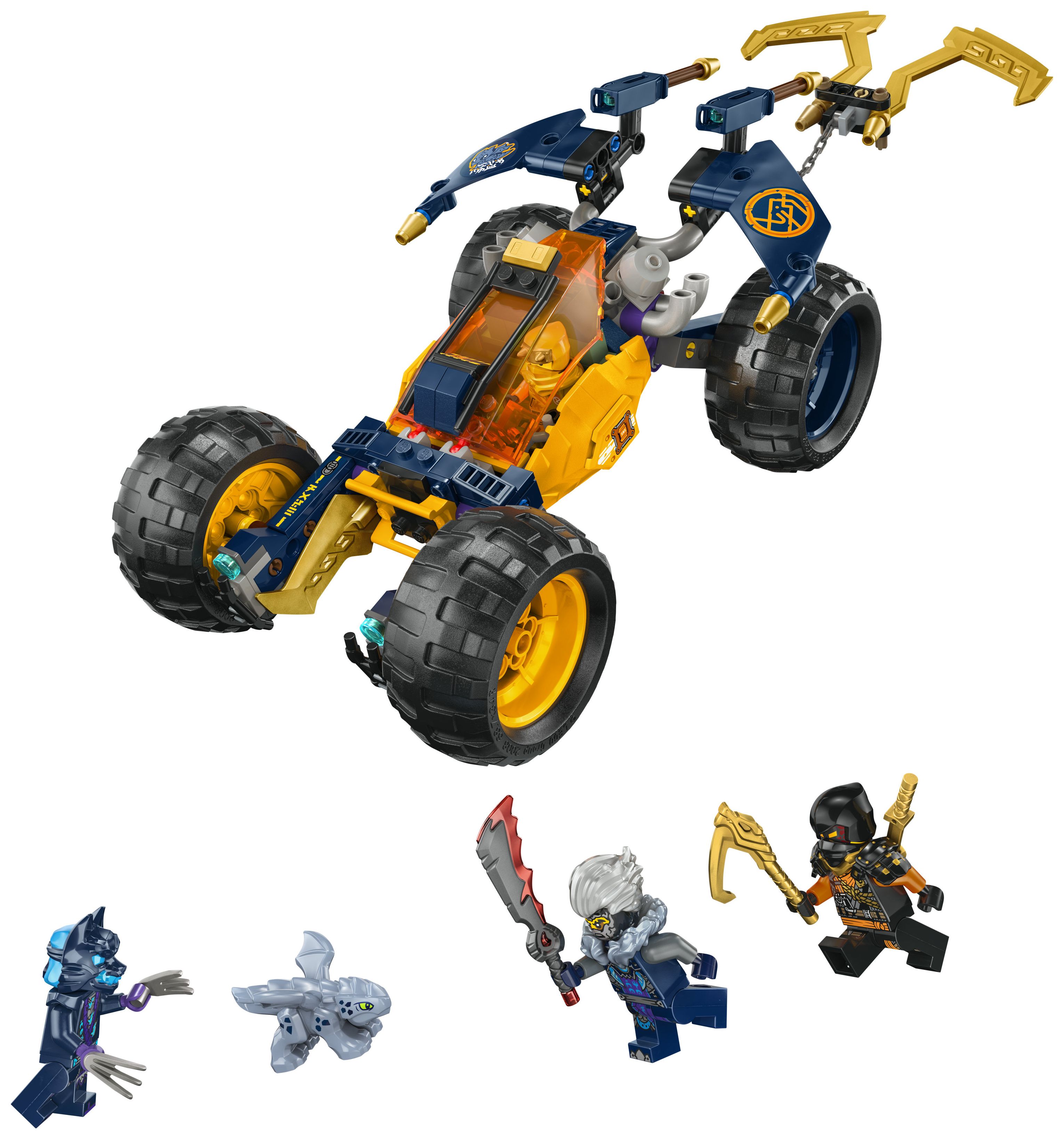 LEGO® NINJAGO Arins Ninja-Geländebuggy (71811) lässt Jungen und Mädchen ab 7 Jahren die packenden Duelle aus der 2. Staffel der TV-Serie NINJAGO® Aufstieg der Drachen nachstellen. Dieses Abenteuerset für Kinder beinhaltet ein gelbes Spielzeugauto mit beweglichen Rädern, Federung, aufklappbarem Cockpit und Platz für 2 Minifiguren. 2 sechsschüssige Shooter und ein großer Haken am Heck helfen dir, die Bösewichte zu fangen.