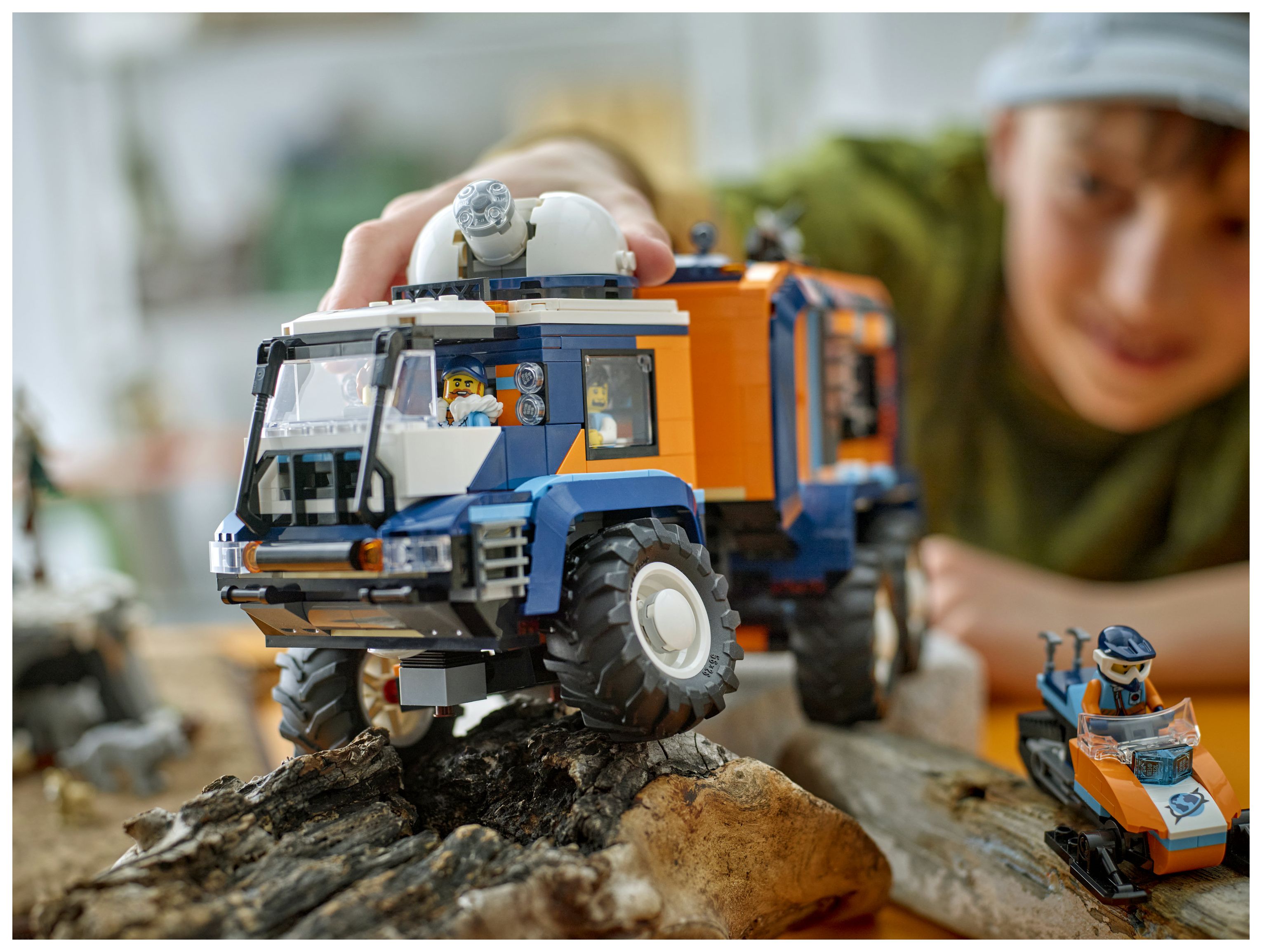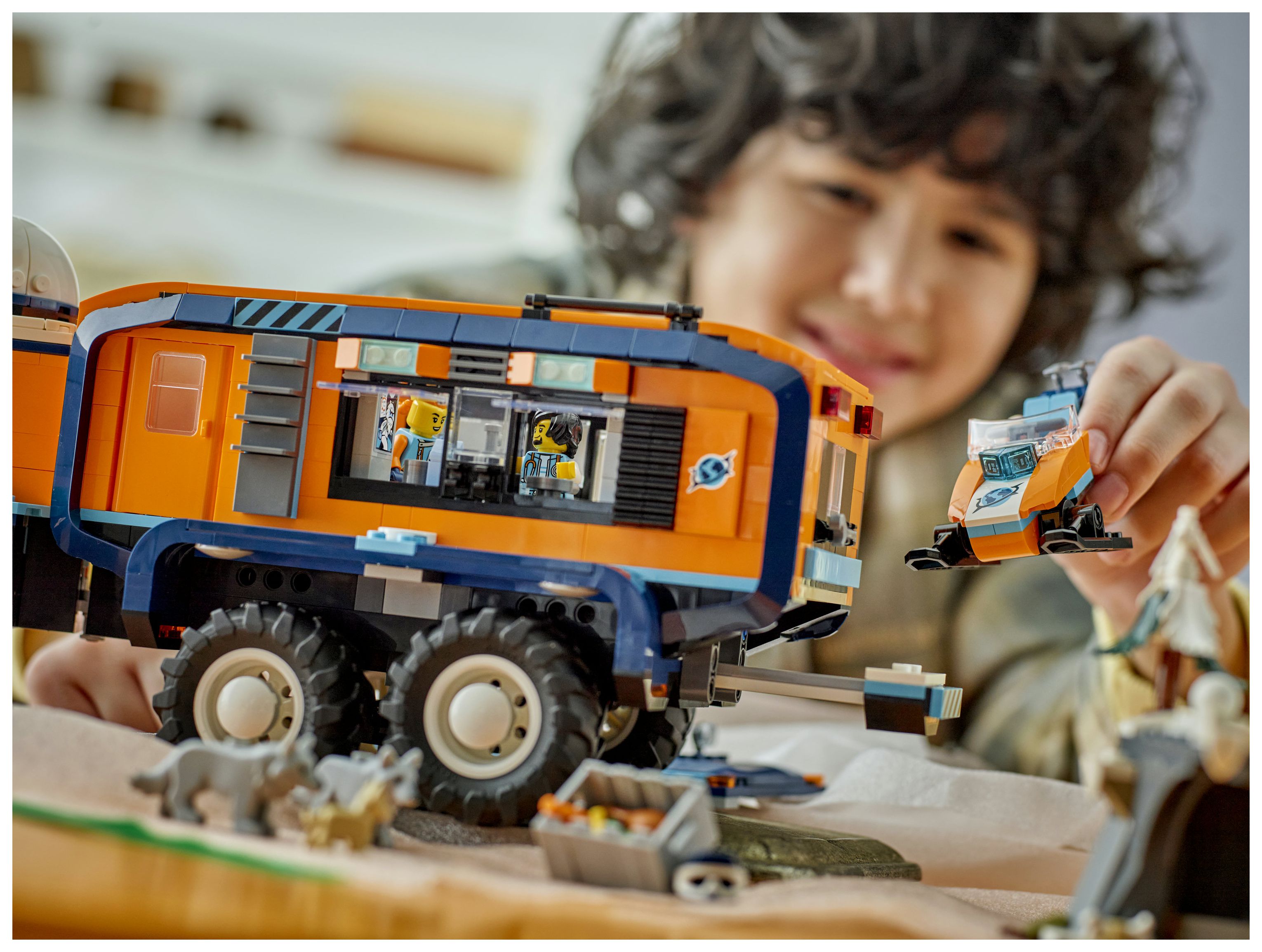 Fantasievolles Spielerlebnis: Kinder können den Arktis-Truck öffnen, um Zugang zur Fahrerkabine, einem Labor und einem Wohnbereich mit Bad, Küche und Schlafzimmer zu erhalten