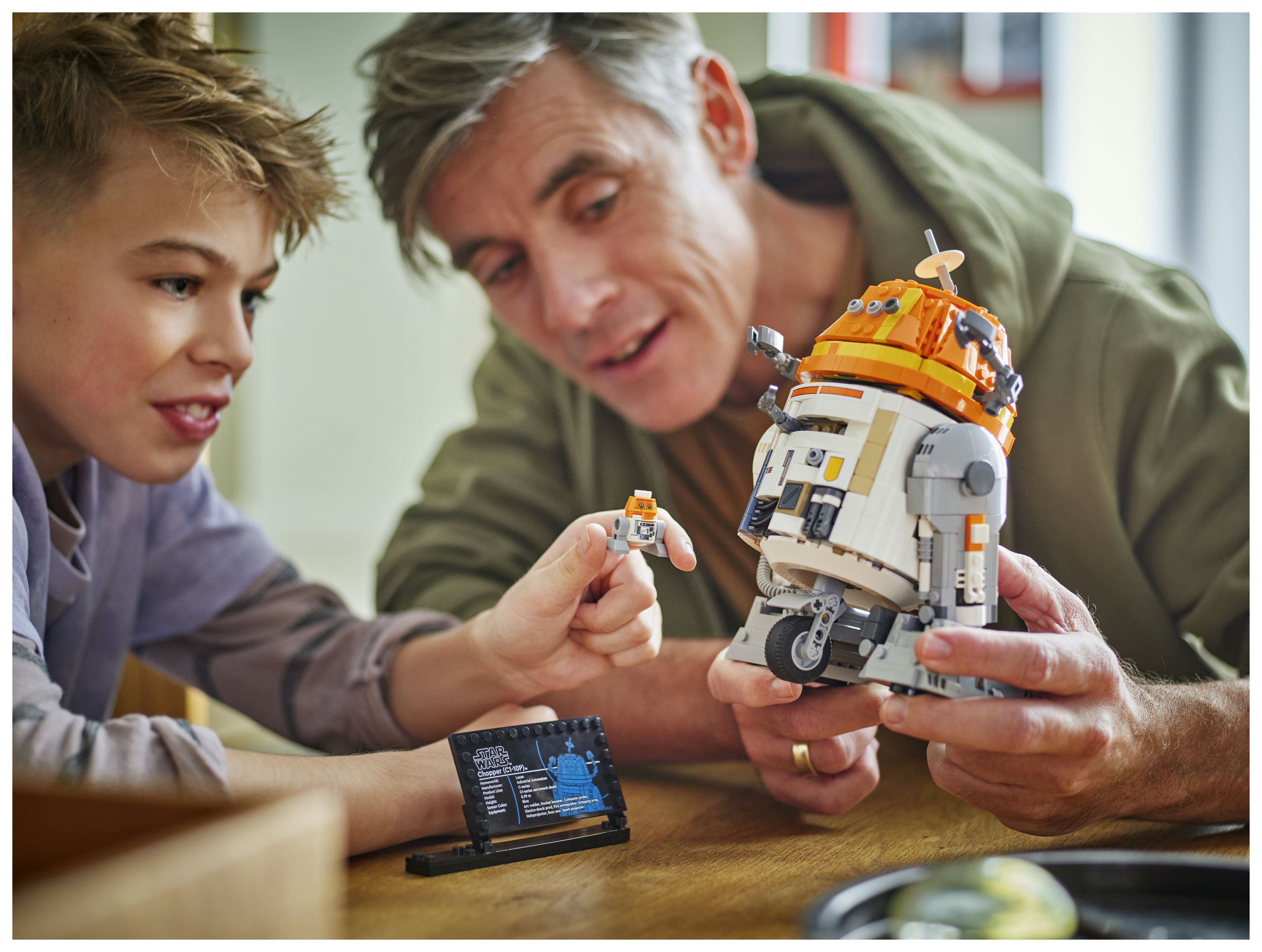 Dieses LEGO Star Wars Set zum Sammeln, Bauen und Ausstellen wird vom LEGO Droiden Chopper in Normalgröße vervollständigt, der neben die Infotafel gestellt werden kann. Schon ist der spektakuläre Blickfang fertig.