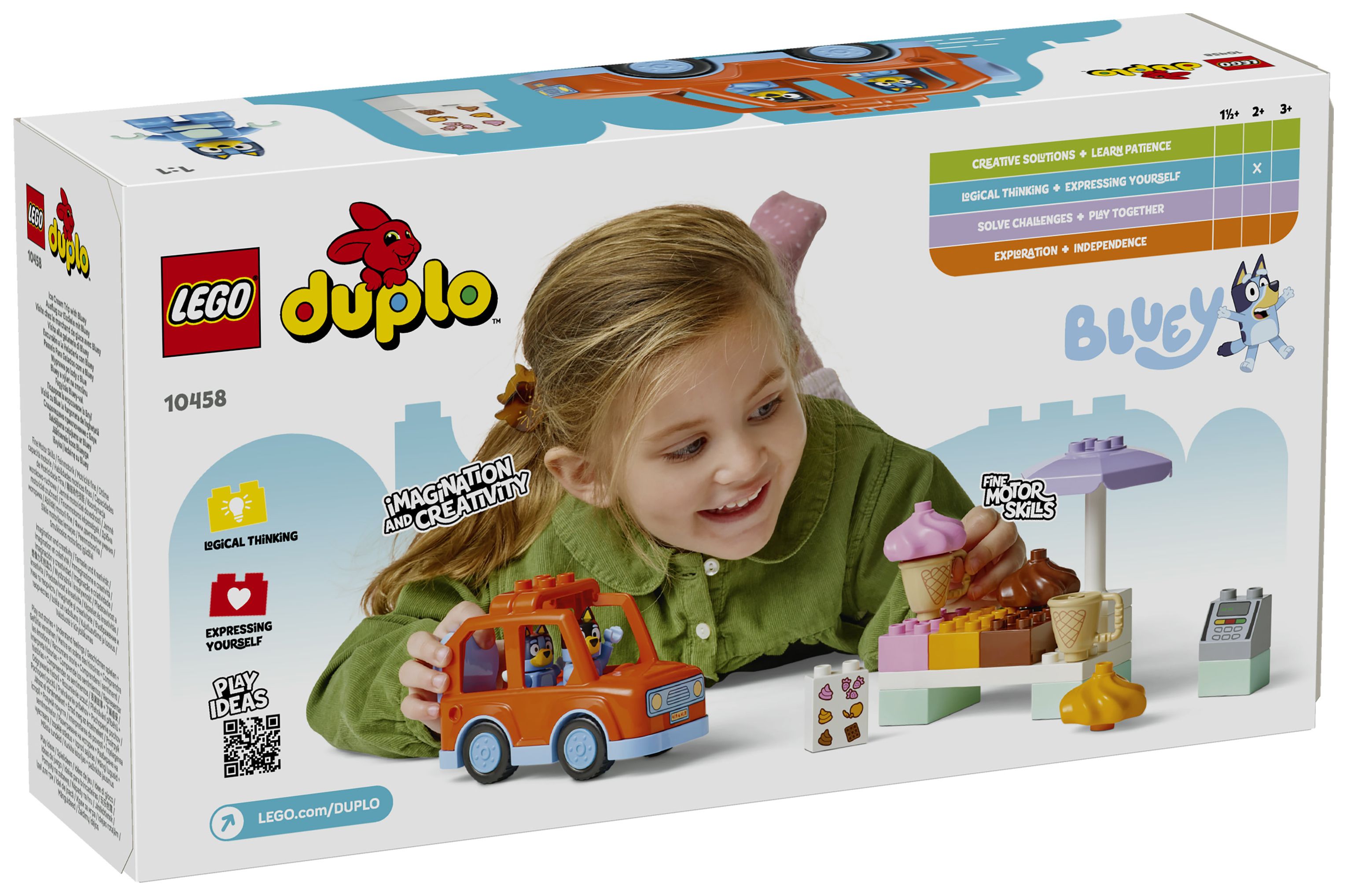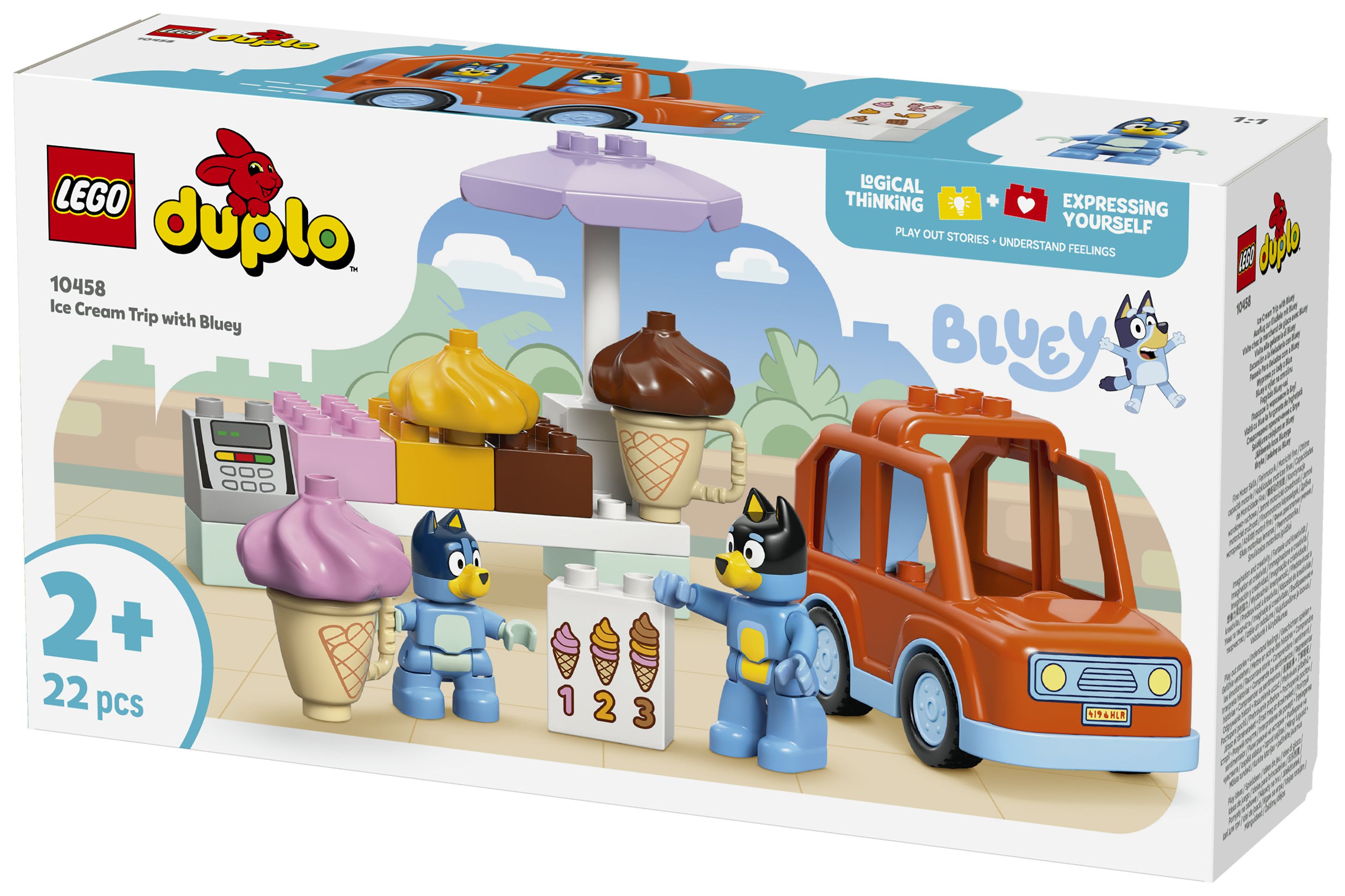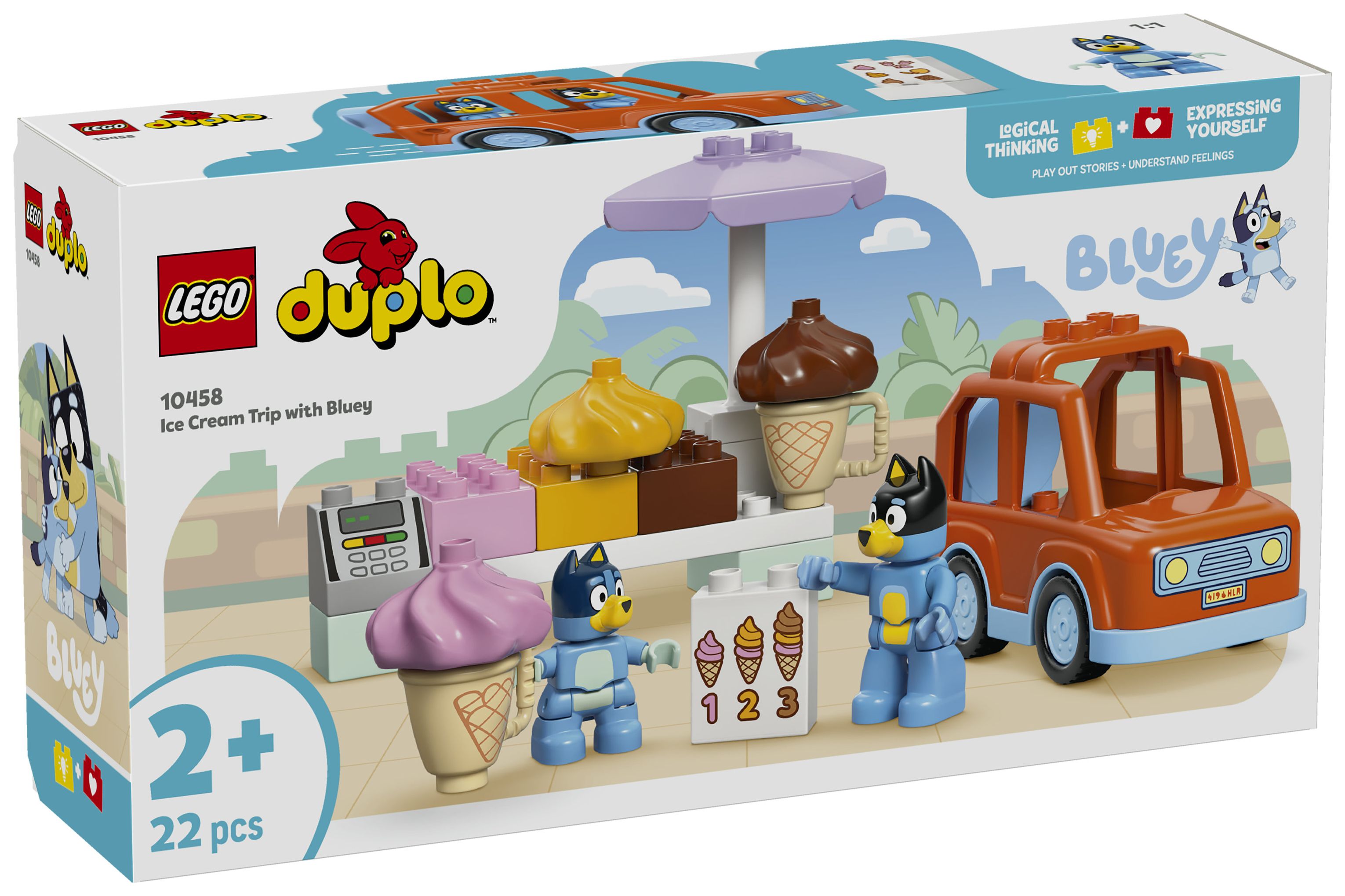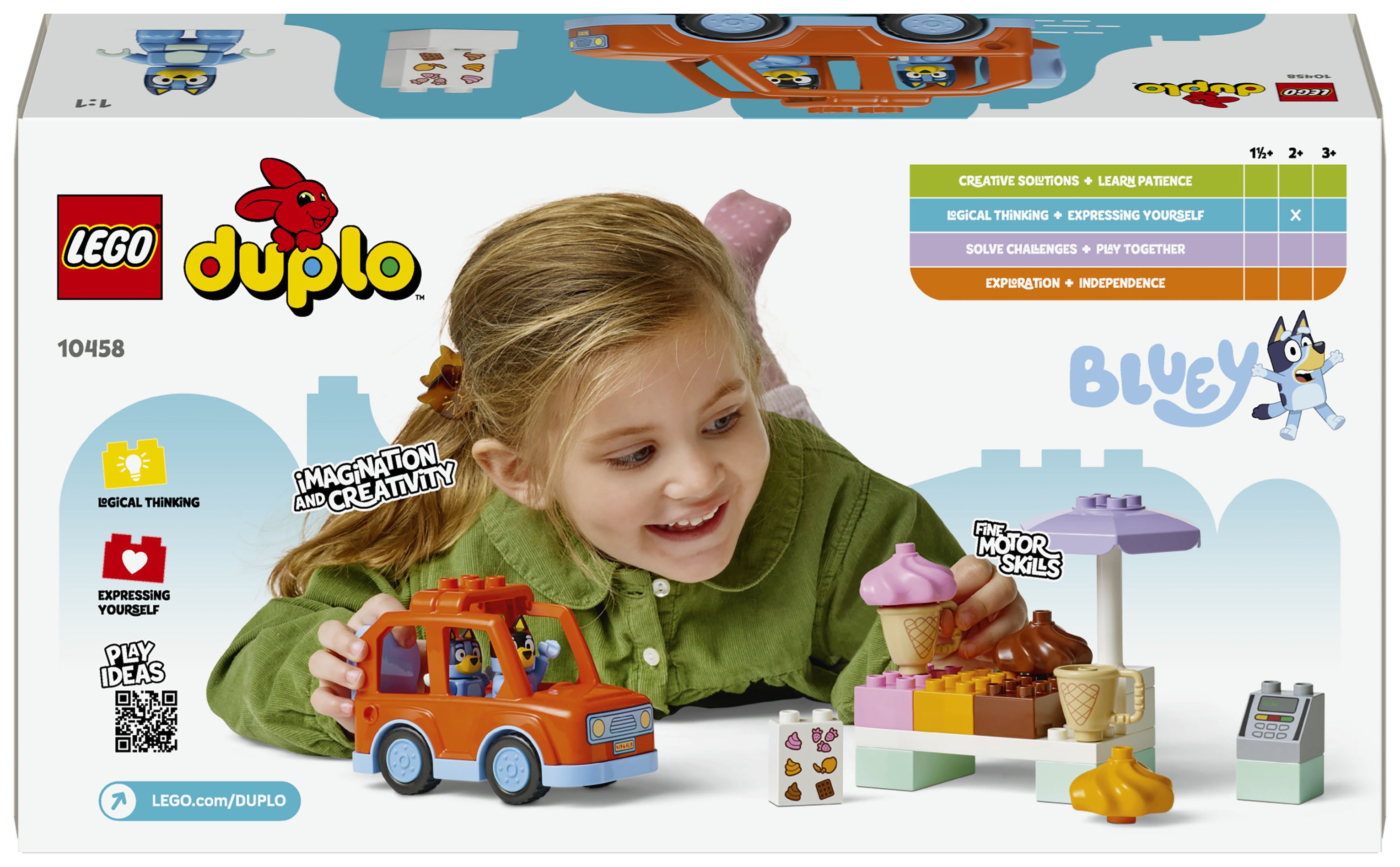 LEGO® DUPLO® Ausflug zur Eisdiele mit Bluey (10458) lädt Vorschulkinder zu faszinierenden Rollenspielen ein. Vorschulkinder genießen ein fantasievolles Spielerlebnis, wenn sie sich mit dem Auto aus diesem Spielset in ein LEGO® DUPLO® Abenteuer stürzen und Szenen aus der TV-Serie Bluey nachstellen.