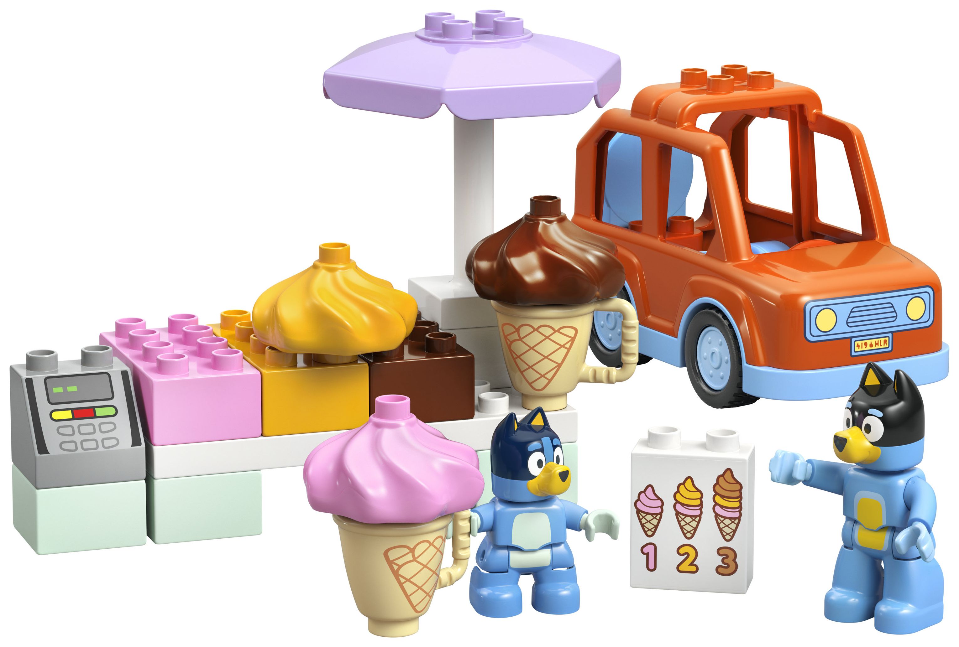 Viele Funktionen für ein fantasievolles Spielerlebnis: Dieses interaktive Spielset beinhaltet den Vater und Bluey, ein fahrbares Spielzeugauto, einen Kreditkartenautomaten, 3 Eisportionierer, 2 Waffeln und eine Eiskarte