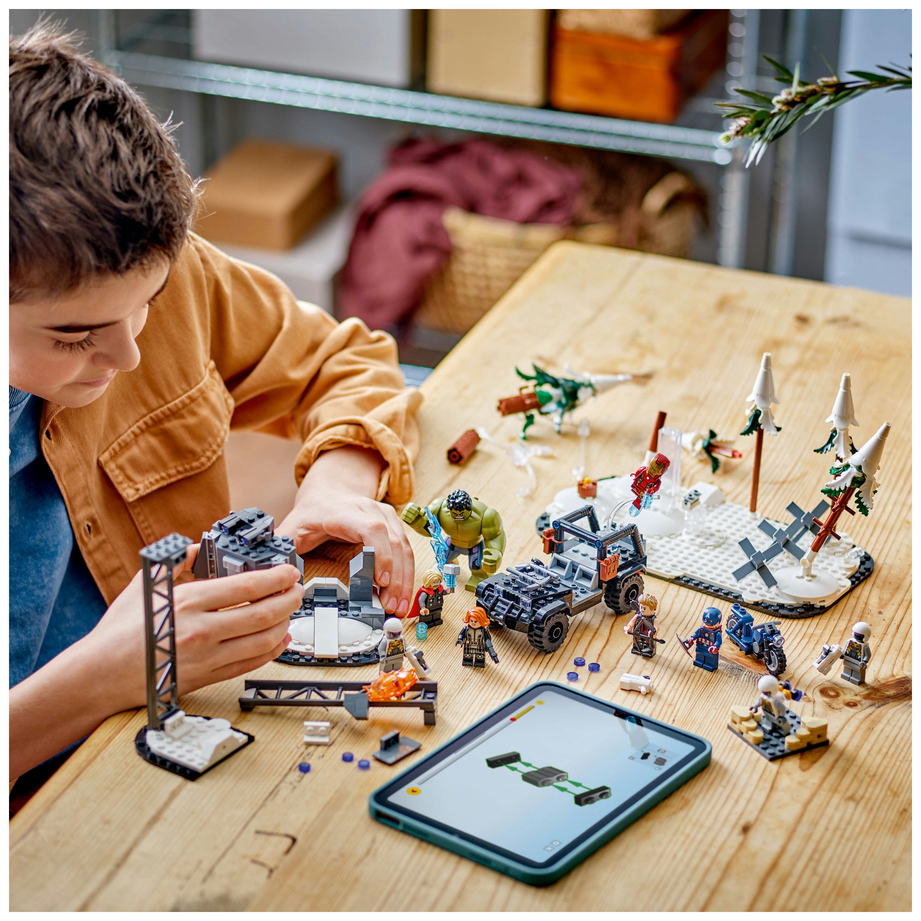 Das Spielset basiert auf dem großen Actionspektakel im Kinohit Avengers: Age of Ultron aus den Marvel Studios. Das vielseitige Bauspielzeug beinhaltet 5 Avengers Minifiguren – Hawkeye, Black Widow, Captain America, Iron Man und Thor – sowie den Hulk als große Figur und 3 HYDRA-Soldaten. Das Set besteht aus 5 Modulen, die man für unzählige Spielmöglichkeiten immer wieder anders anordnen oder zu einem imposanten Hingucker kombinieren kann. Ein Schiebe-Geländewagen und jede Menge Zubehör und Ausrüstung inspirieren zu vielen fantasievollen Rollenspielen. Für zusätzlichen digitalen Bauspaß lässt die intuitive LEGO Builder App Kinder beim Bauen 3D-Modellansichten vergrößern und drehen, ihren Baufortschritt verfolgen und Sets speichern.