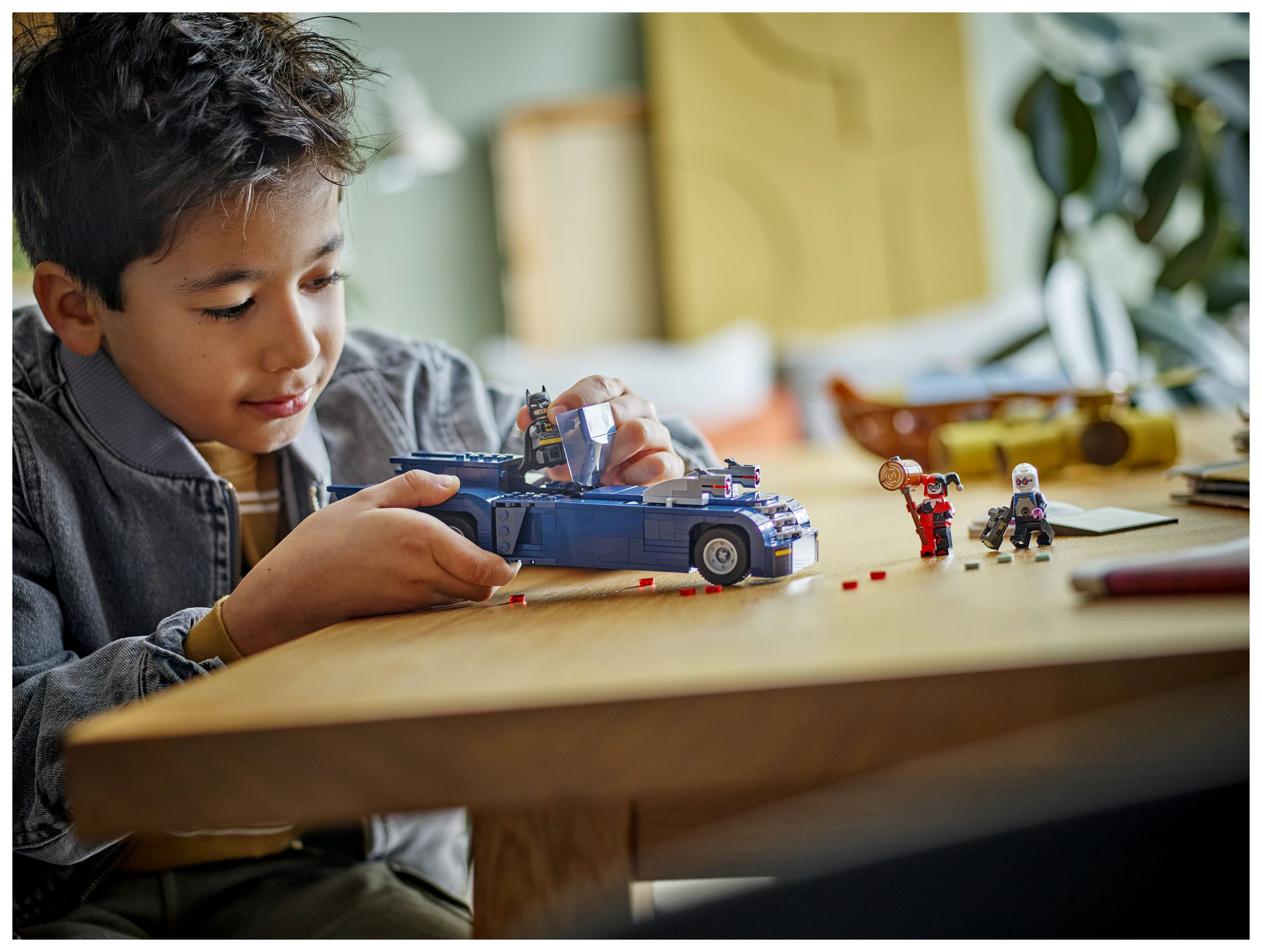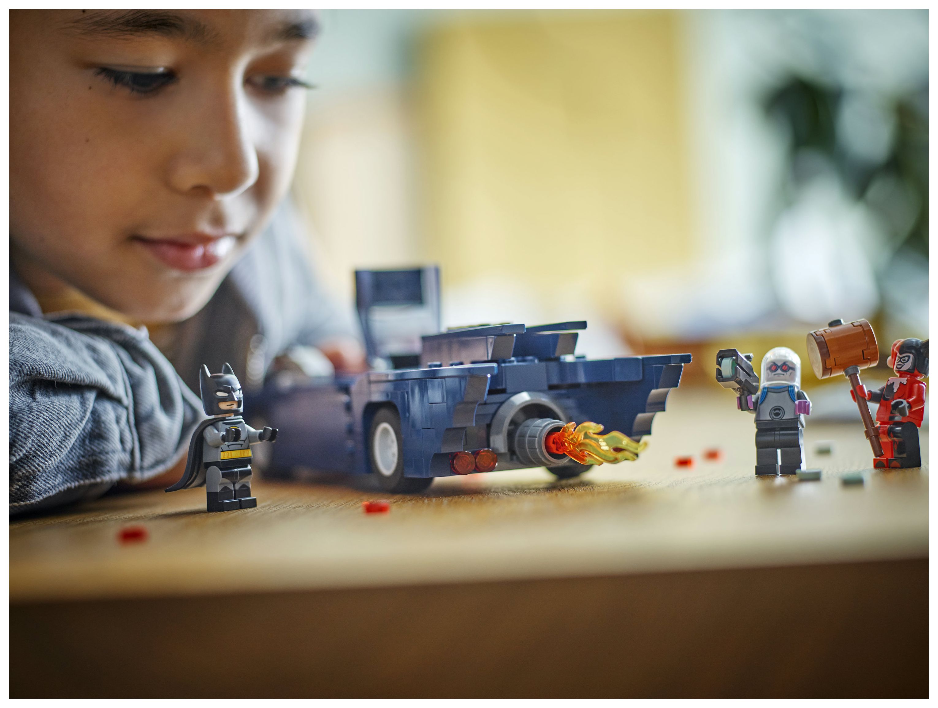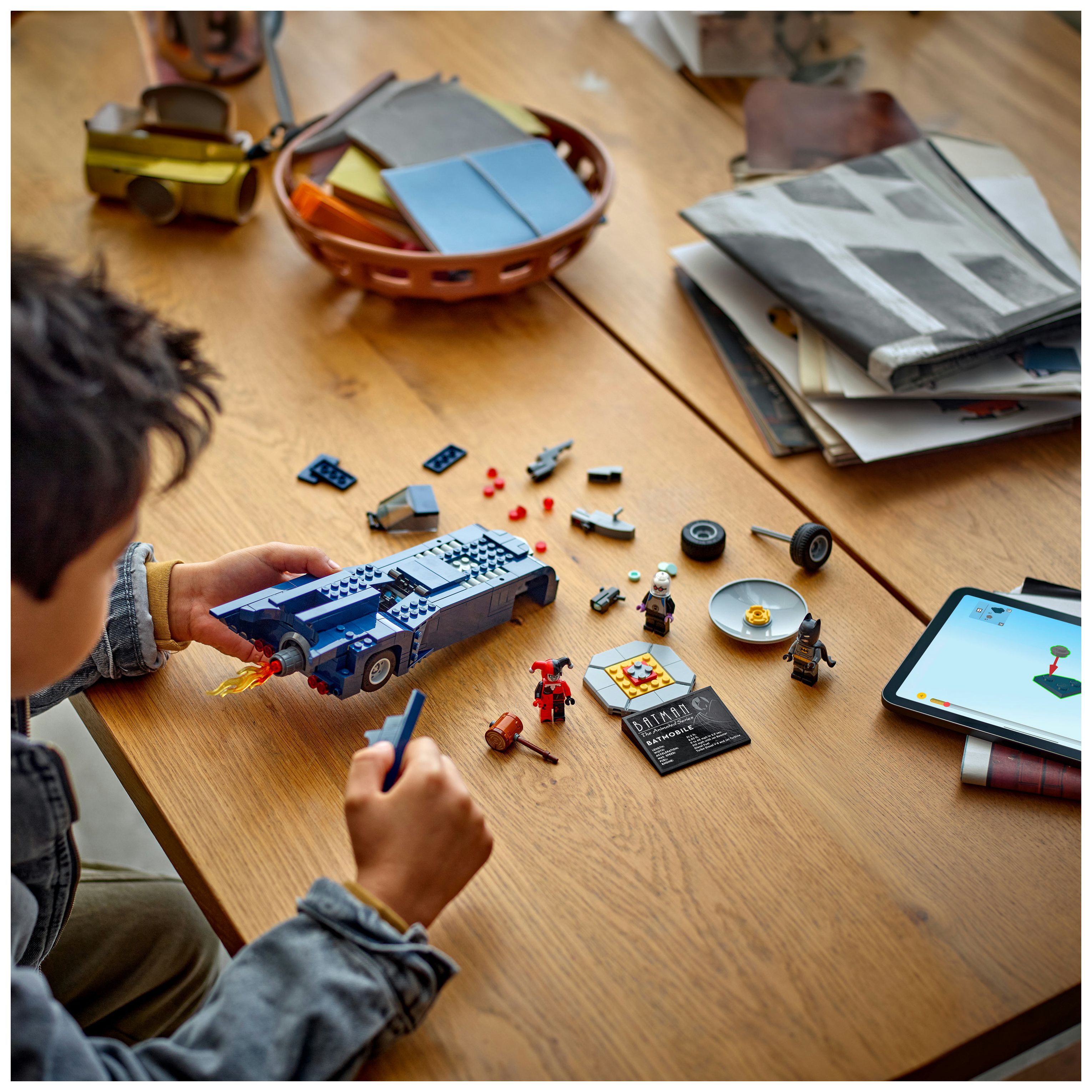 Hauche deinen Superheldenabenteuern mit dem baubaren LEGO® Batmobil und den Minifiguren Batman, Harley Quinn und Mr. Freeze Leben ein. Dieses LEGO Batman-Spielzeugauto hat 2 abnehmbare Katapulte auf der Motorhaube. Unter dem hochklappbaren Cockpitdach befinden sich der Fahrersitz und das Bedienpult. Wenn das Batmobil fährt, dreht sich eine Auspuffflamme. Das Zubehör umfasst einen Hammer, ein Katapult und einen gegossenen Umhang für Batman. Auf dem drehbaren Ständer mit Infoplakette kann man das legendäre LEGO Batmobil aus jedem Winkel bestaunen. Zusätzlichen digitalen Bauspaß bietet die intuitive LEGO Builder App, die Baumeister 3D-Ansichten der Modelle vergrößern und drehen und den Baufortschritt verfolgen lässt. Dieses Set ist ein tolles Geschenk für Kinder, die sich für Batman, Superhelden und coole Fahrzeuge begeistern.