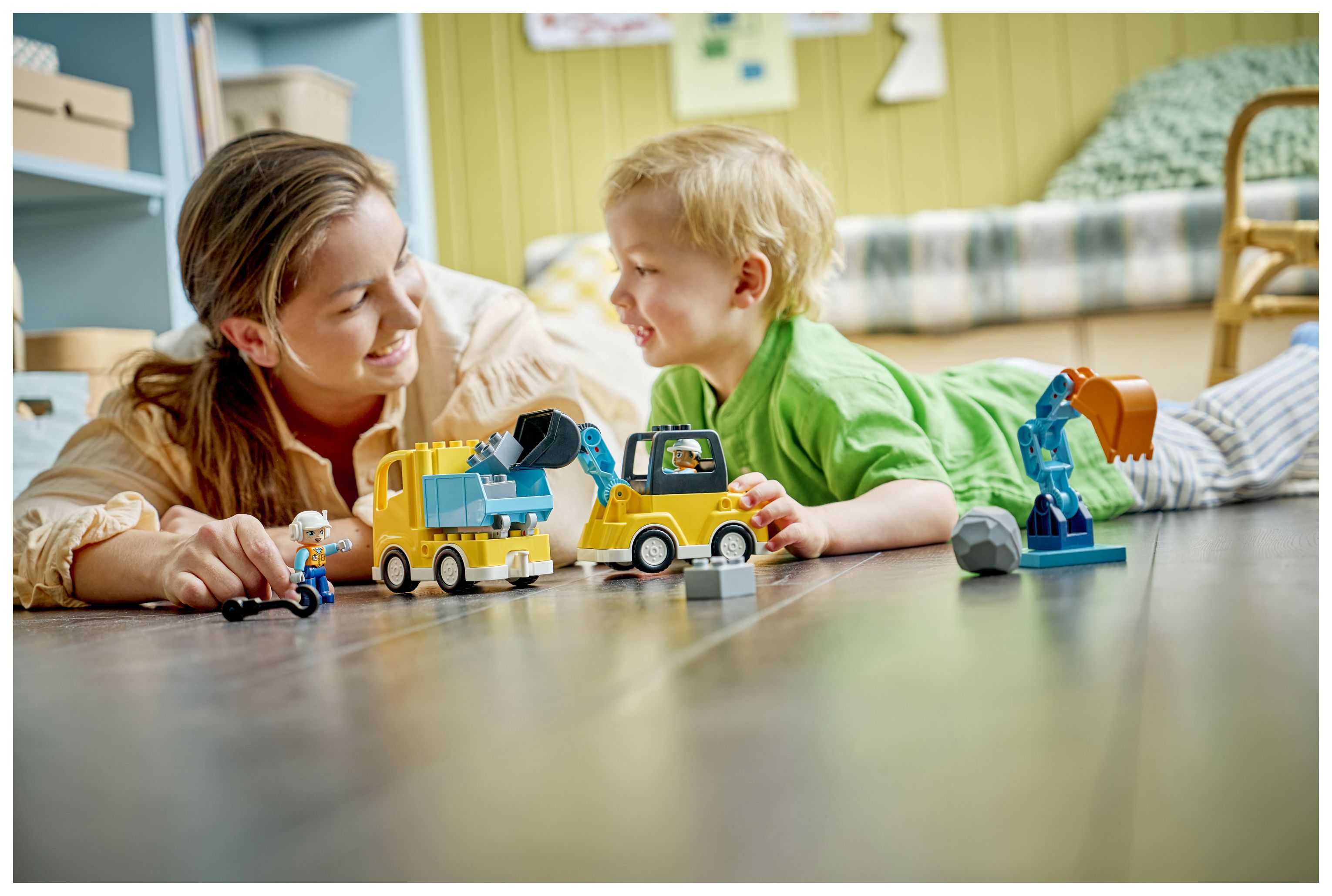 Mit den 22 Bausteinen aus diesem LEGO DUPLO Bauset kann man 3 LKW-Paare bauen: einen Radlader mit Kippschaufel, der Bausteine auf einen Kipplaster schaufelt, einen Bagger und einen Abschleppwagen mit Schwenkarm oder einen LKW mit Scherenhebebühne und einen zweiten Abschleppwagen mit kleinerem Haken für Bausteine. Lass kleine Baufans verschiedene Lösungen ausprobieren, um erfinderische Spielzeuglaster zu bauen. Um all die Probleme zu lösen, brauchen Kleinkinder Kreativität, Beharrlichkeit und Fingerfertigkeit. Zwei Bauarbeiter-Spielzeugfiguren sind ebenfalls enthalten, um die Fahrzeuge zu fahren und zu bedienen.