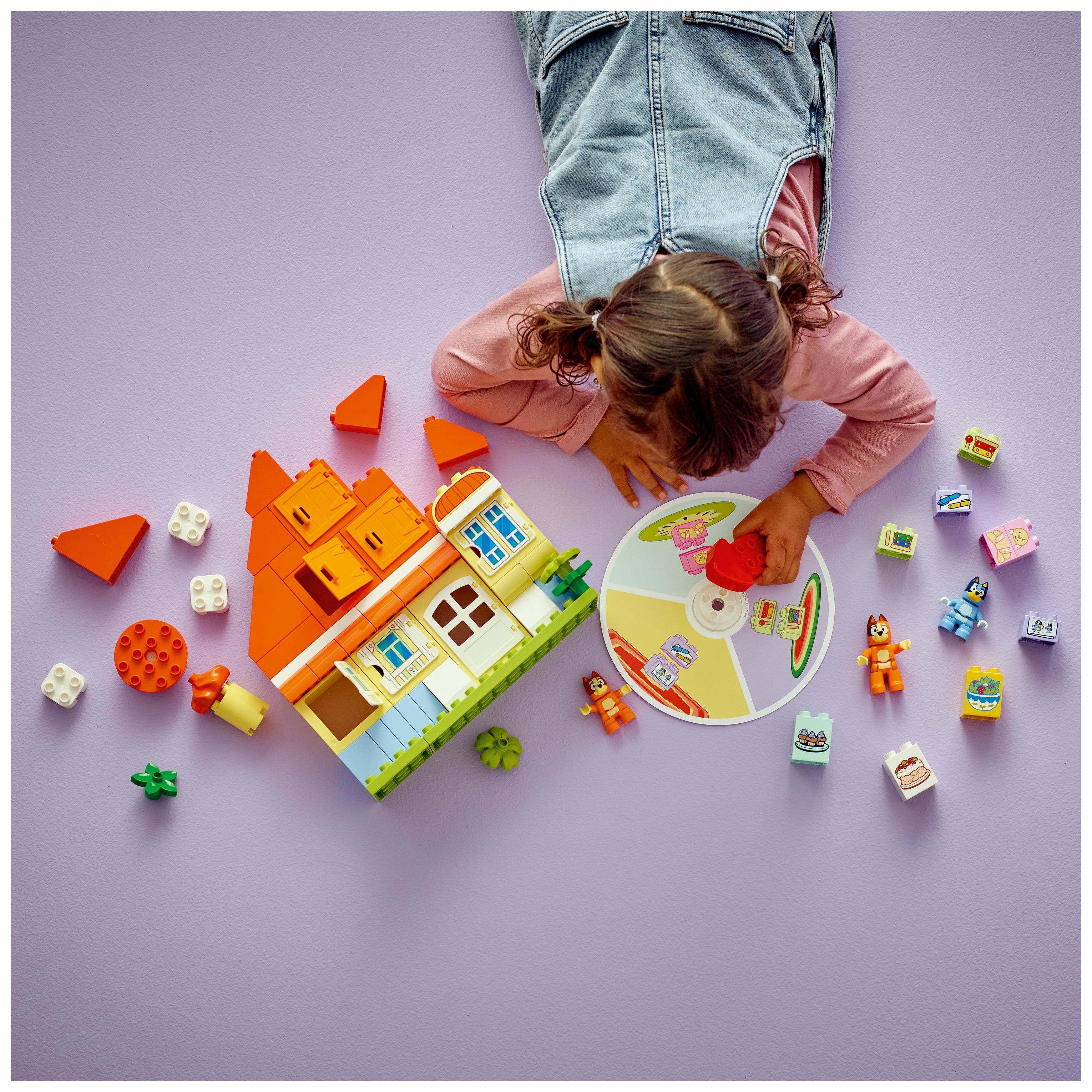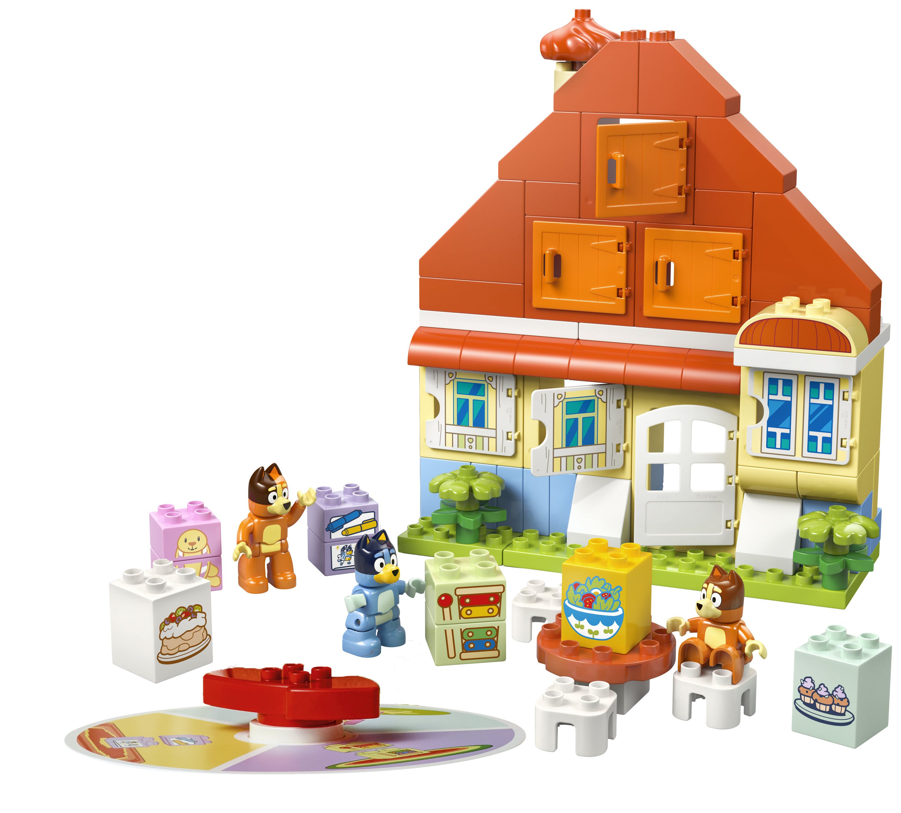 Baubares Spielzeughaus aus der TV-Serie Bluey: Im farbenfrohen Haus der Familie Heeler gibt es Zimmer mit aufklappbaren Fenstern, einen Tisch und 3 Stühle sowie ein „Glücksrad“ mit drehbarem Zeiger