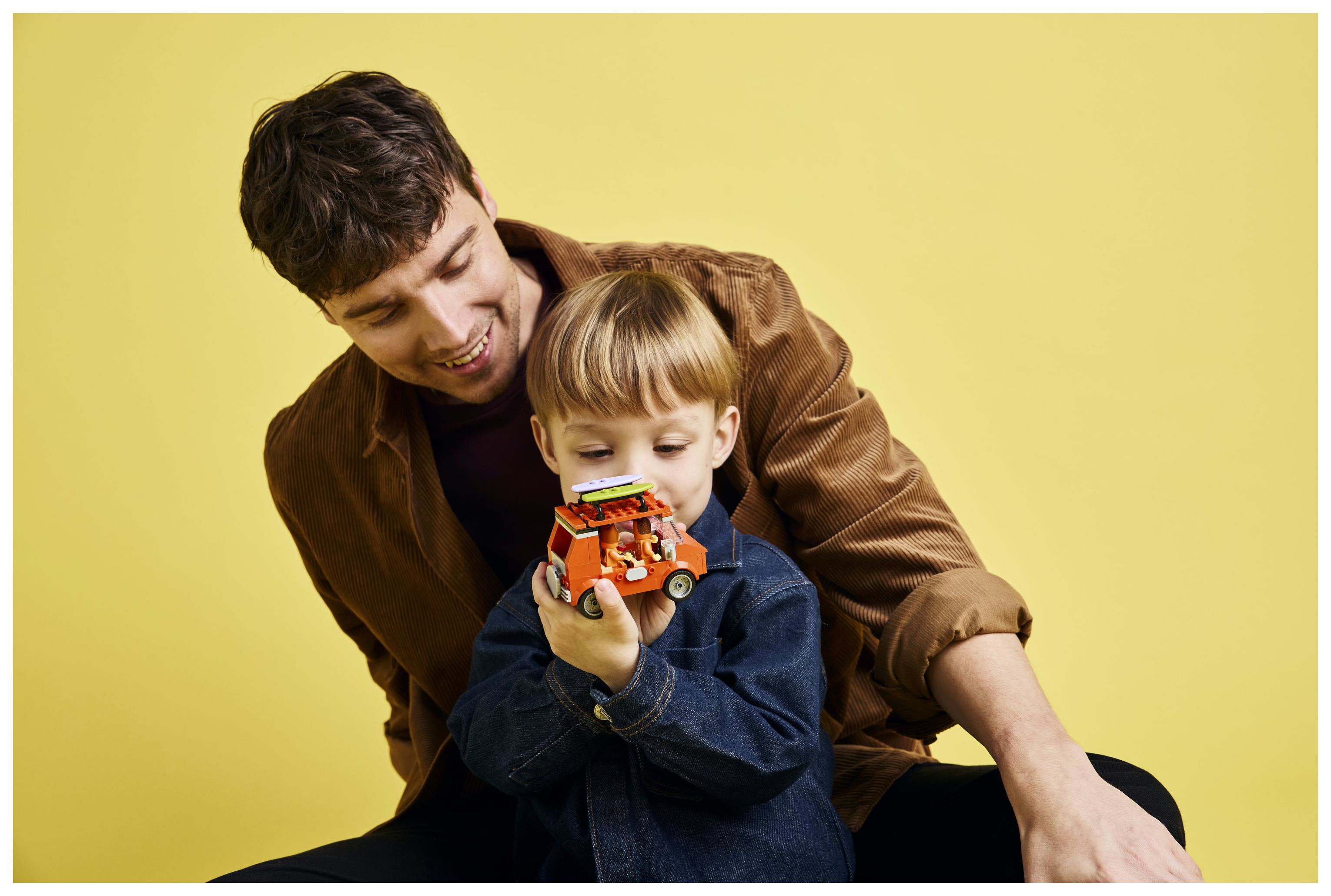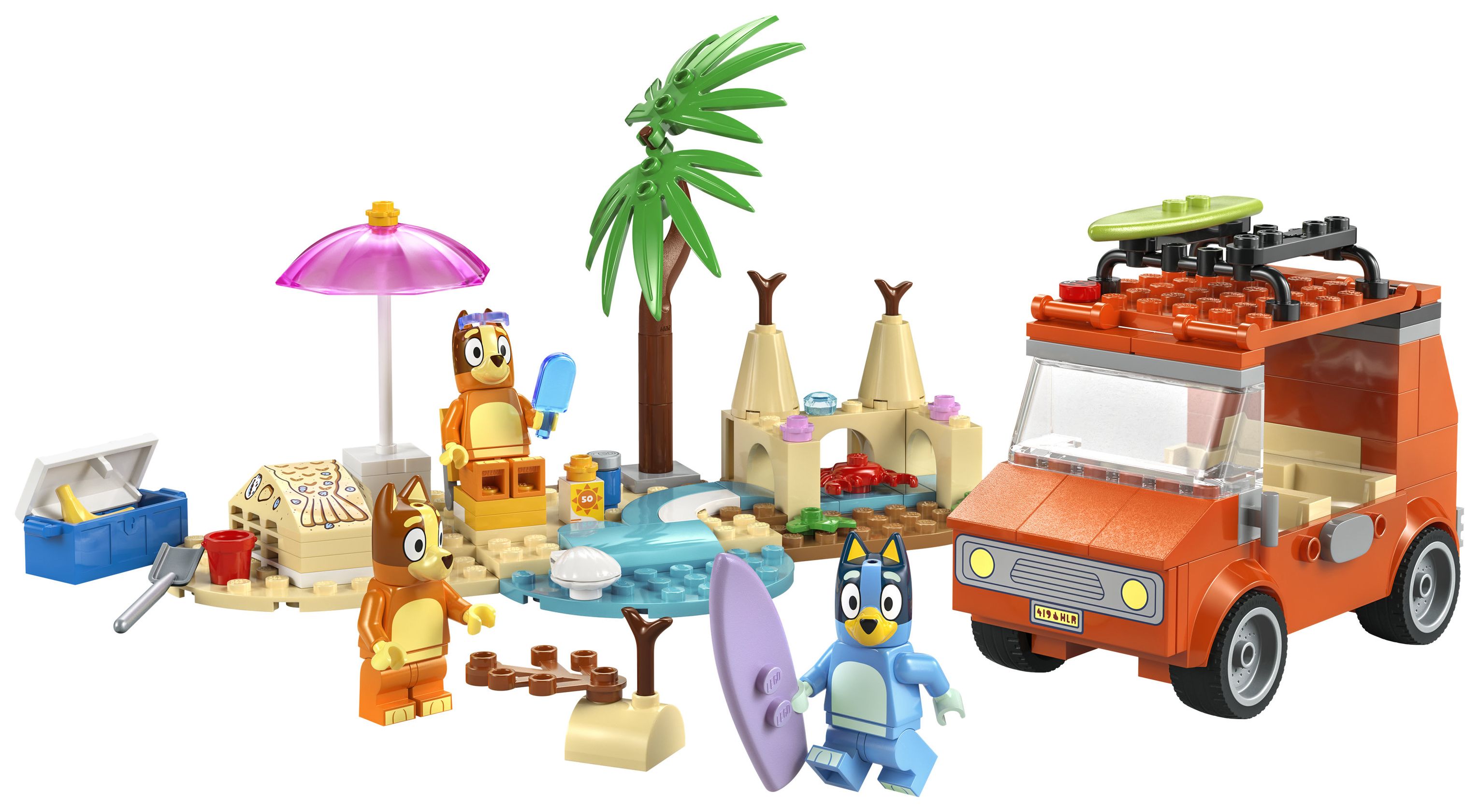 Dieses LEGO® Spielzeug beinhaltet das legendäre Auto aus der TV-Serie Bluey mit 2 Surfbrettern auf dem Dach und einem Kofferraum, in den die Kühlbox passt. Das abnehmbare Dach bietet Zugang zum Innenraum. Dort gibt es Sitze für die Minifiguren Bluey, Bingo und Blueys Mama Chilli. Der Strand inspiriert zu einem fantasievollen Spielerlebnis. Eine imposante Sandburg, ein Meerjungfrauenschwanz aus Sand, ein Liegestuhl, ein Sonnenschirm und eine Palme laden ebenso zum Spielen ein wie eine Krabbe, ein Eis, eine Sonnenbrille und Sonnencreme.