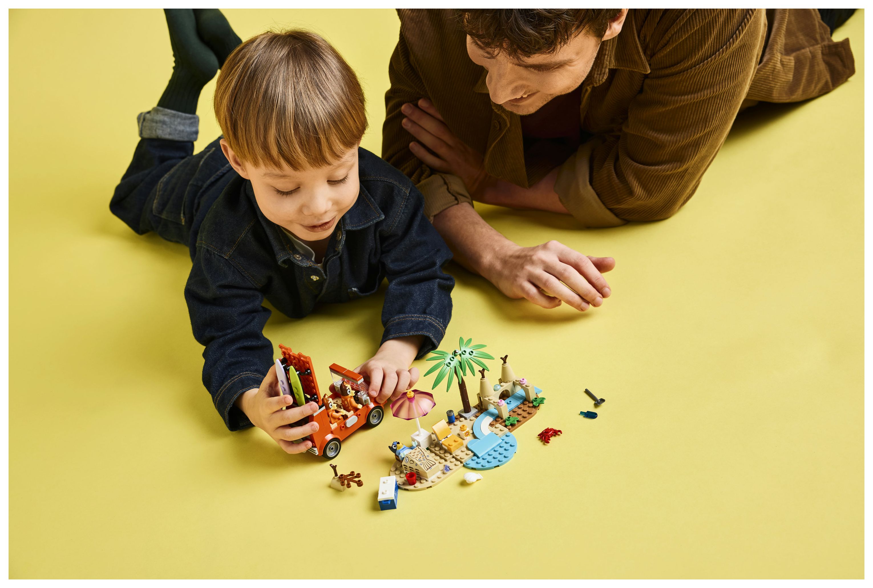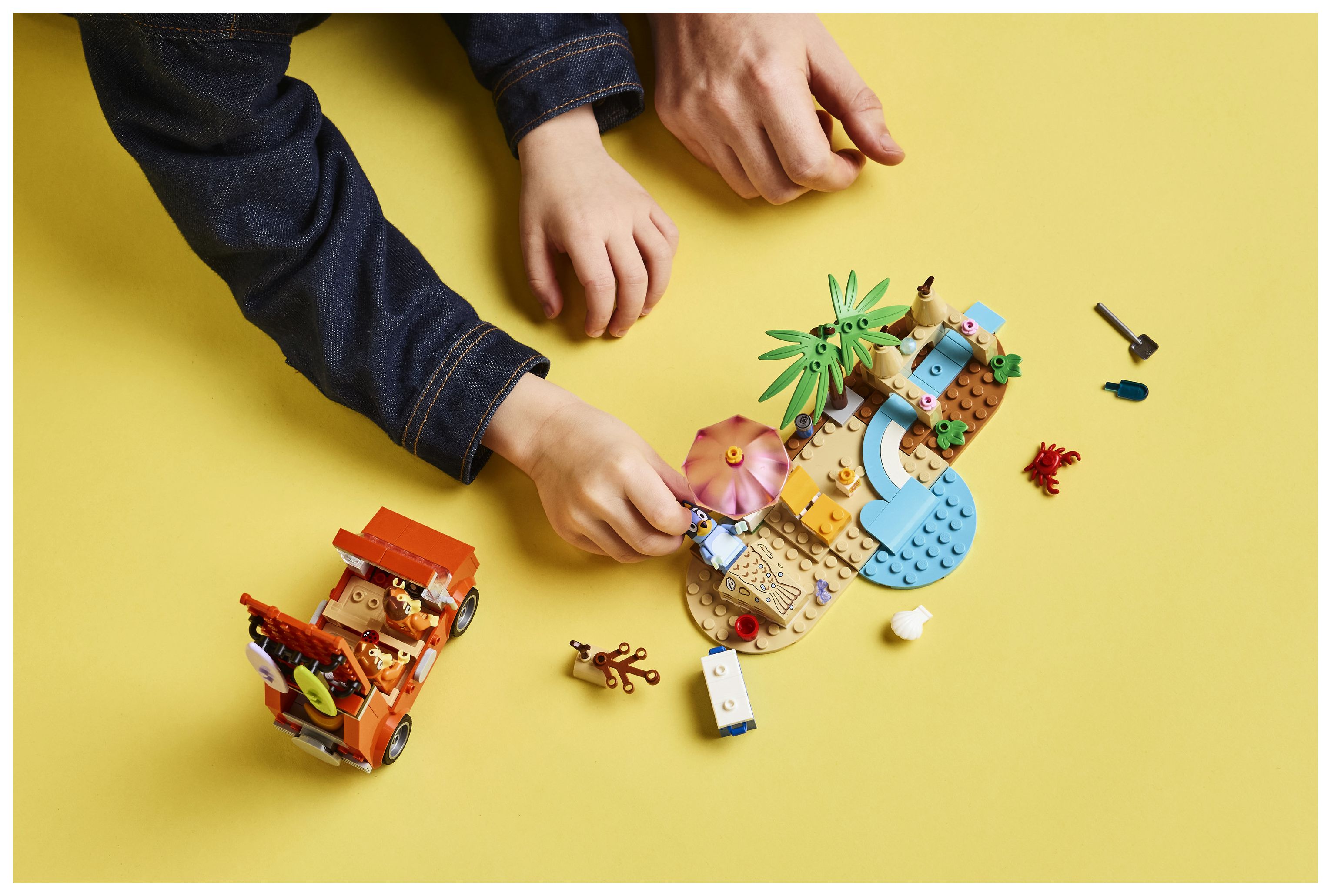 Interaktives Bauspielzeug für Kinder: Dieses faszinierende Spielset beinhaltet LEGO® Minifiguren und ein Spielzeugauto und bietet jede Menge Aktivitäten, um mit Bluey, Bingo und Mum einen tollen Tag am Strand zu verbringen