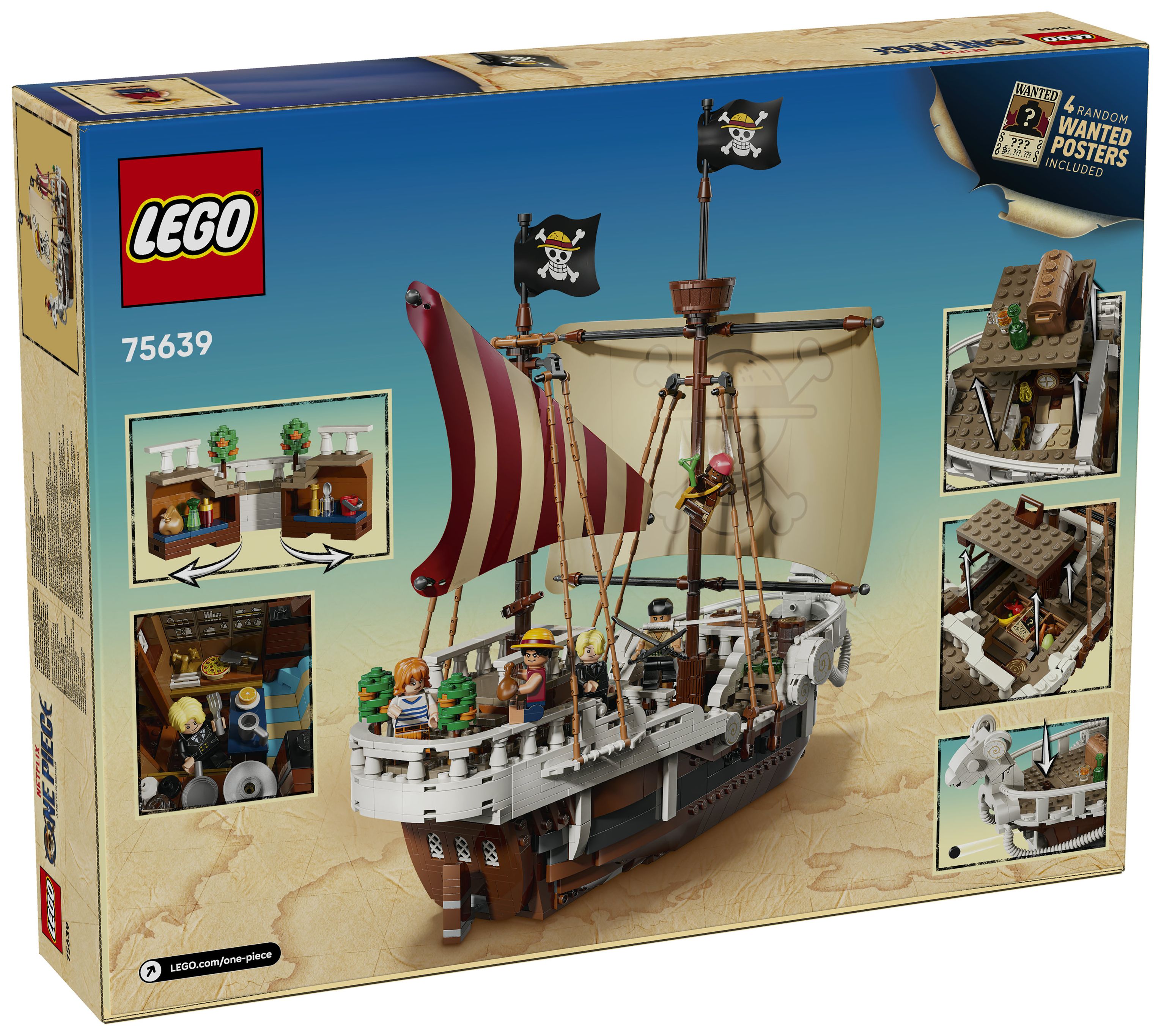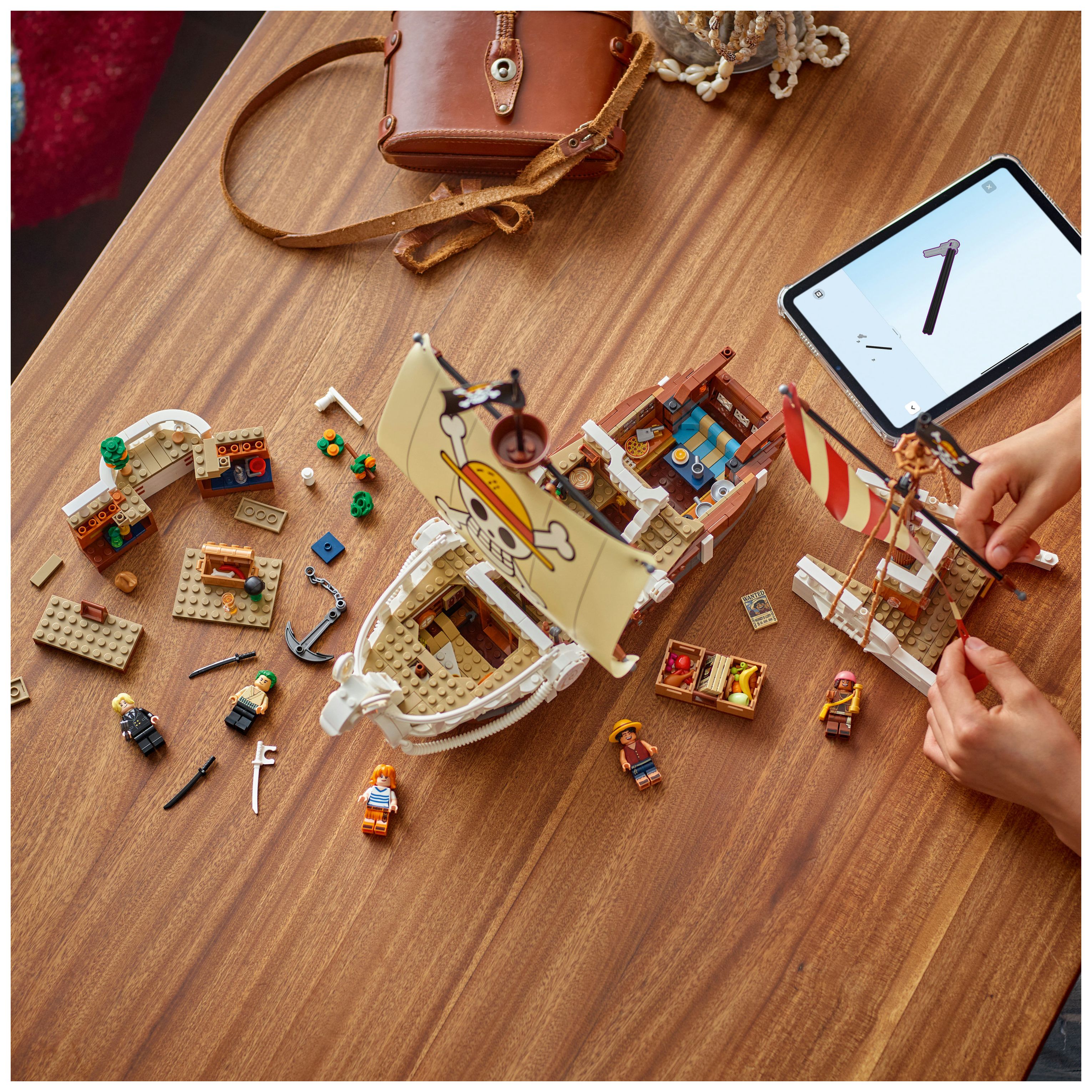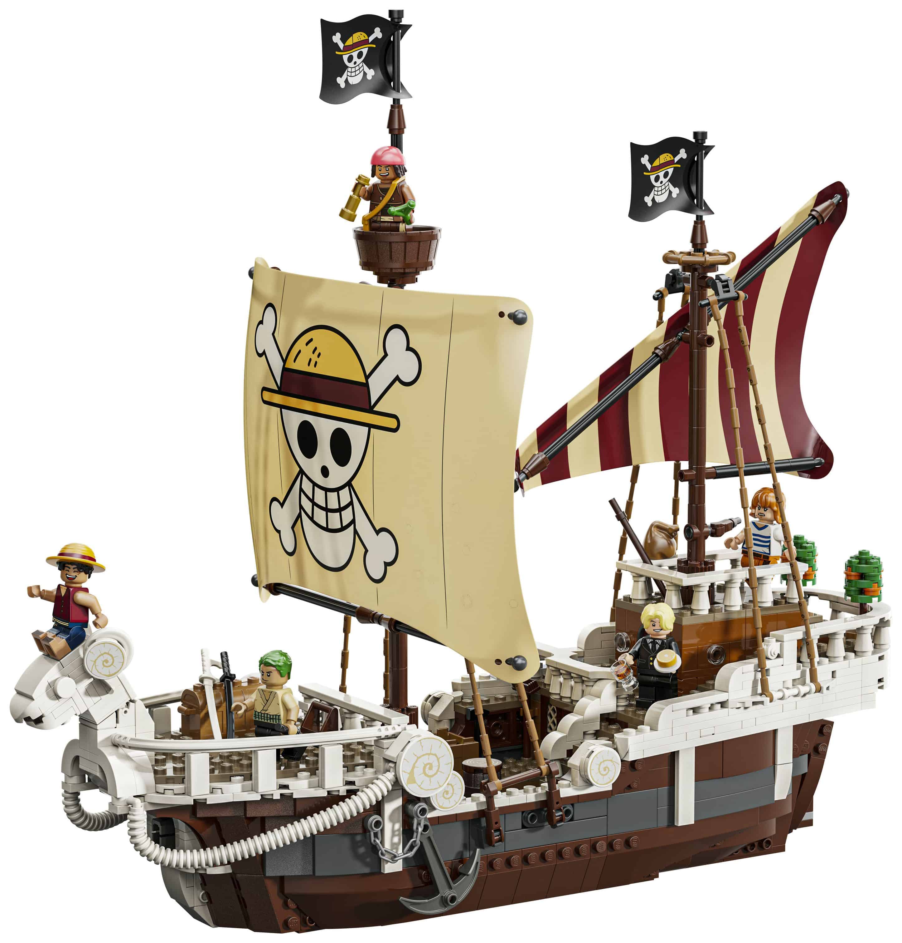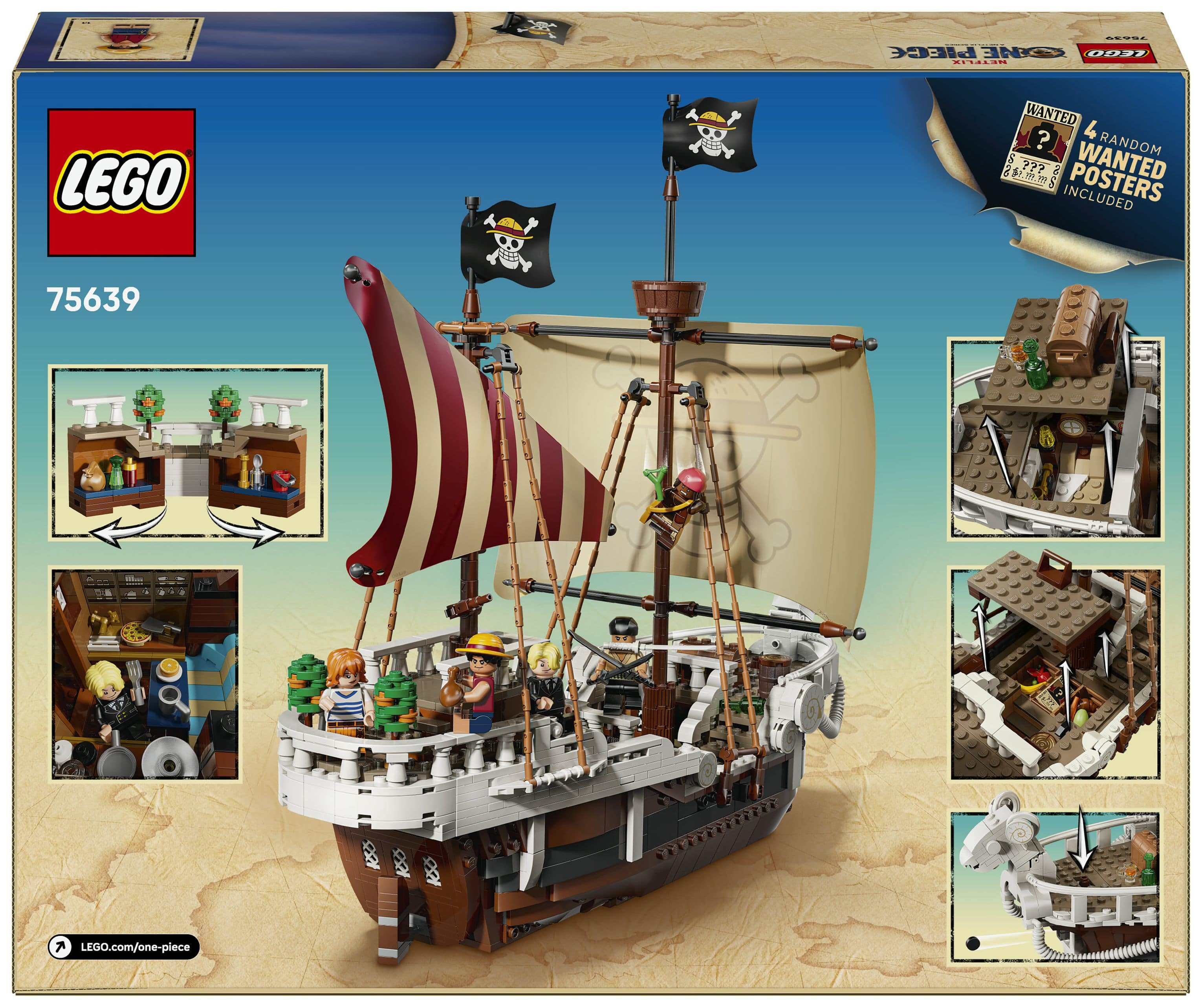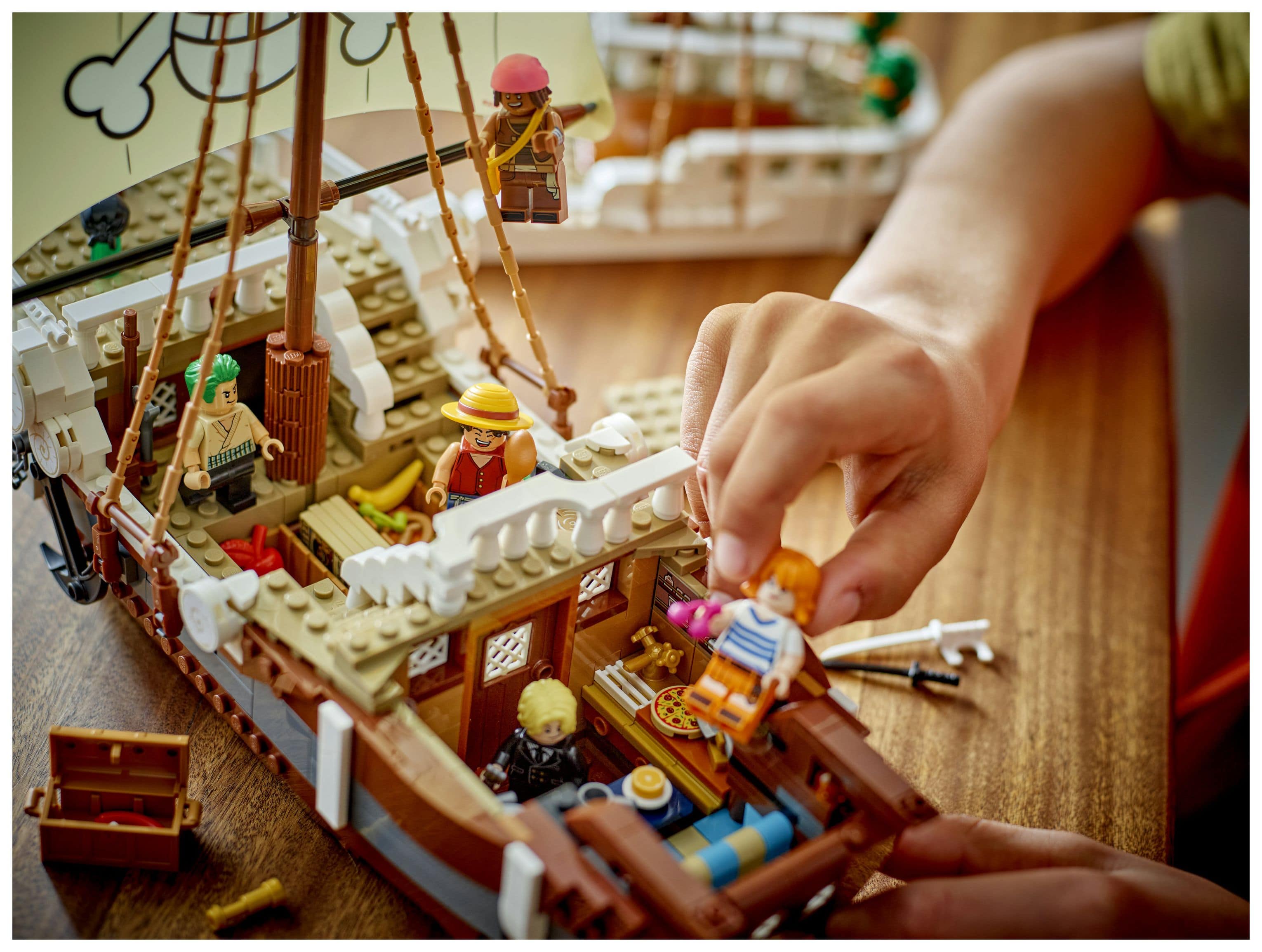 In dem Schiff sind mehrere Räume untergebracht: eine Kabine für die Crew, eine Kombüse, ein Lagerraum und eine Werkstatt. Zu dem Modell gehören auch 5 LEGO ONE PIECE Minifiguren. Ruffy sitzt über einer Kanone auf der Schaf-Galionsfigur am Bug. Zorro relaxt und trainiert auf dem Deck. Nami steht am Steuer am Heck, wo ihre geliebten Mandarinenbäume auf dem Deck wachsen. Lysop klettert die Masten hinauf und hält im Ausguck Ausschau nach anderen Schiffen. Und Sanji trägt Töpfe in die Kombüse hinunter. Auch 4 Steckbriefe liegen bei. In der LEGO Builder App können Kinder 3D-Ansichten der Modelle vergrößern und drehen und ihren Baufortschritt verfolgen. Das Set besteht aus 1.376 Teilen.