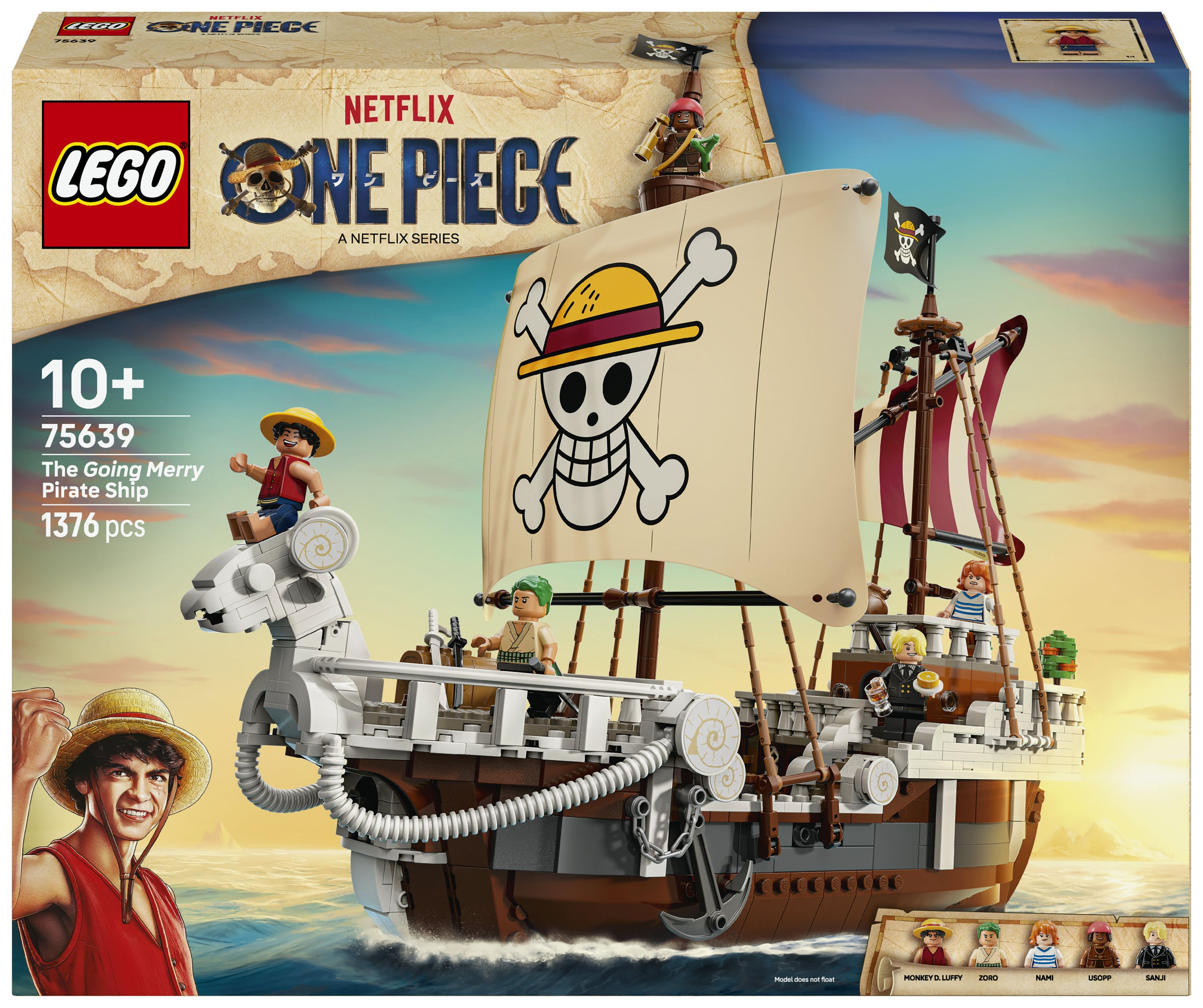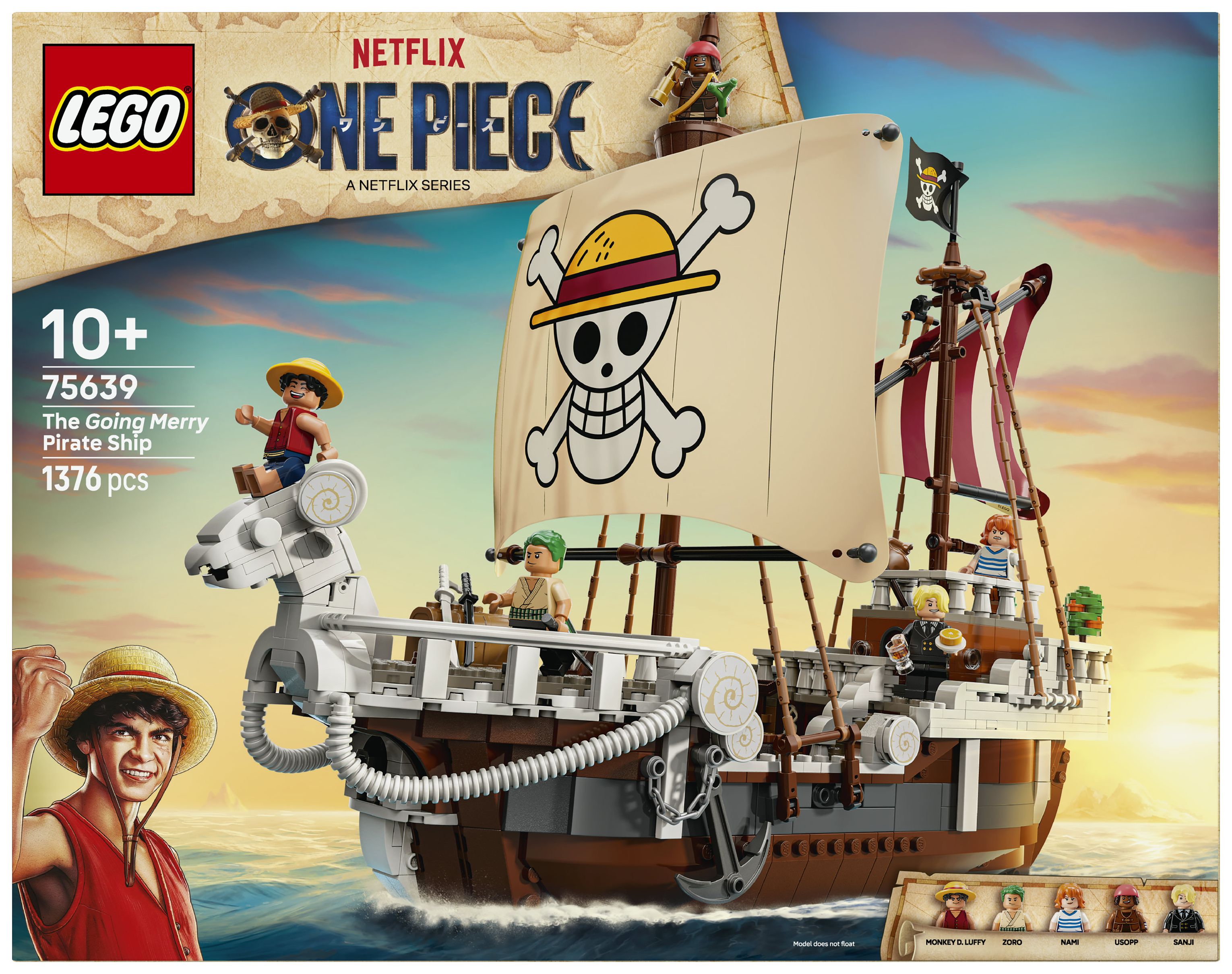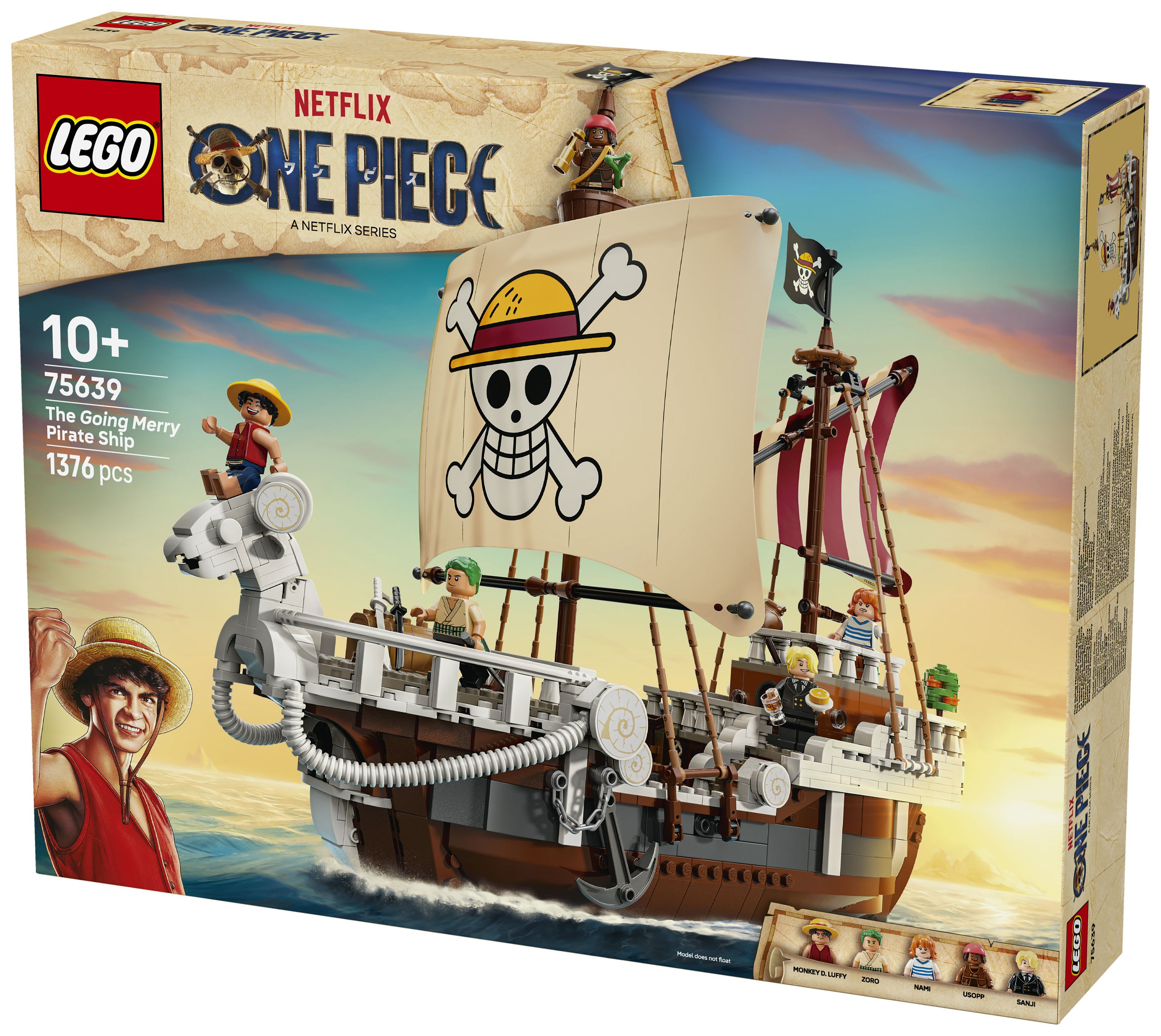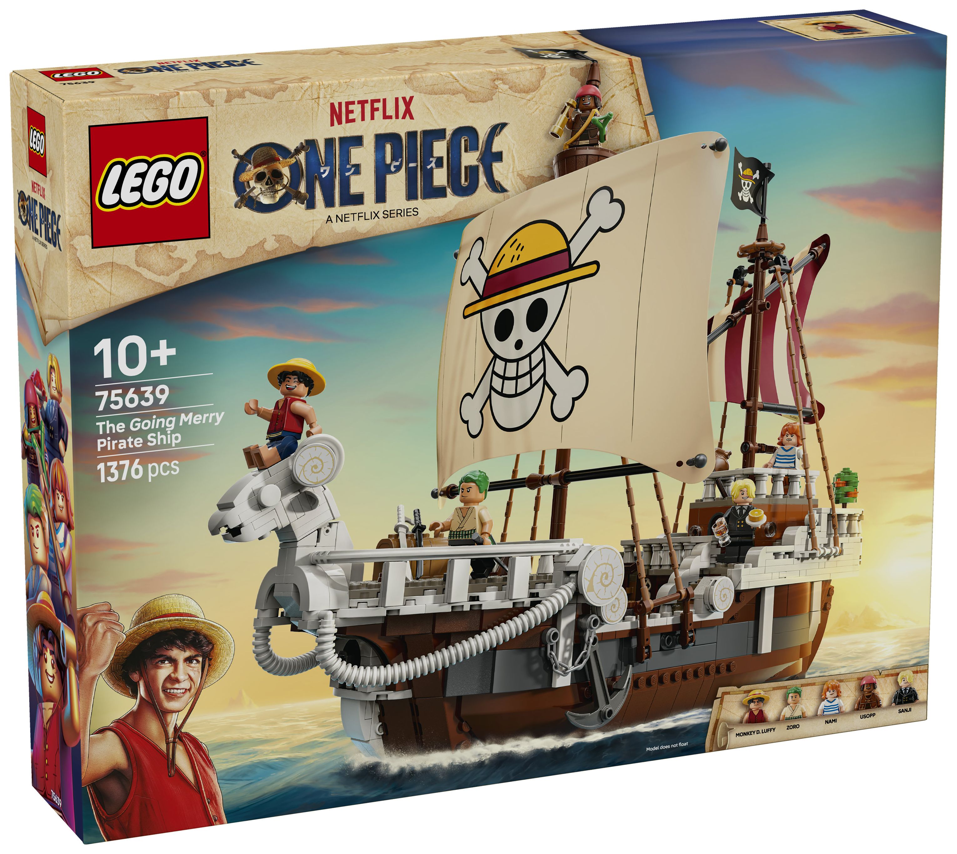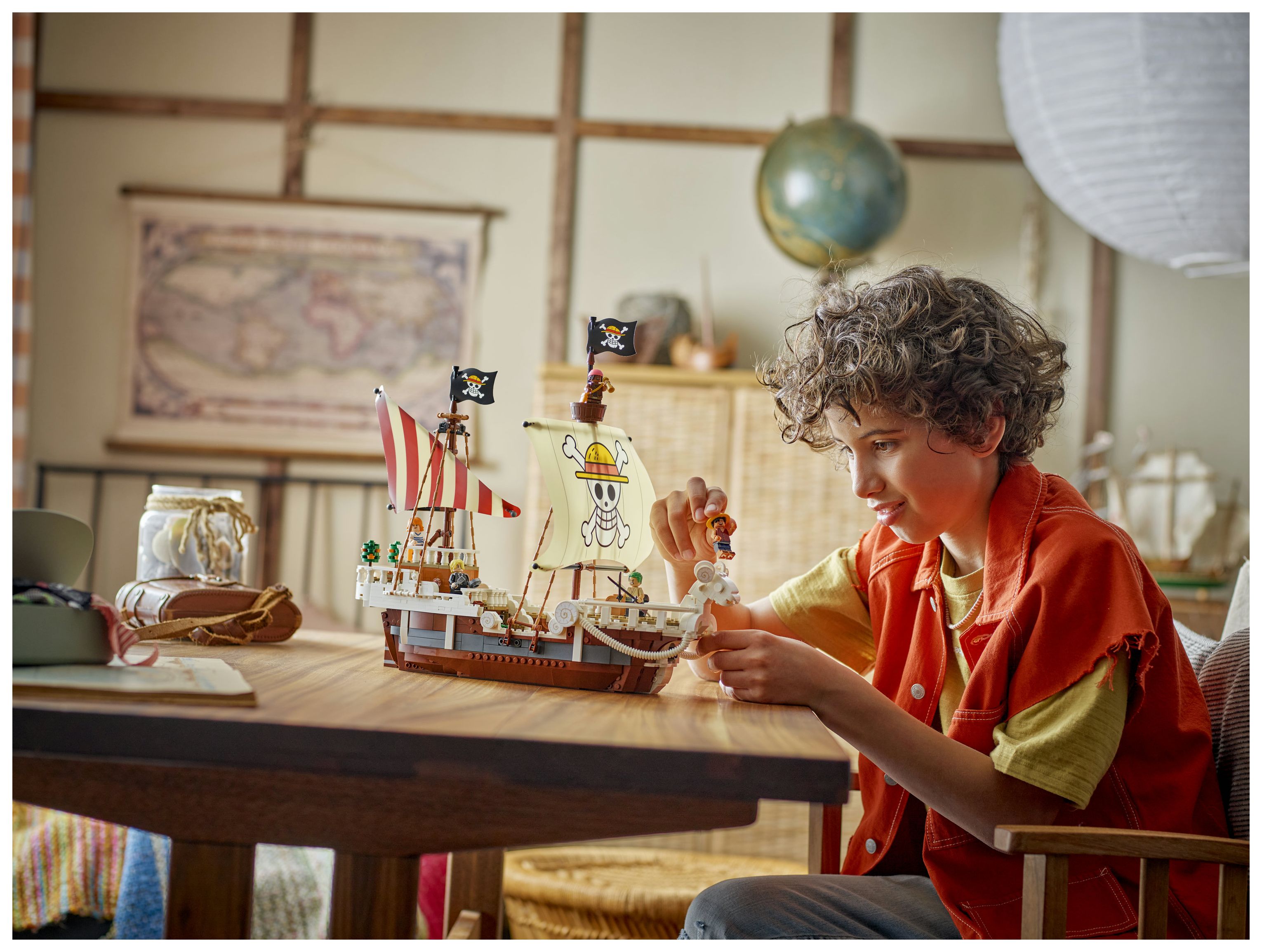 In dem Schiff sind mehrere Räume untergebracht: eine Kabine für die Crew, eine Kombüse, ein Lagerraum und eine Werkstatt. Zu dem Modell gehören auch 5 LEGO ONE PIECE Minifiguren. Ruffy sitzt über einer Kanone auf der Schaf-Galionsfigur am Bug. Zorro relaxt und trainiert auf dem Deck. Nami steht am Steuer am Heck, wo ihre geliebten Mandarinenbäume auf dem Deck wachsen. Lysop klettert die Masten hinauf und hält im Ausguck Ausschau nach anderen Schiffen. Und Sanji trägt Töpfe in die Kombüse hinunter. Auch 4 Steckbriefe liegen bei. In der LEGO Builder App können Kinder 3D-Ansichten der Modelle vergrößern und drehen und ihren Baufortschritt verfolgen. Das Set besteht aus 1.376 Teilen.