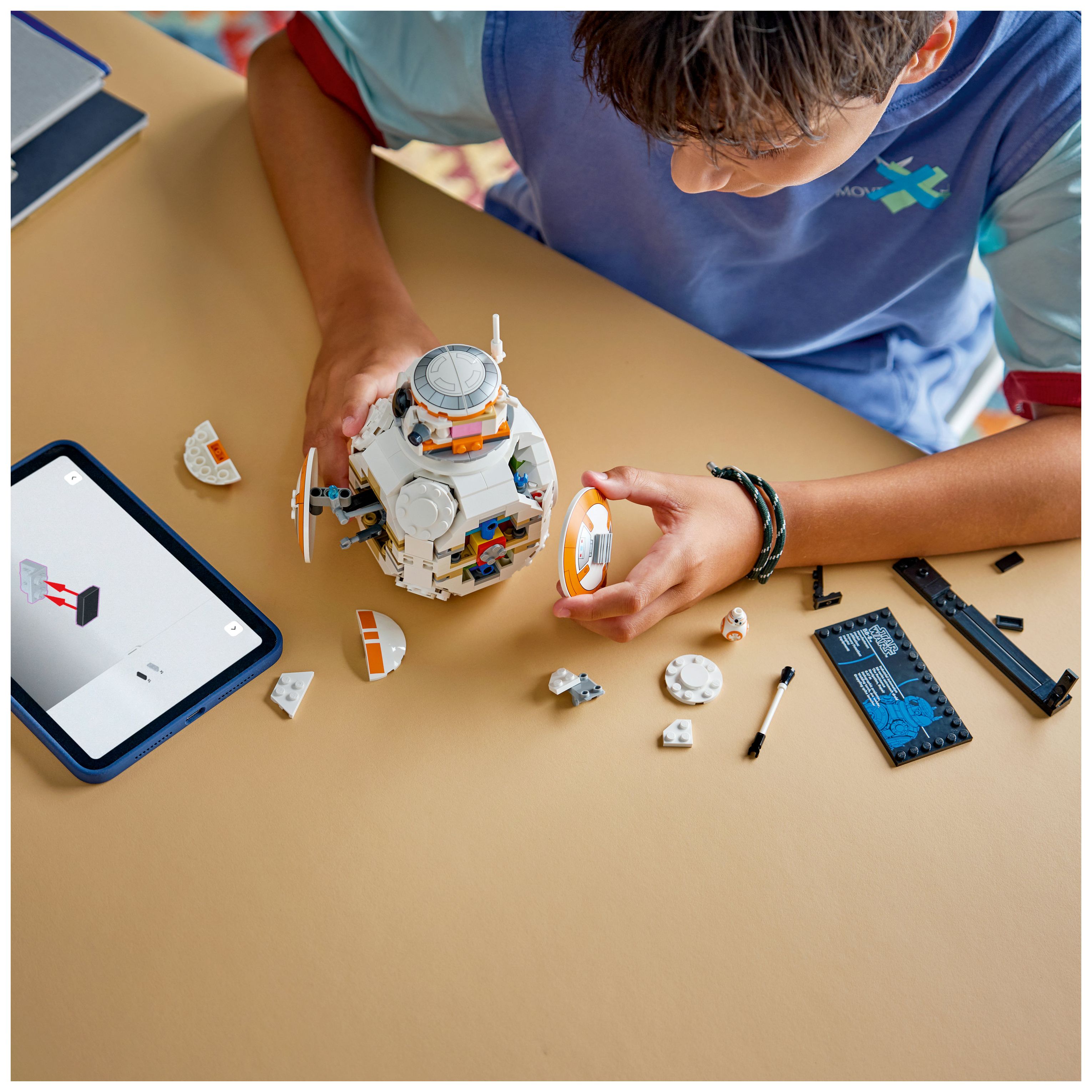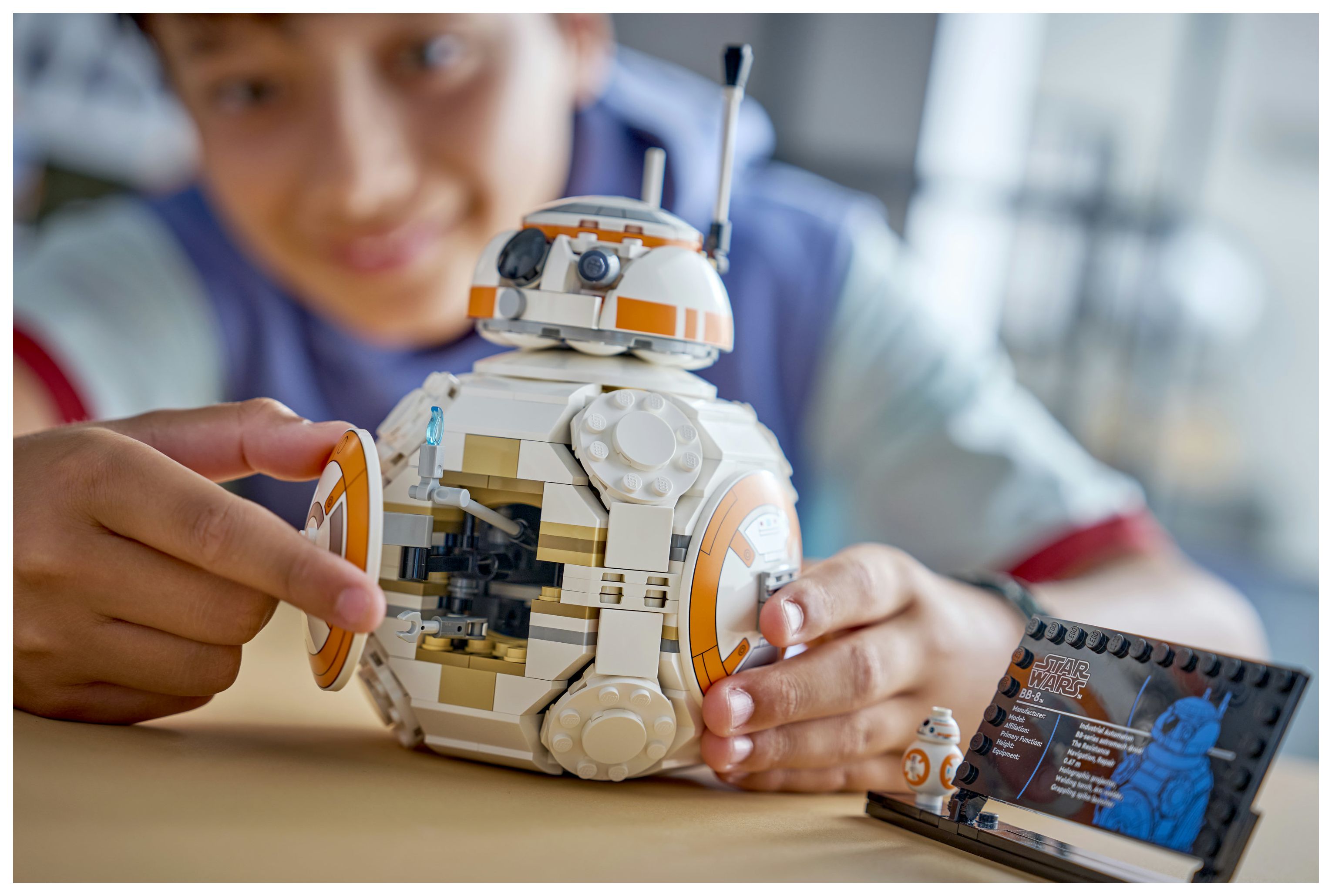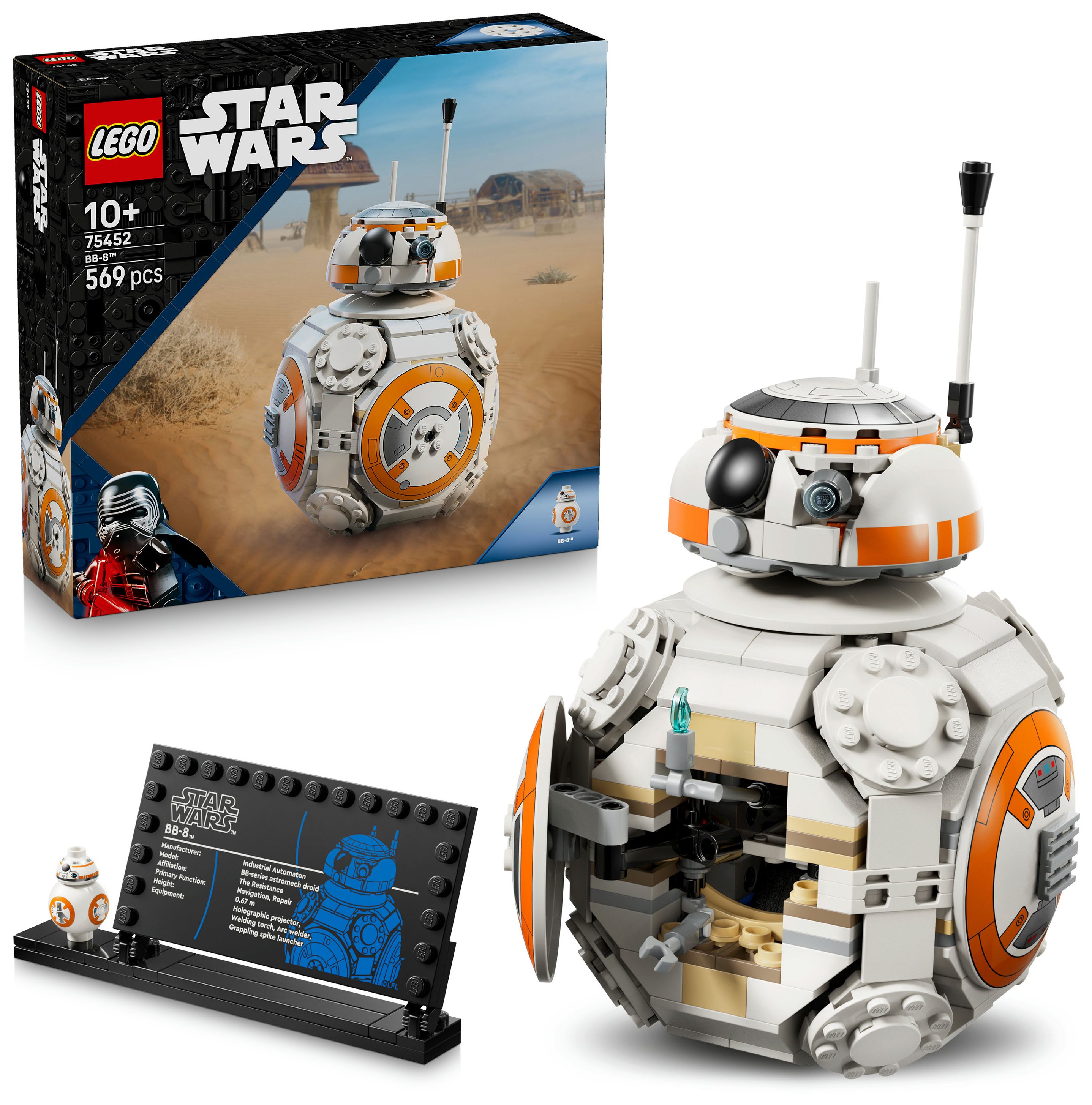 DIE LEGO® FIGUR BB-8: Stell das Hauptmodell zum Bauen und Spielen neben der Infotafel und BB-8 in LEGO Standardgröße aus
