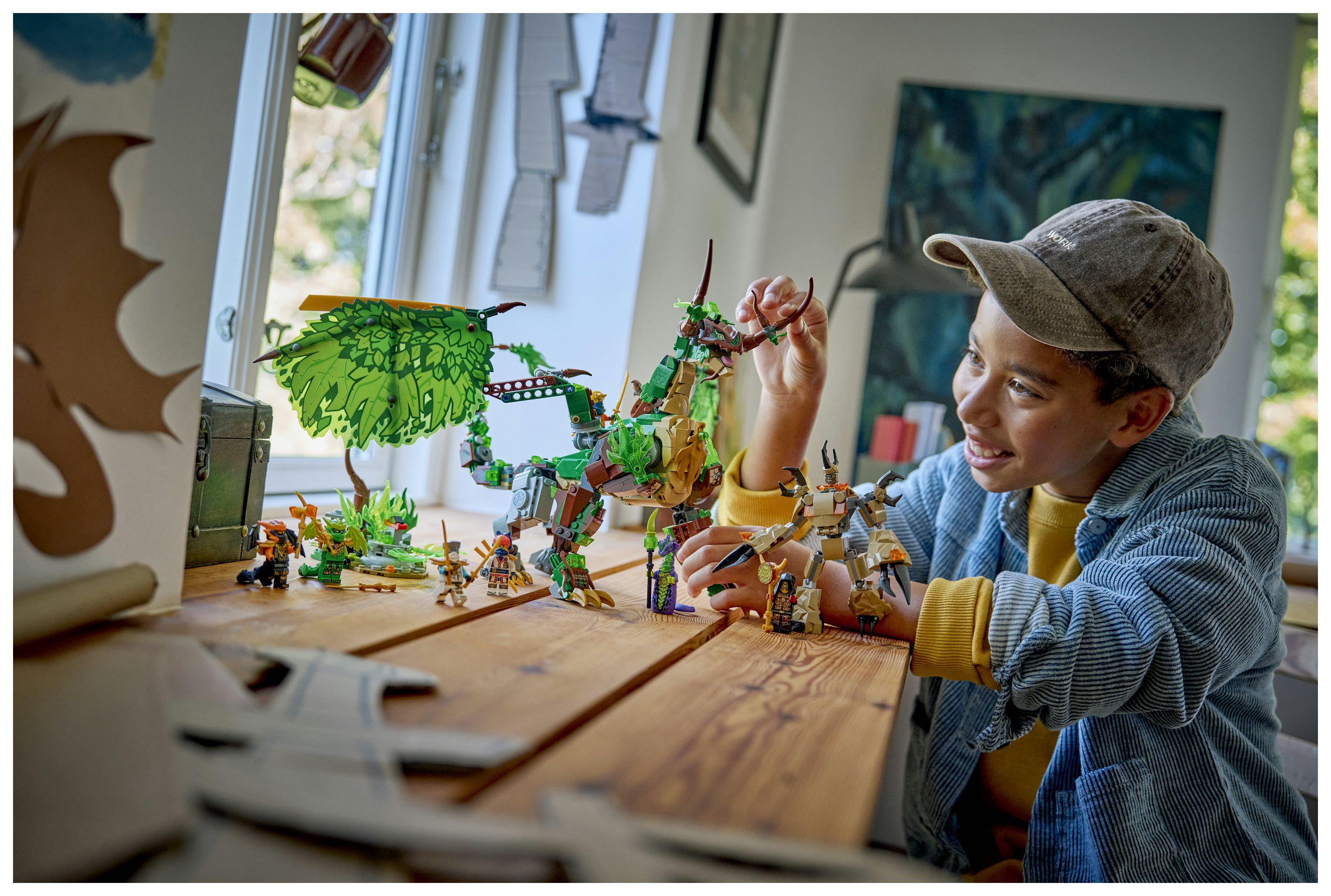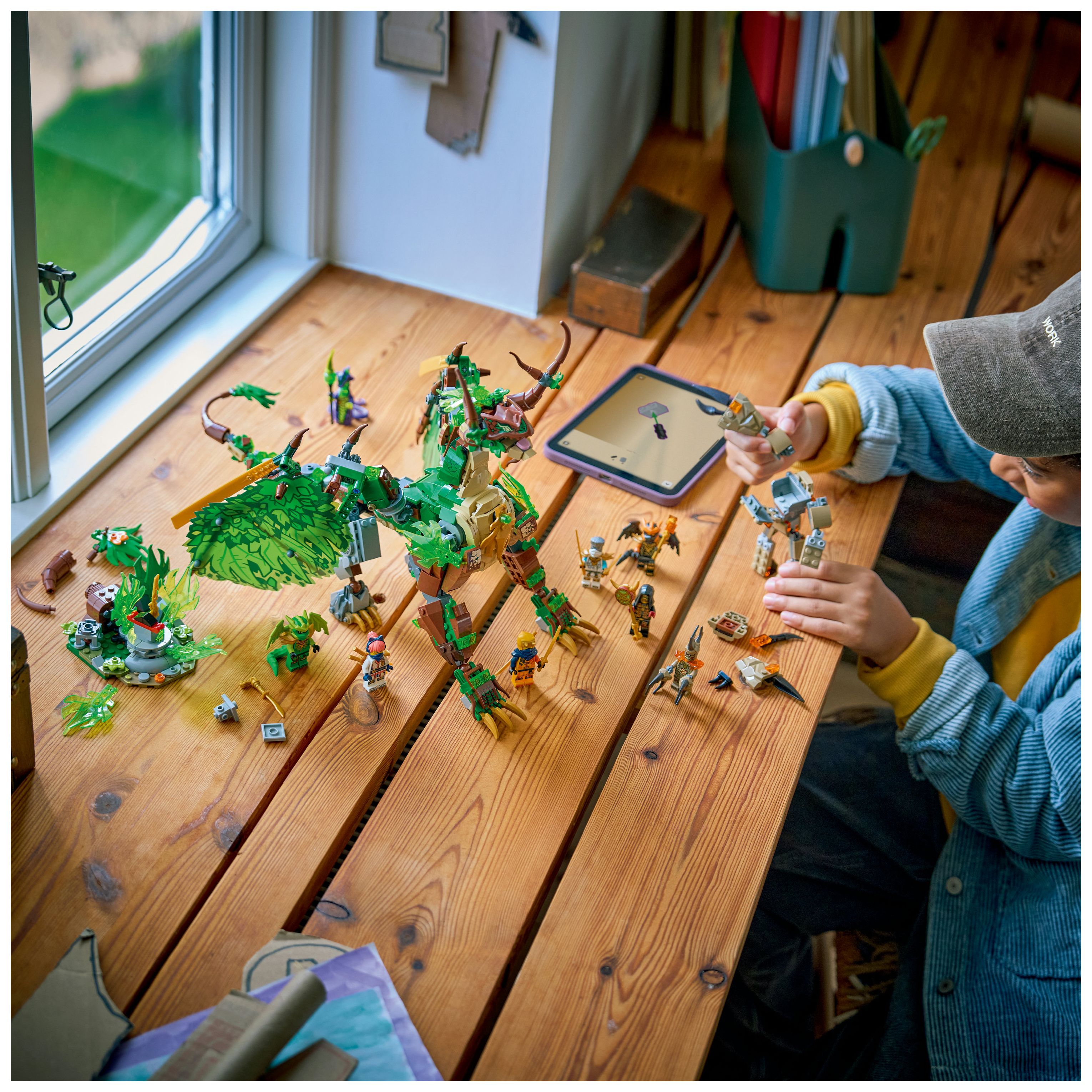 Das Spielset beinhaltet ein Nebenmodell aus Baum und Pflanze, das Kinder umdrehen können. Im Baum ist ein goldenes Schwert versteckt. Ein Mini-Mech mit Cockpit für eine Minifigur ist ebenfalls enthalten. Freu dich auf packende Rollenspiele mit 8 Minifiguren. Die Ninja Zane, Sora, Arin, Drachen-Form-Lloyd und Drachen-Form-Cole sowie das böse Trio aus Säuremonster, Erdmonster und Loyalistenanführer werden sich spannende Duelle liefern.