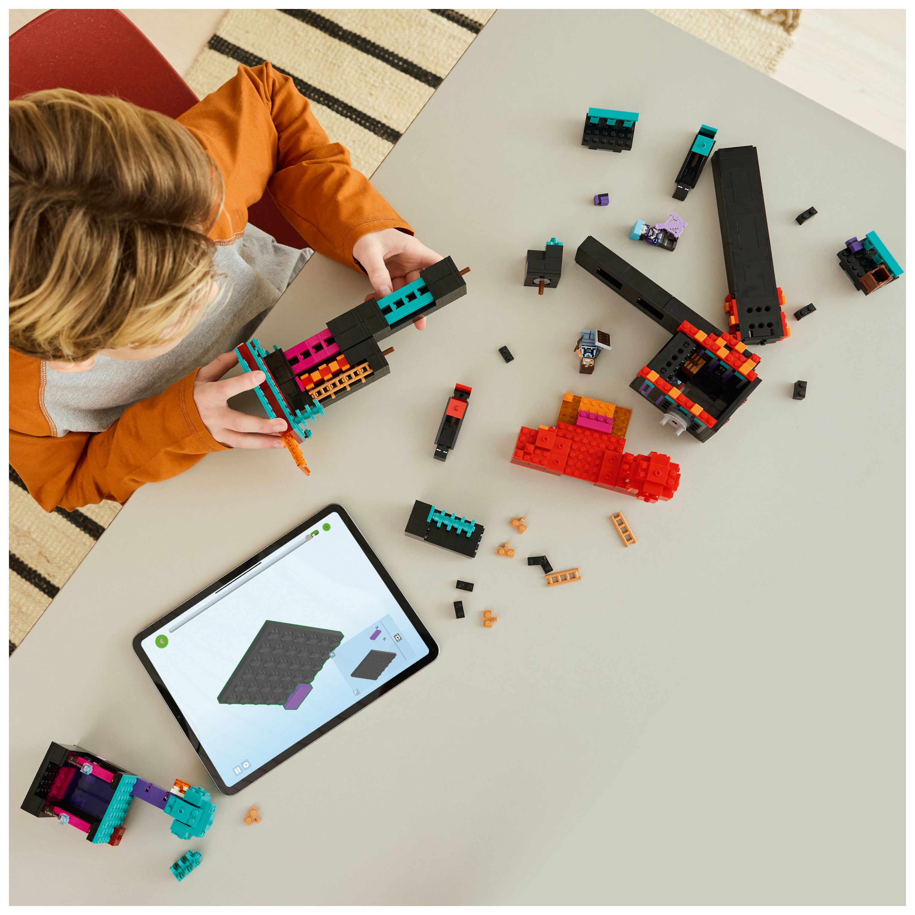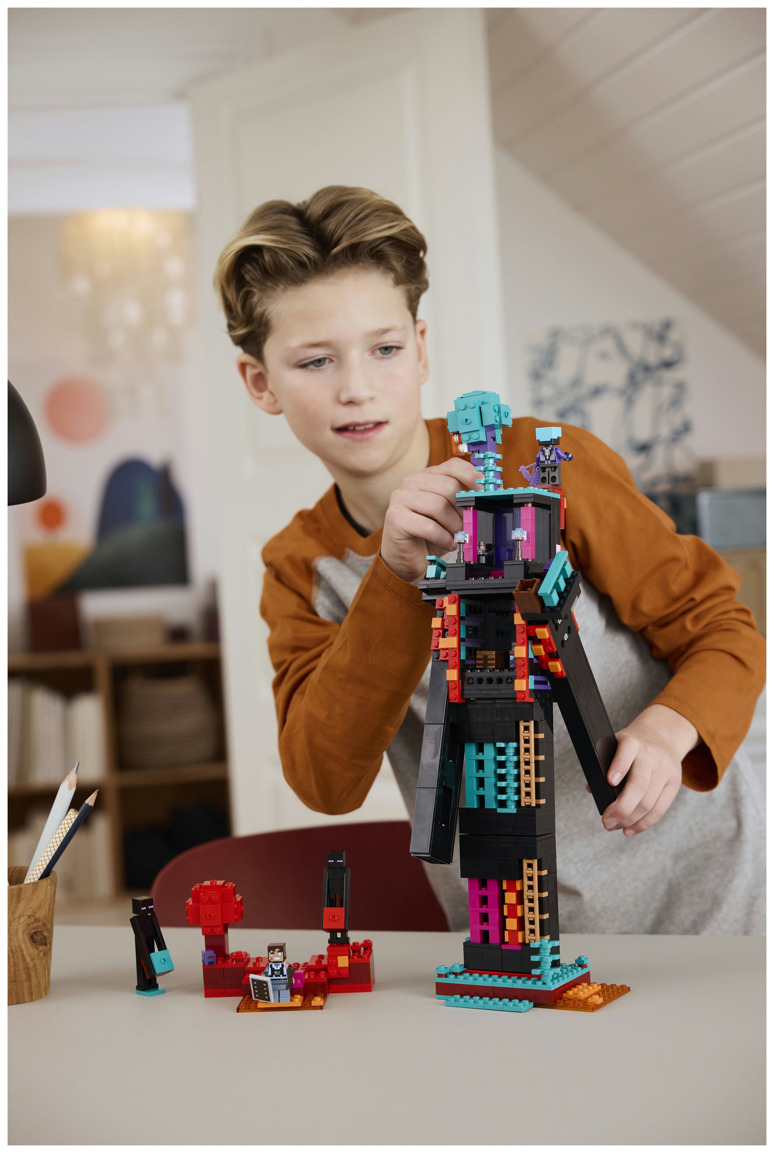 Abenteuerset für Gamer: Kinder können entweder den Enderman-Turm mit einem Netherportal bauen und erkunden, durch das sie zu endlosen Abenteuern aufbrechen können, oder eine Festung mit Zimmern für jede Menge Actionspaß