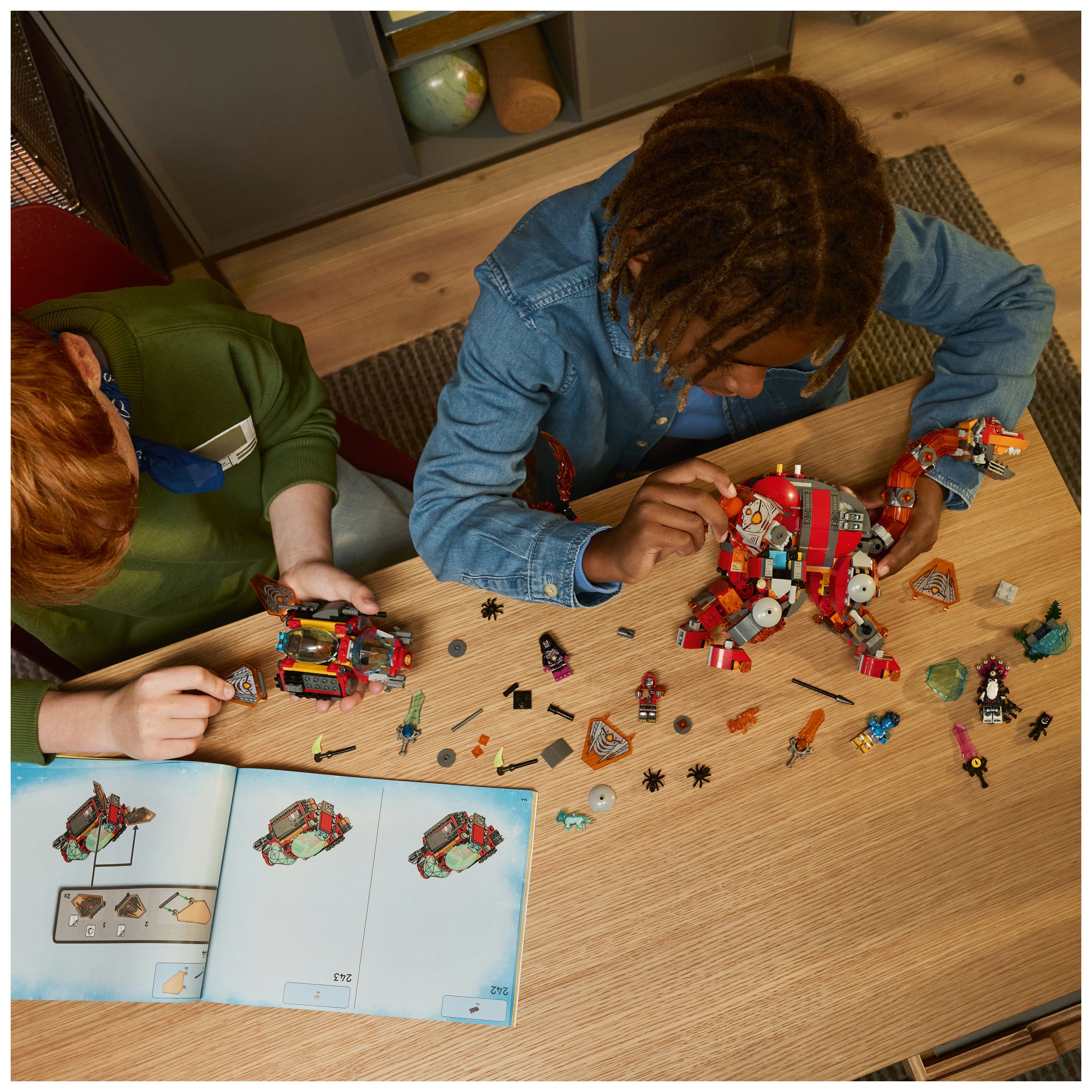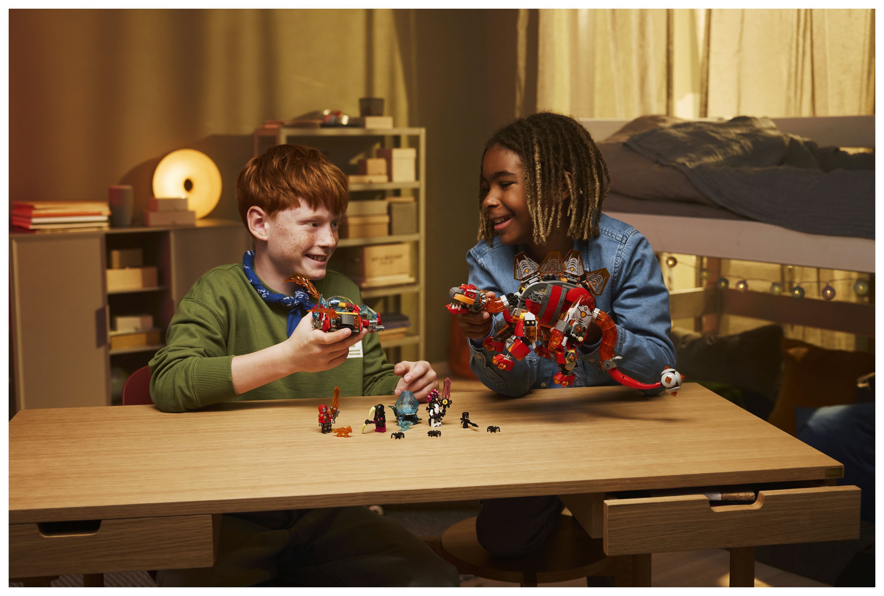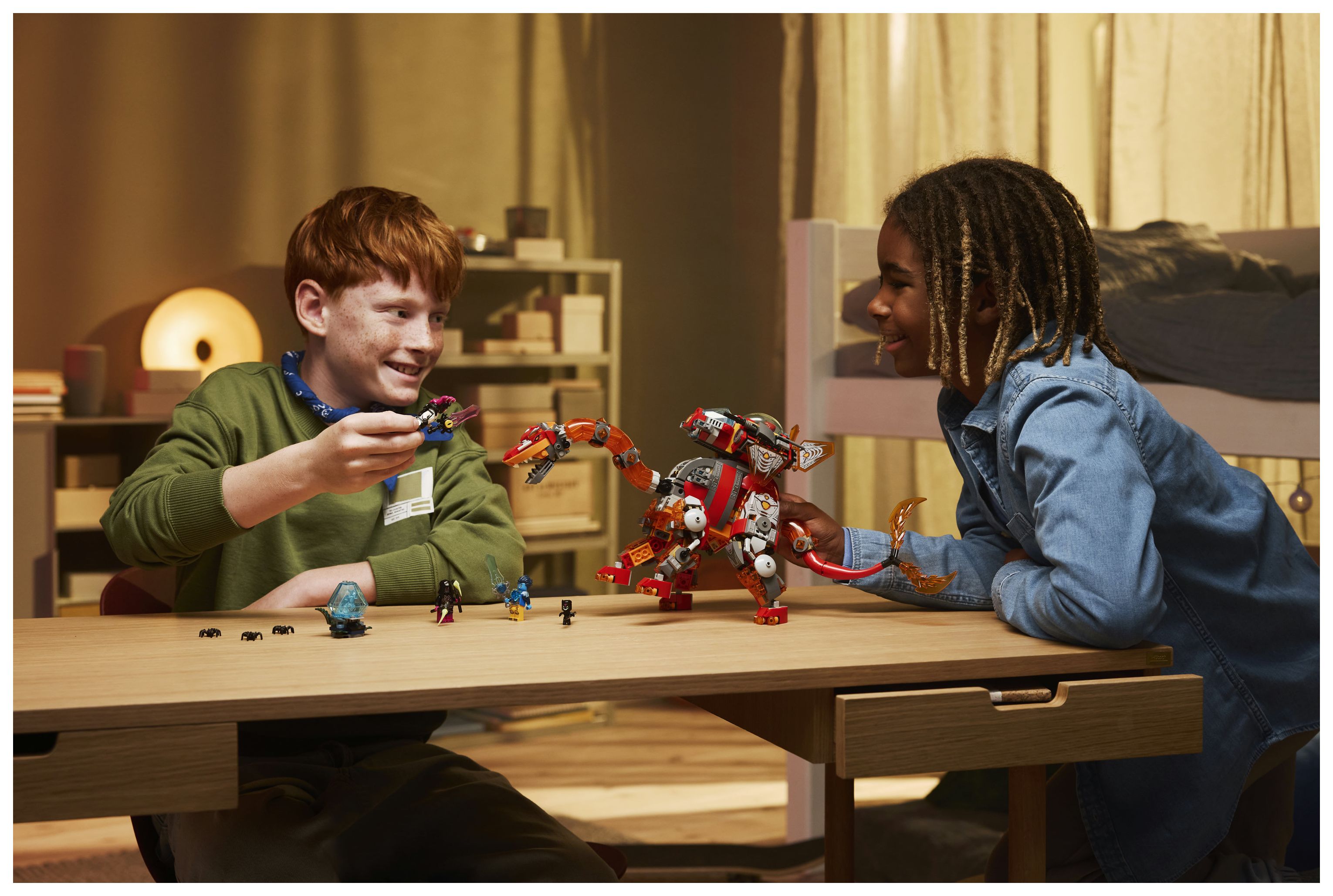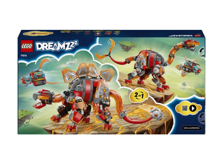 Der Brontosaurus ist ein turmhoher Dinosaurier, der aus geschmolzenem Gestein geschmiedet wird. Er hat einen gewaltigen Doppelschwanz, mit dem er alles wegpeitscht, was ihm in die Quere kommt, sowie ein abnehmbares Raumschiff. Der Stegosaurus ist dagegen eine echte Bestie mit verstärkter Panzerung, loderndem Knüppelschwanz und einem separaten Raumschiff. Zu dem Bauset gehören neben den Dinos auch 4 Minifiguren für Rollenspiele. Sie schwingen Schwerter, um 3 Spinnen zu verscheuchen. Ein Diamant-Ei sowie eine Orangefarbene und eine Blaue Schatzkreatur sind ebenfalls enthalten.