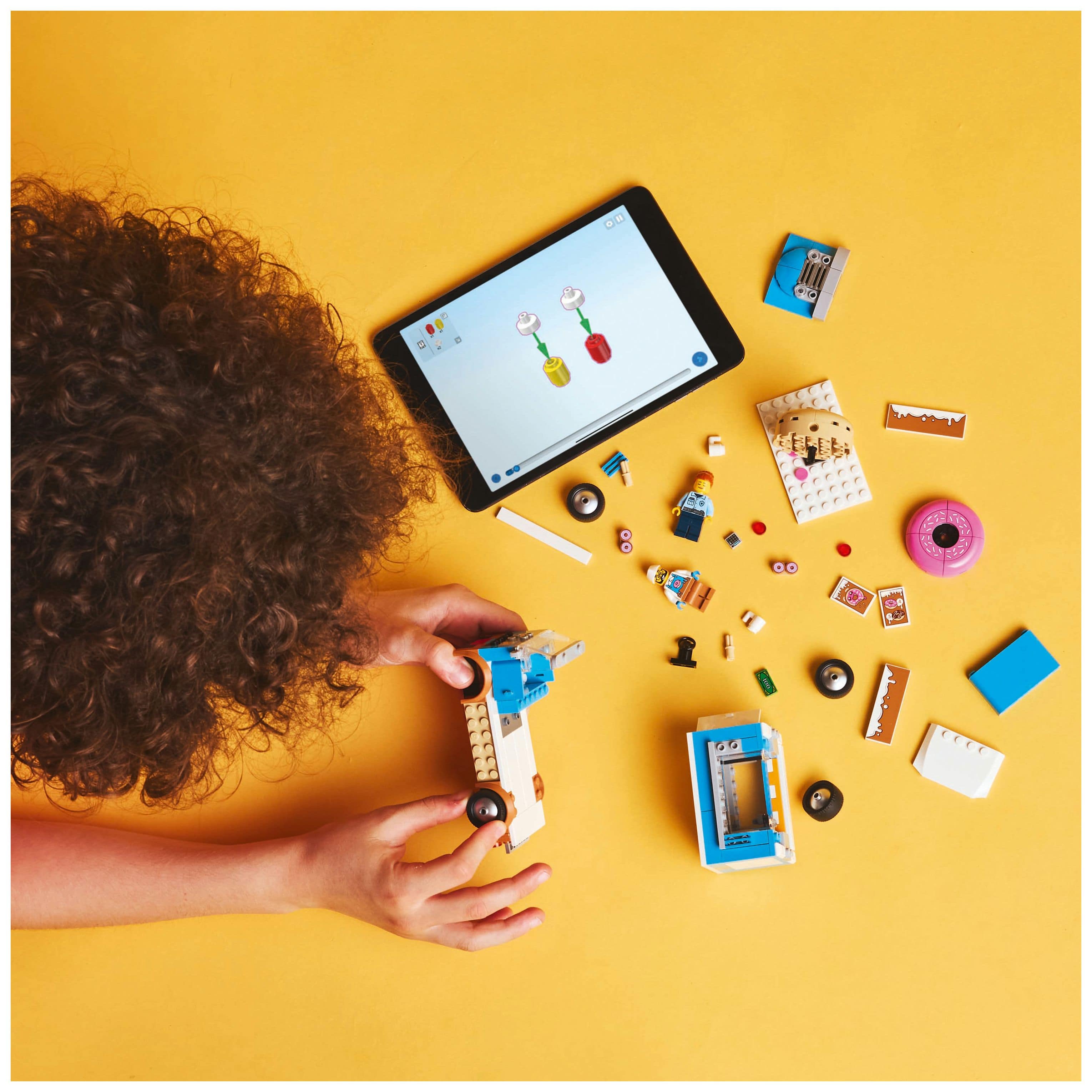 Eine Bauanleitung für den mobilen LEGO Donut-Laden liegt bei. Und in der LEGO Builder App können Kinder Sets erkunden und speichern, ihren Baufortschritt verfolgen und die Modelle beim Bauen vergrößern und drehen, um sie aus jedem Winkel zu betrachten.