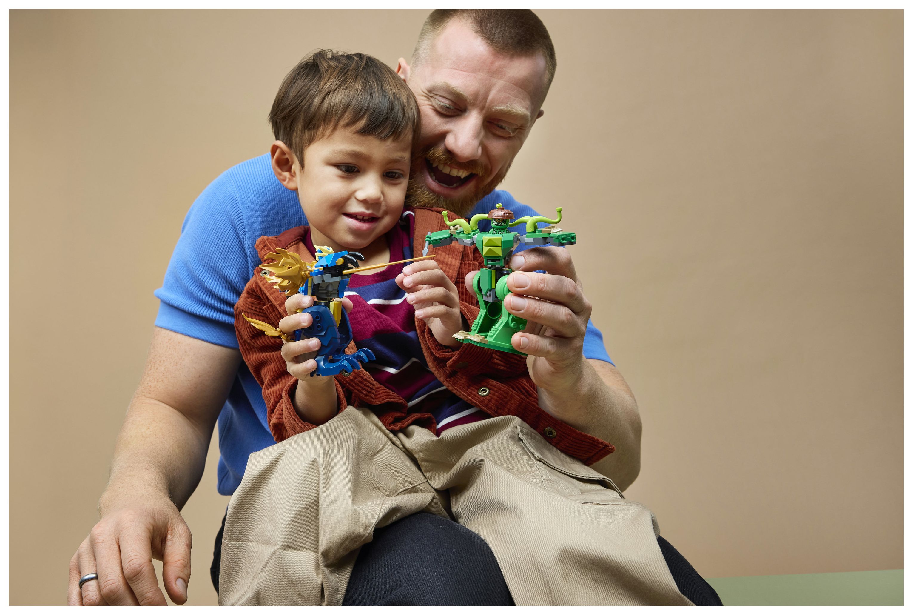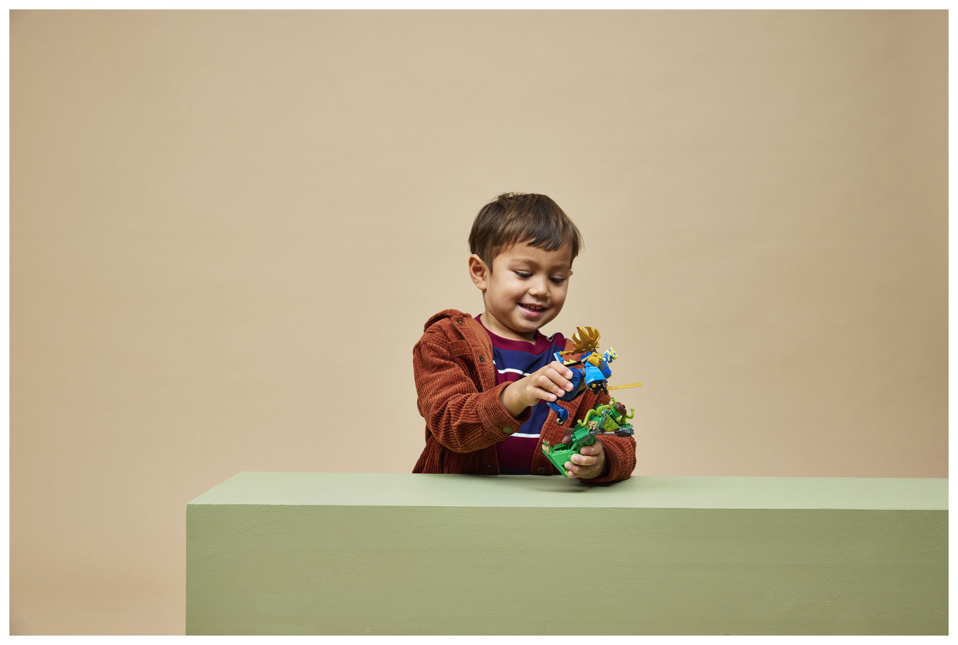 Diese faszinierenden Spielzeug-Mechs bringen Kindern ab 4 Jahren bei, wie man Modelle baut und Actionszenen aus der 4. Staffel der TV-Serie NINJAGO® Dragons Rising nachspielt. LEGO® NINJAGO Duell mit Jays Drachen-Mech (71853) ist ein Actionspielset mit 2 Mechs und 2 Minifiguren für spannende Abenteuer.