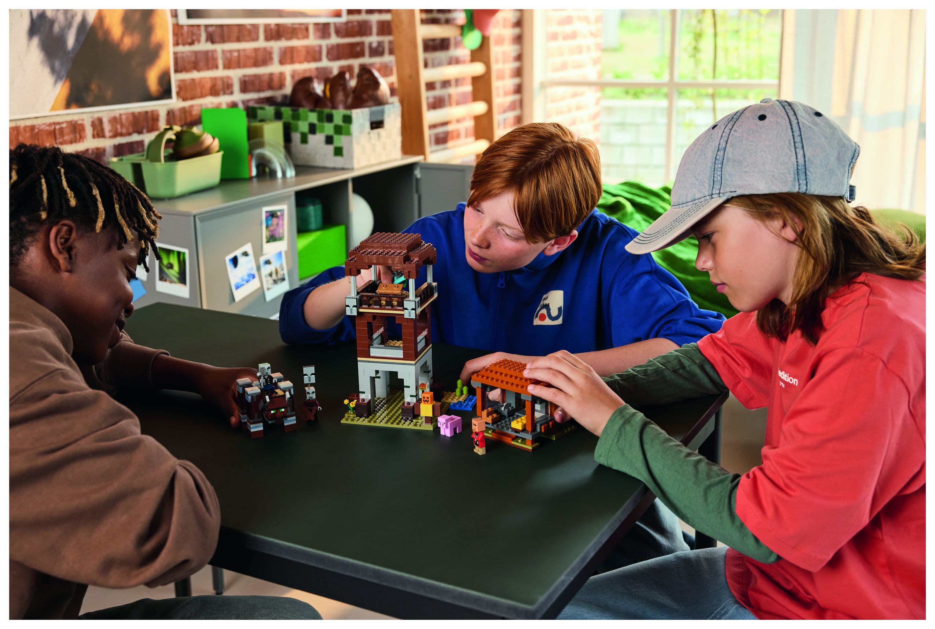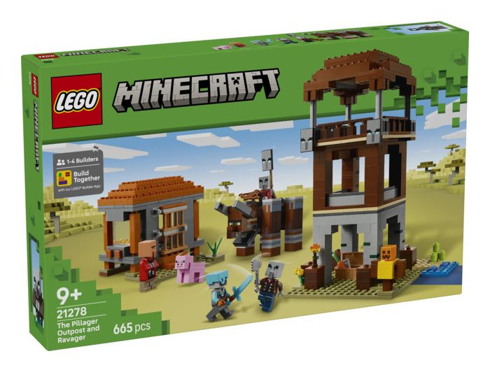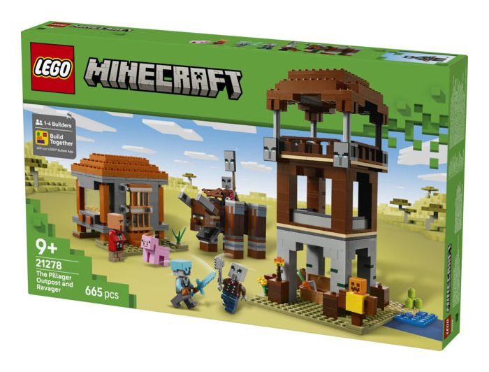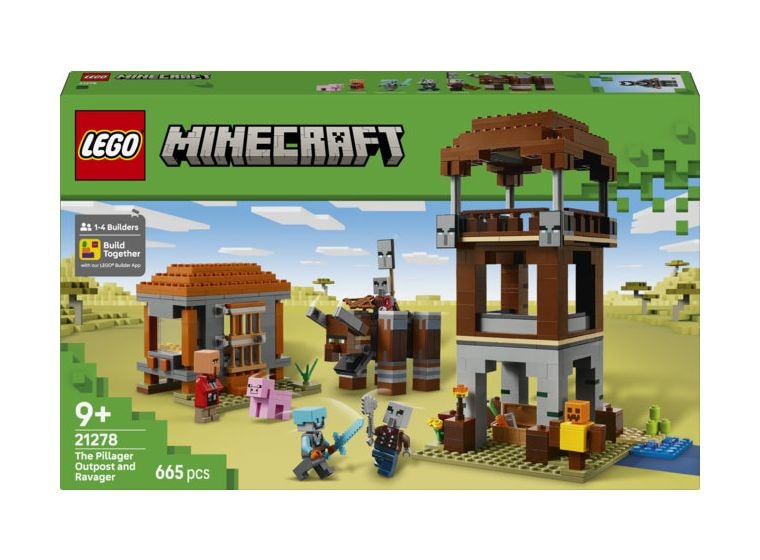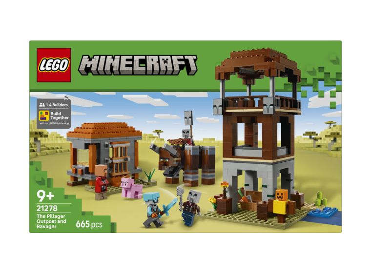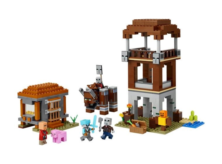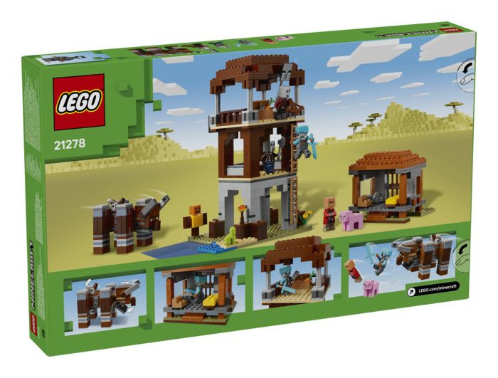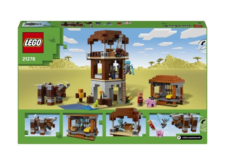 Das Set beinhaltet 4 LEGO Minecraft Minifiguren: eine Weltraumwache, einen Räuberhauptmann, einen Maurer und einen Diener. An dem baubaren Verwüster befindet sich ein Hebel, mit dem man seinen Kiefer schnappen und seinen Kopf Rammbewegungen vollführen lassen kann. Zu dem dreigeschossigen Wachturm führt eine Leiter hinauf. Auf Bannern sind Gesichter von Plünderern dargestellt. Und in der Truhe liegt kostbare Beute. Die Tür zum Haus des Maurers lässt sich aufklappen. Drinnen stehen ein Bett und ein Steinmetz. Das Set beinhaltet auch ein LEGO Minecraft Schwein und Zubehör, unter anderem eine Trainingspuppe, eine Fackel, eine Karotte, einen Eisenbarren, einen Diamanthelm, ein Diamantschwert, eine Armbrust und eine Eisenaxt. Zusätzlichen digitalen Bauspaß bietet die LEGO Builder App. Kinder können in der App auf ihrem Mobilgerät 3D-Modellansichten vergrößern und drehen. Besteht aus 665 Teilen.