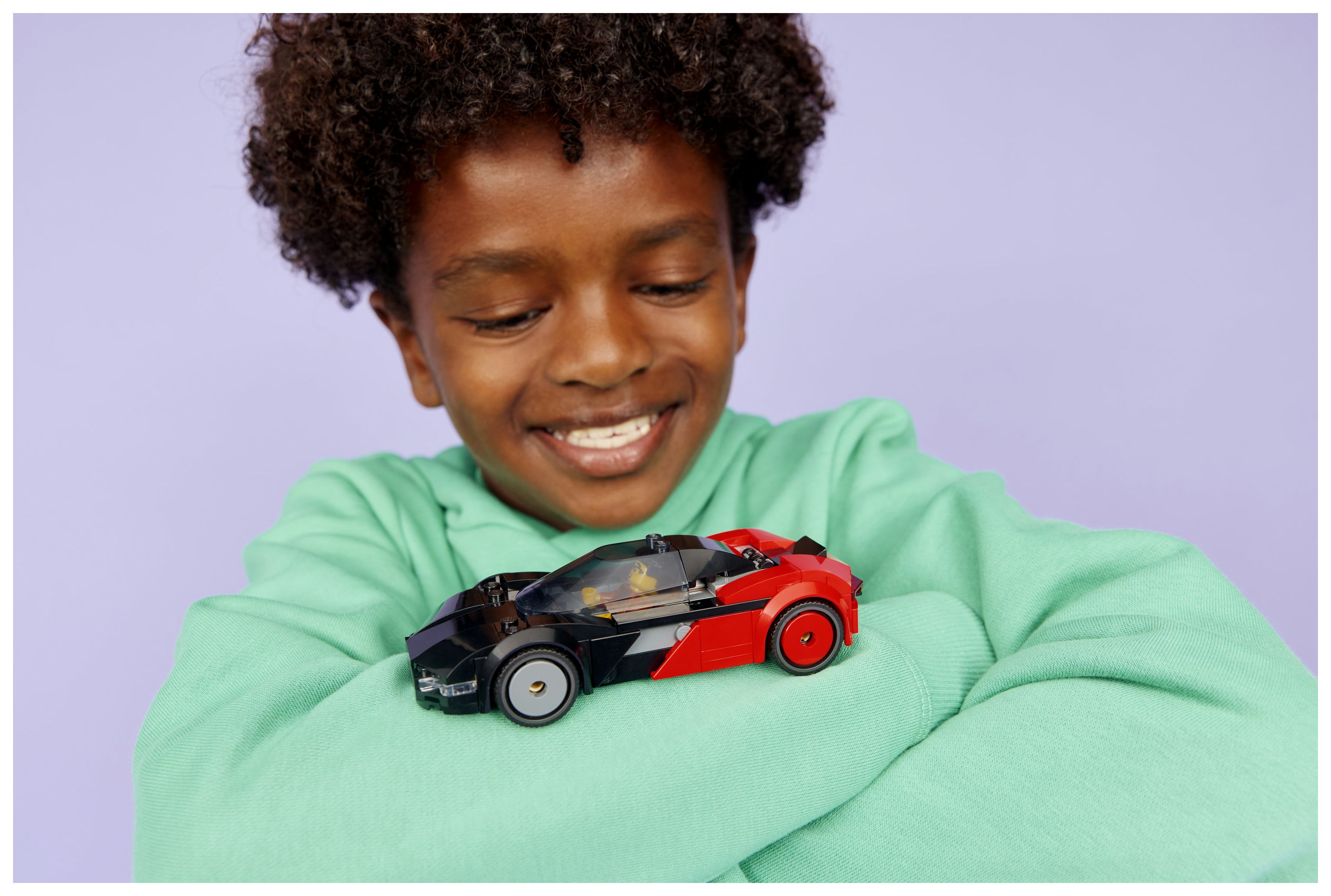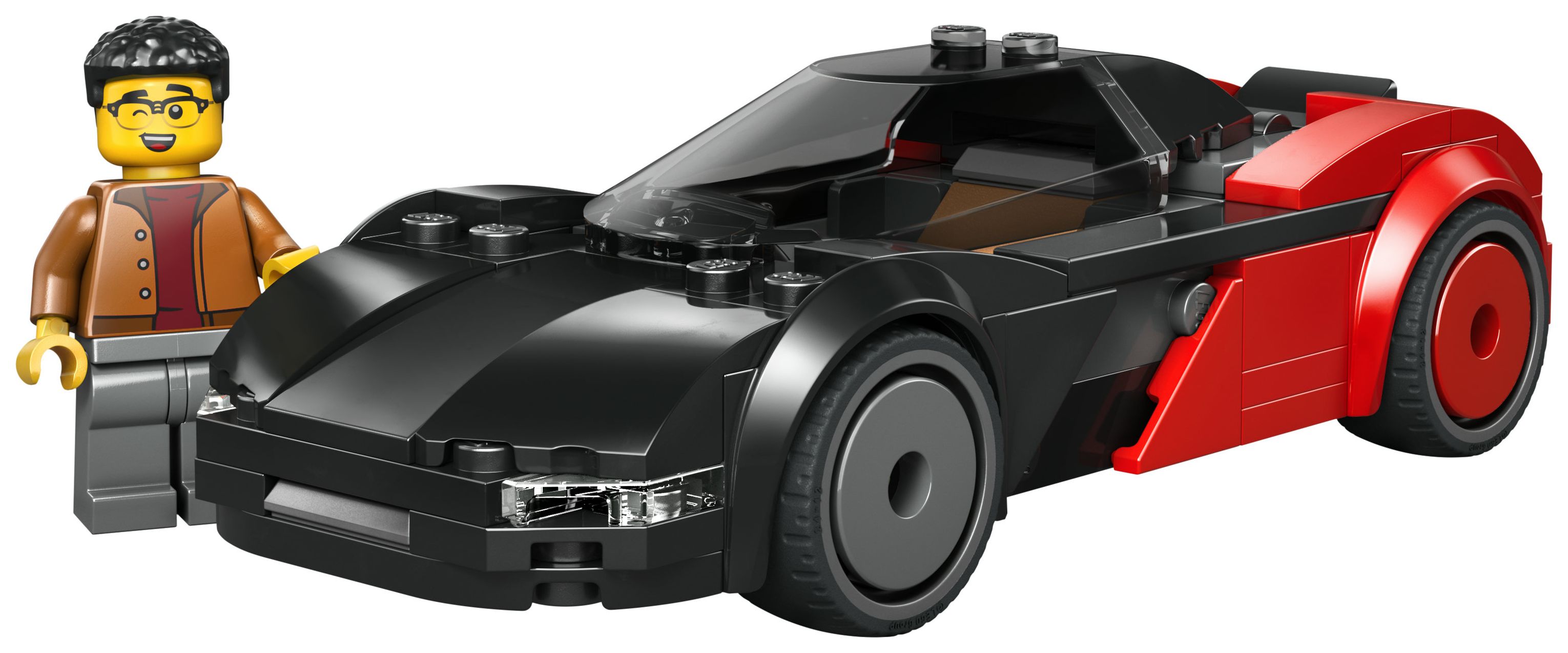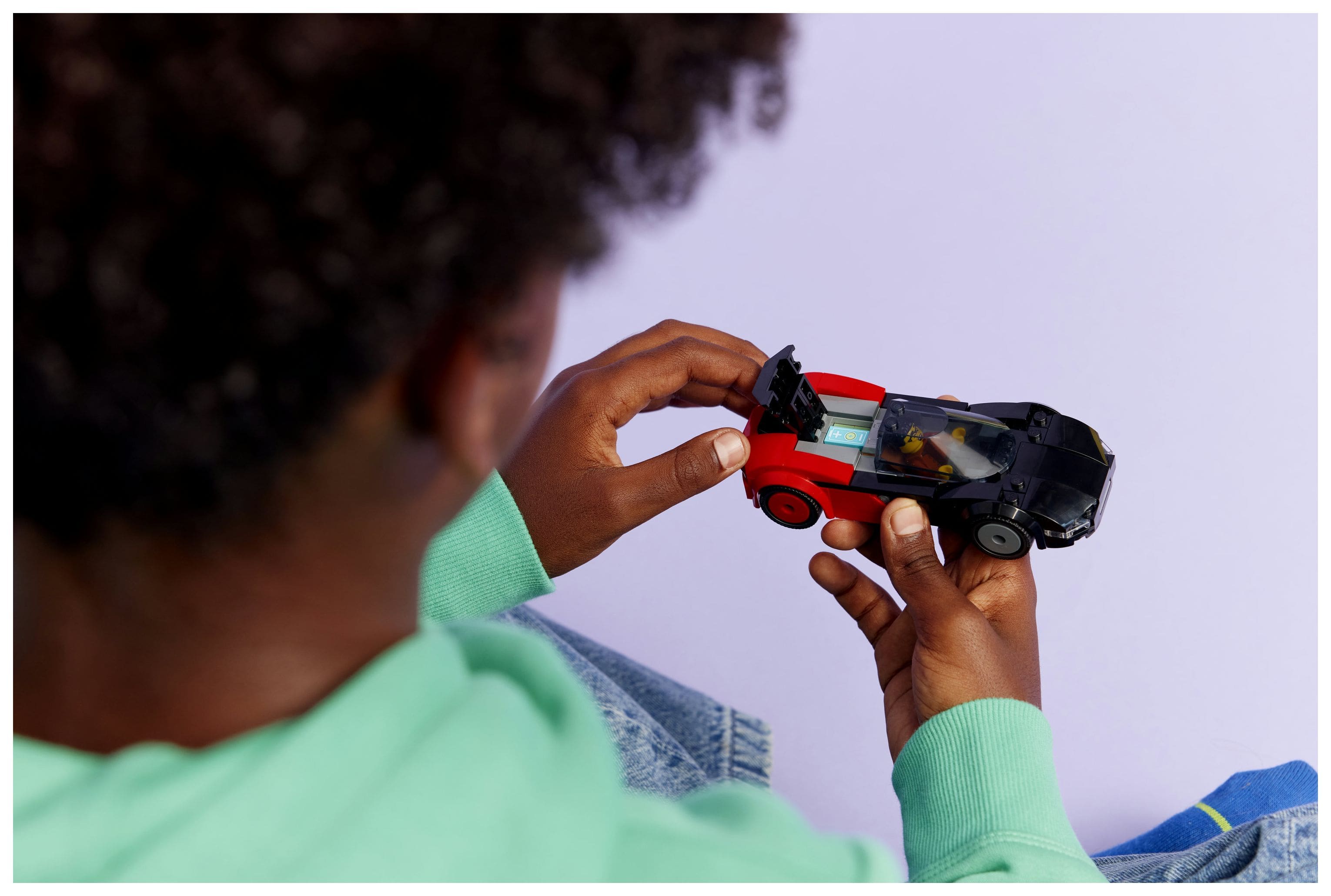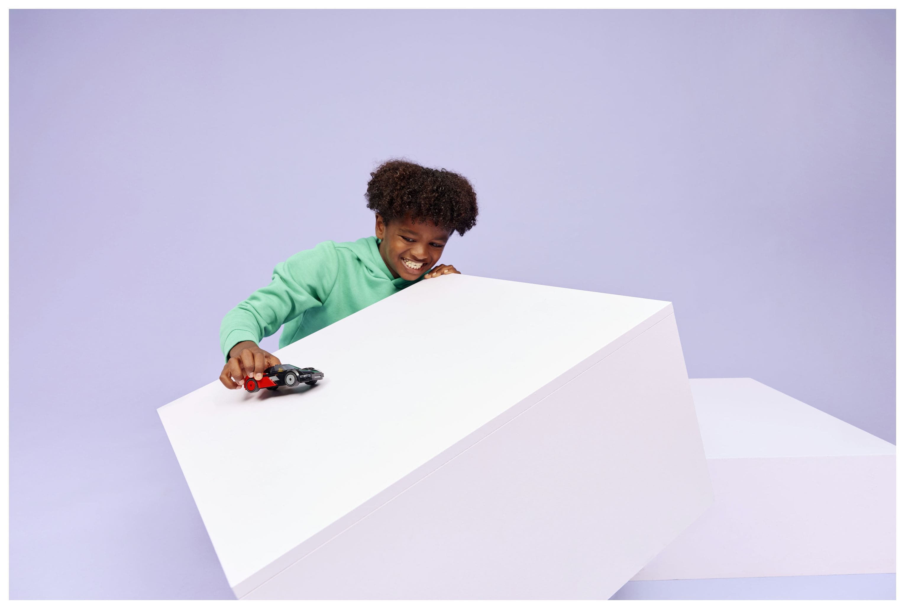 GENAU WIE IN ECHT: Öffne die Heckklappe des kleinen schwarz-roten Sportwagens, um Zugang zu den Spielzeugakkus zu erhalten, und setz die Minifigur ans Steuer, um viele Stunden Vollgas zu geben