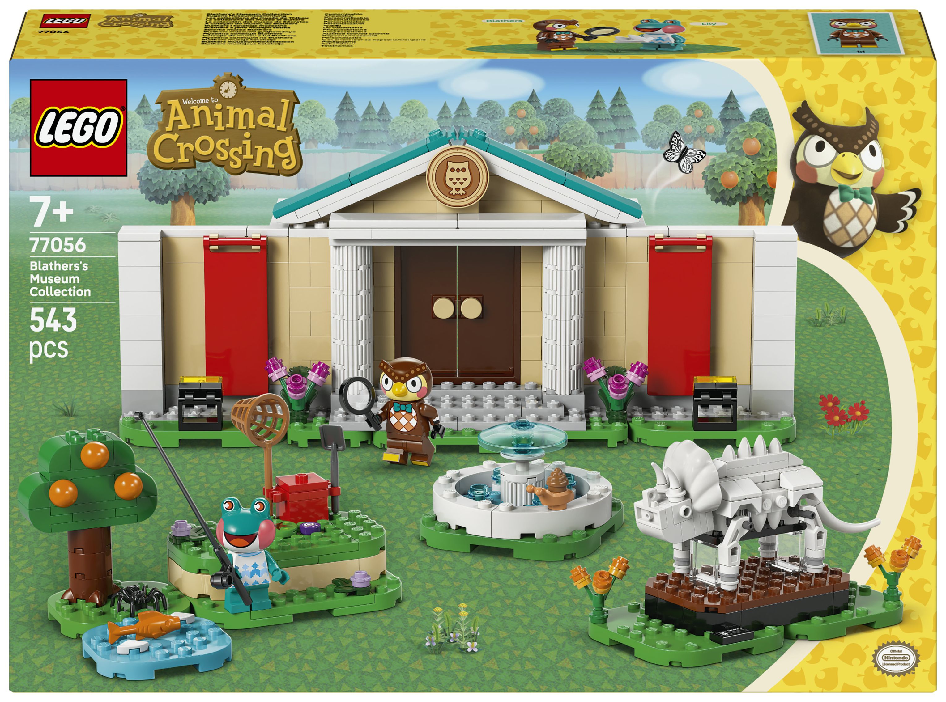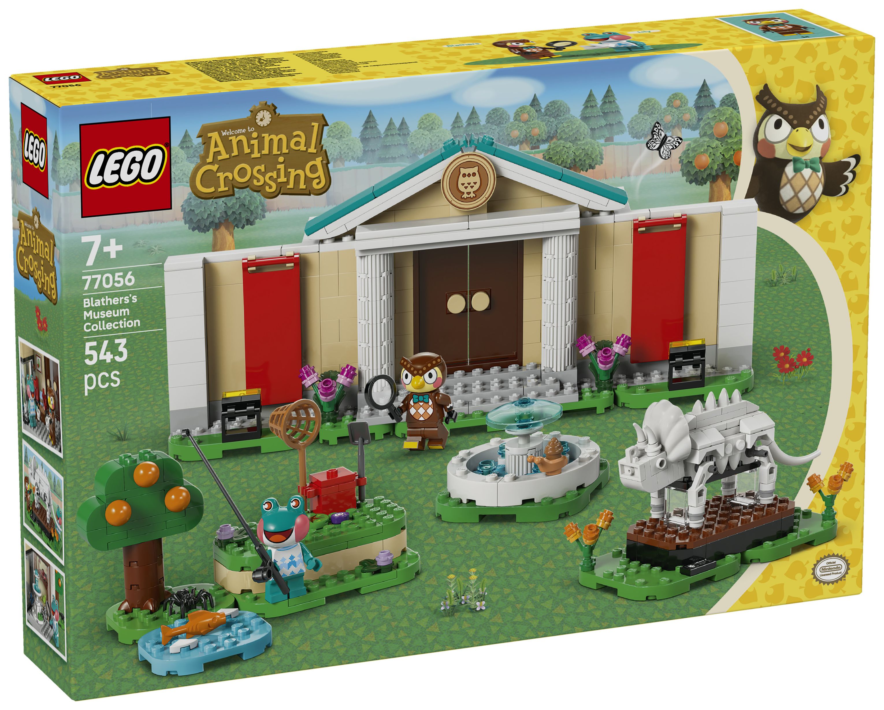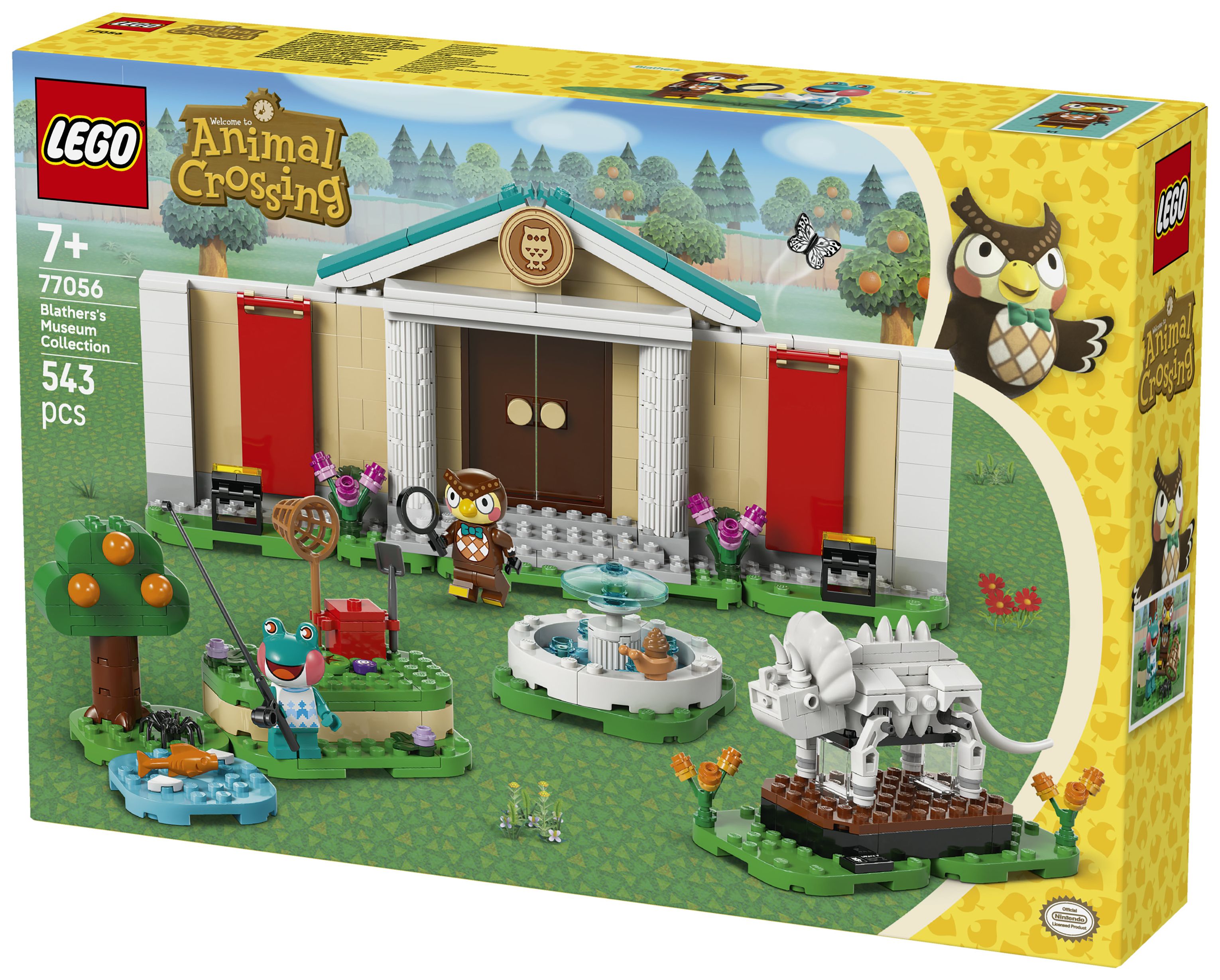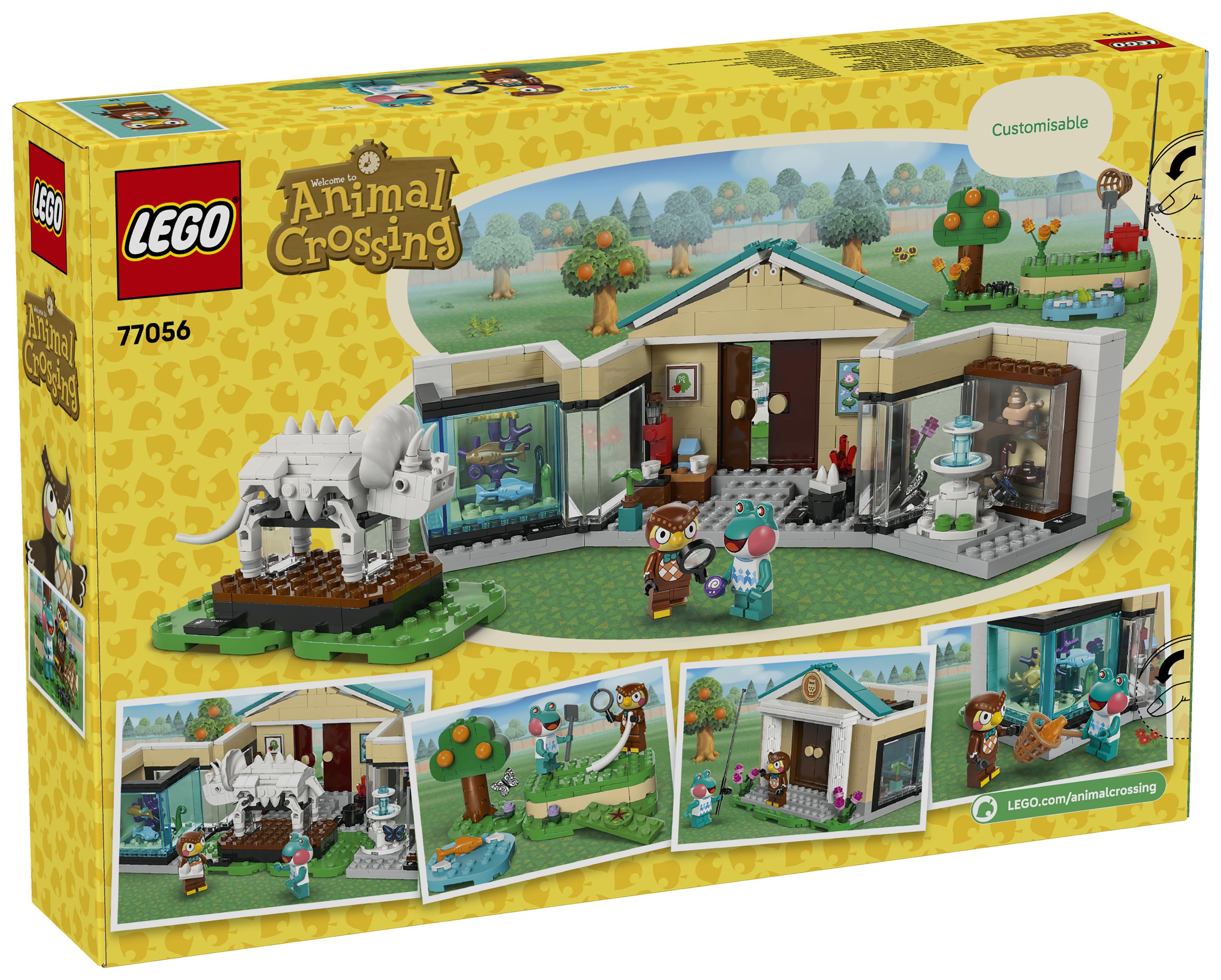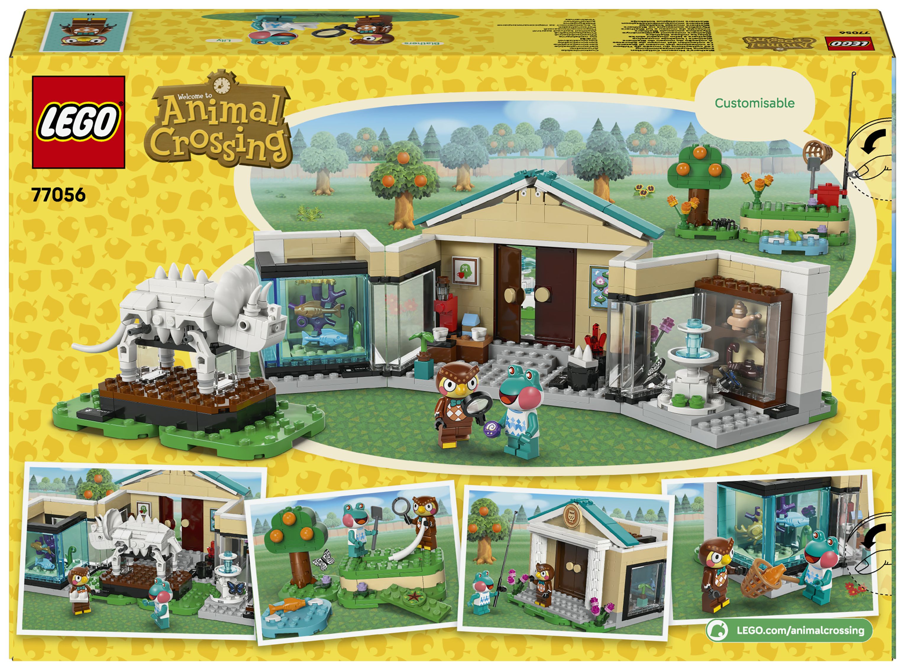 Dieses LEGO® Bauspielzeug bildet das Museum aus der Videospielreihe Animal Crossing nach. Kinder können die verschiedenen Ausstellungsbereiche mit ihren Funden individuell gestalten. Mit dem Spaten kann man den fehlenden Triceratops-Schwanzknochen ausgraben. Mit dem Netz kann man Fische fürs Aquarium oder Schmetterlinge und Krabbeltiere fangen. Klappwände und umstellbare Elemente lassen sich anders anordnen und bieten weitere Spielmöglichkeiten. Zum Set gehören auch ein Springbrunnen und das Café Taubenschlag, in dem Kinder Eugen und Liliane treffen können, bevor sie die Natur weiter erkunden. Außerdem bietet die LEGO Builder App zusätzlichen digitalen Bauspaß. In der App können junge Baumeister 3D-Modellansichten vergrößern und drehen. Das Set besteht aus 543 Teilen.
