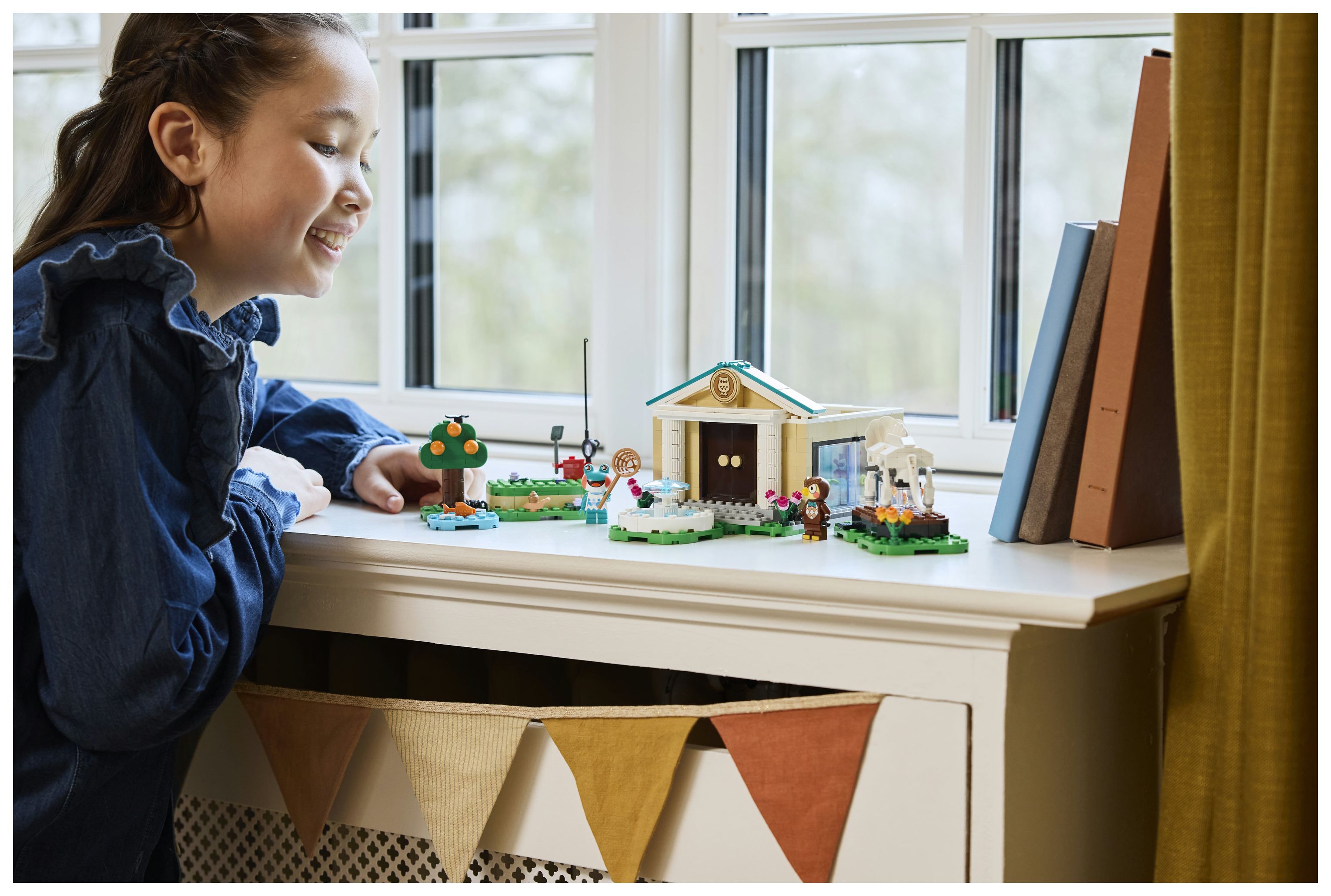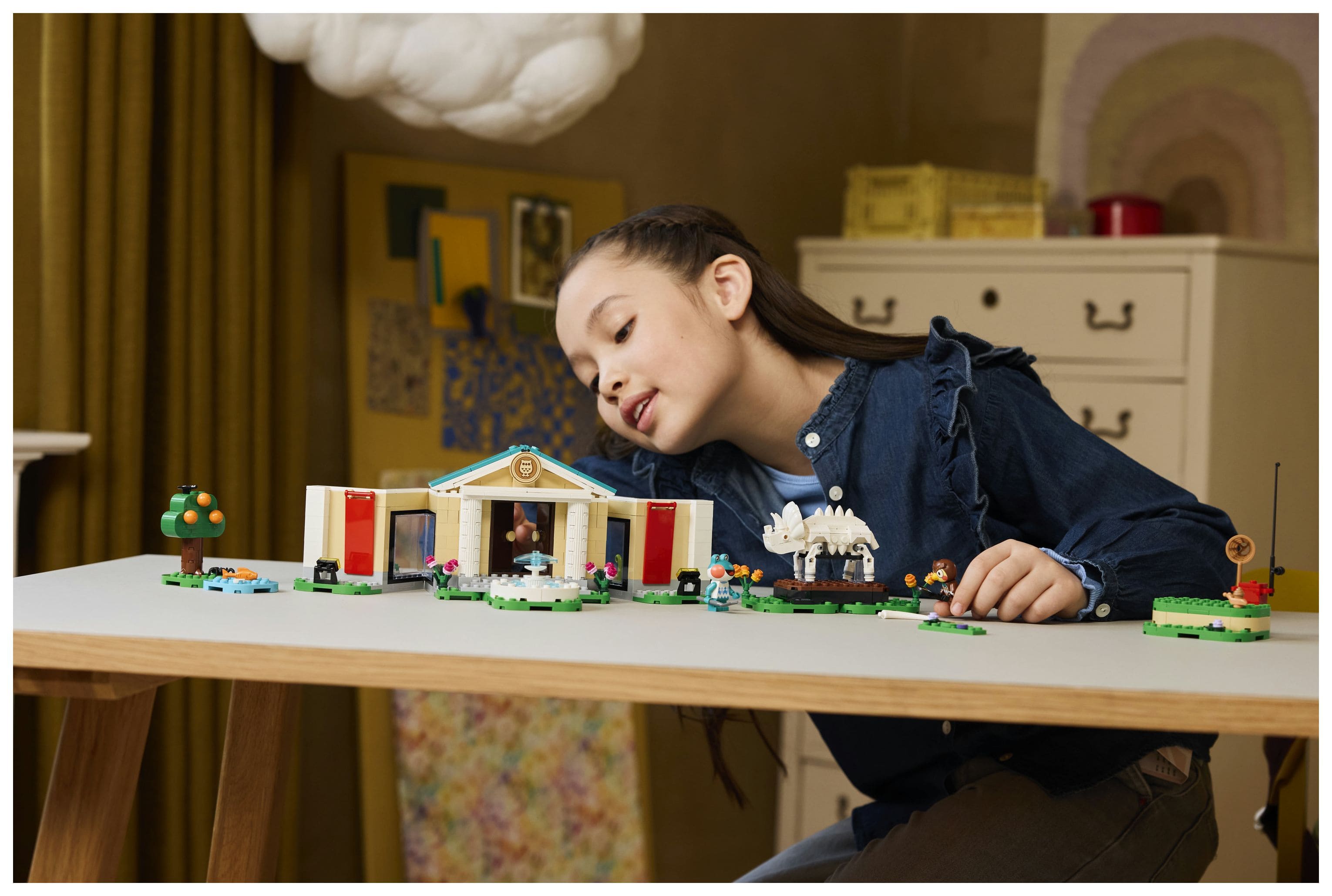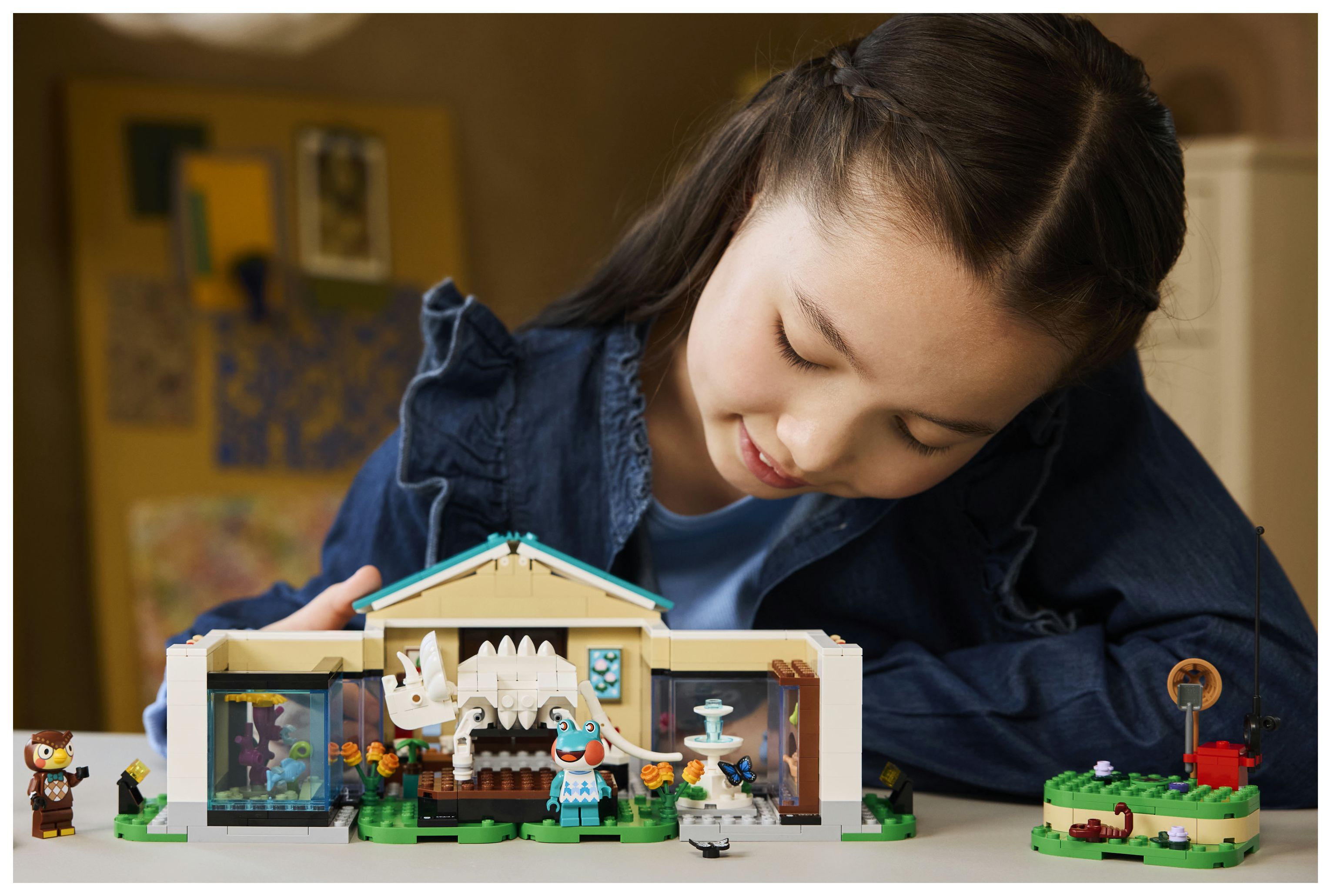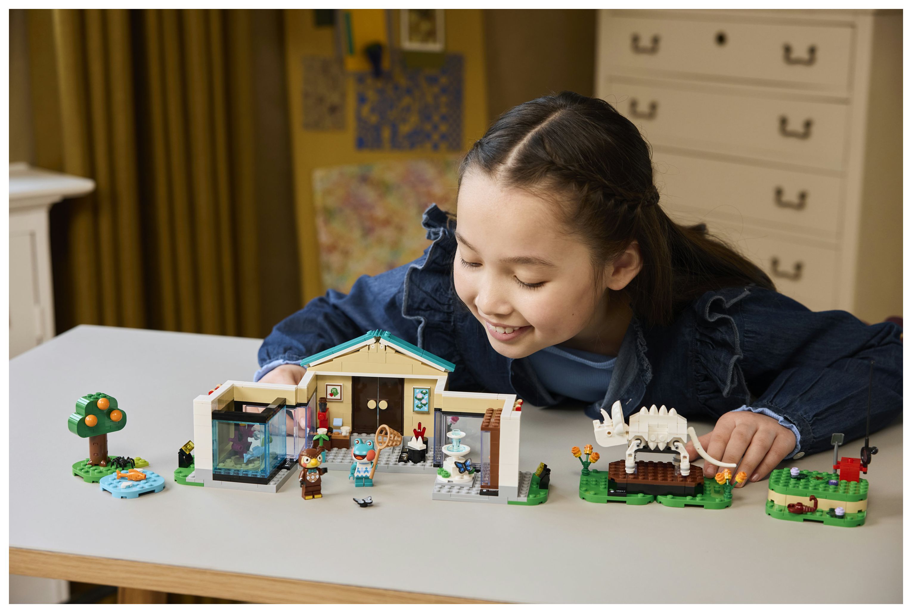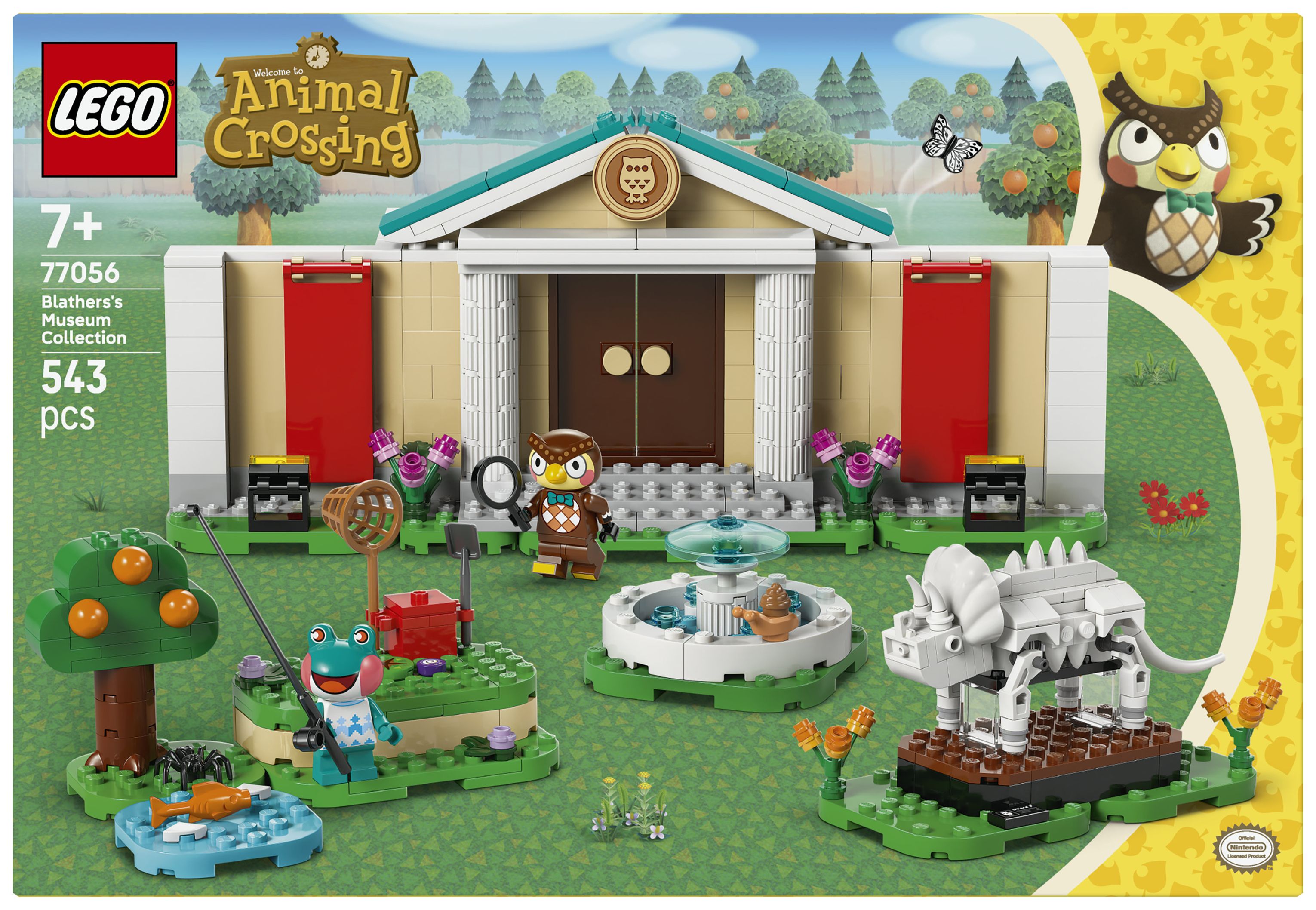 Dieses LEGO® Bauspielzeug bildet das Museum aus der Videospielreihe Animal Crossing nach. Kinder können die verschiedenen Ausstellungsbereiche mit ihren Funden individuell gestalten. Mit dem Spaten kann man den fehlenden Triceratops-Schwanzknochen ausgraben. Mit dem Netz kann man Fische fürs Aquarium oder Schmetterlinge und Krabbeltiere fangen. Klappwände und umstellbare Elemente lassen sich anders anordnen und bieten weitere Spielmöglichkeiten. Zum Set gehören auch ein Springbrunnen und das Café Taubenschlag, in dem Kinder Eugen und Liliane treffen können, bevor sie die Natur weiter erkunden. Außerdem bietet die LEGO Builder App zusätzlichen digitalen Bauspaß. In der App können junge Baumeister 3D-Modellansichten vergrößern und drehen. Das Set besteht aus 543 Teilen.
