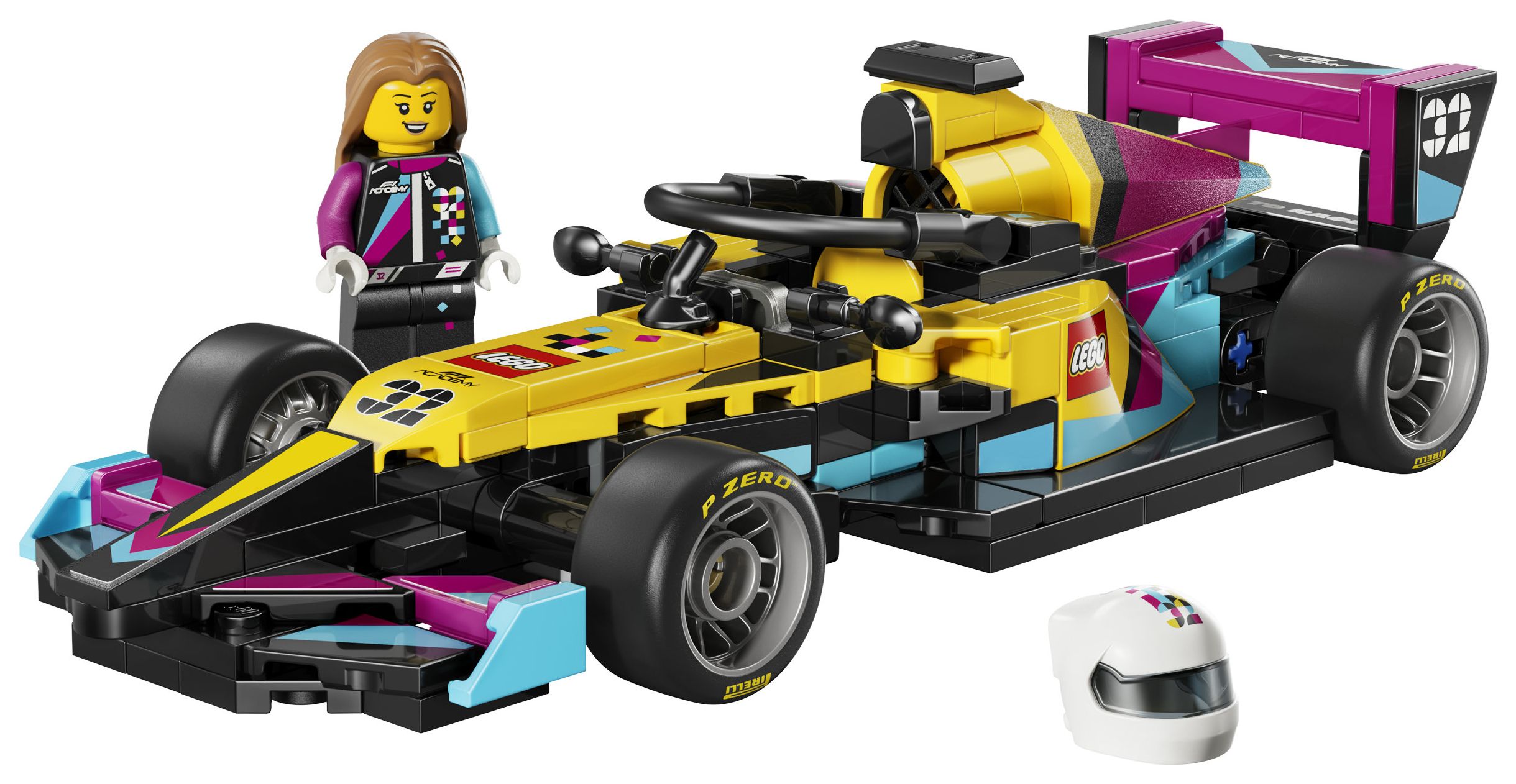Dieses F1 ACADEMY Auto hat ein Cockpit, einen Heckflügel und Reifen mit dem Aufdruck „Pirelli“. Zu dem Spielzeugrennauto gehört auch eine F1 ACADEMY Rennfahrerin. Die Minifigur trägt einen Helm, ein Haarteil und einen Schraubenschlüssel. Kinder können die Minifigur ins Cockpit setzen und in rasante Rennen schicken.