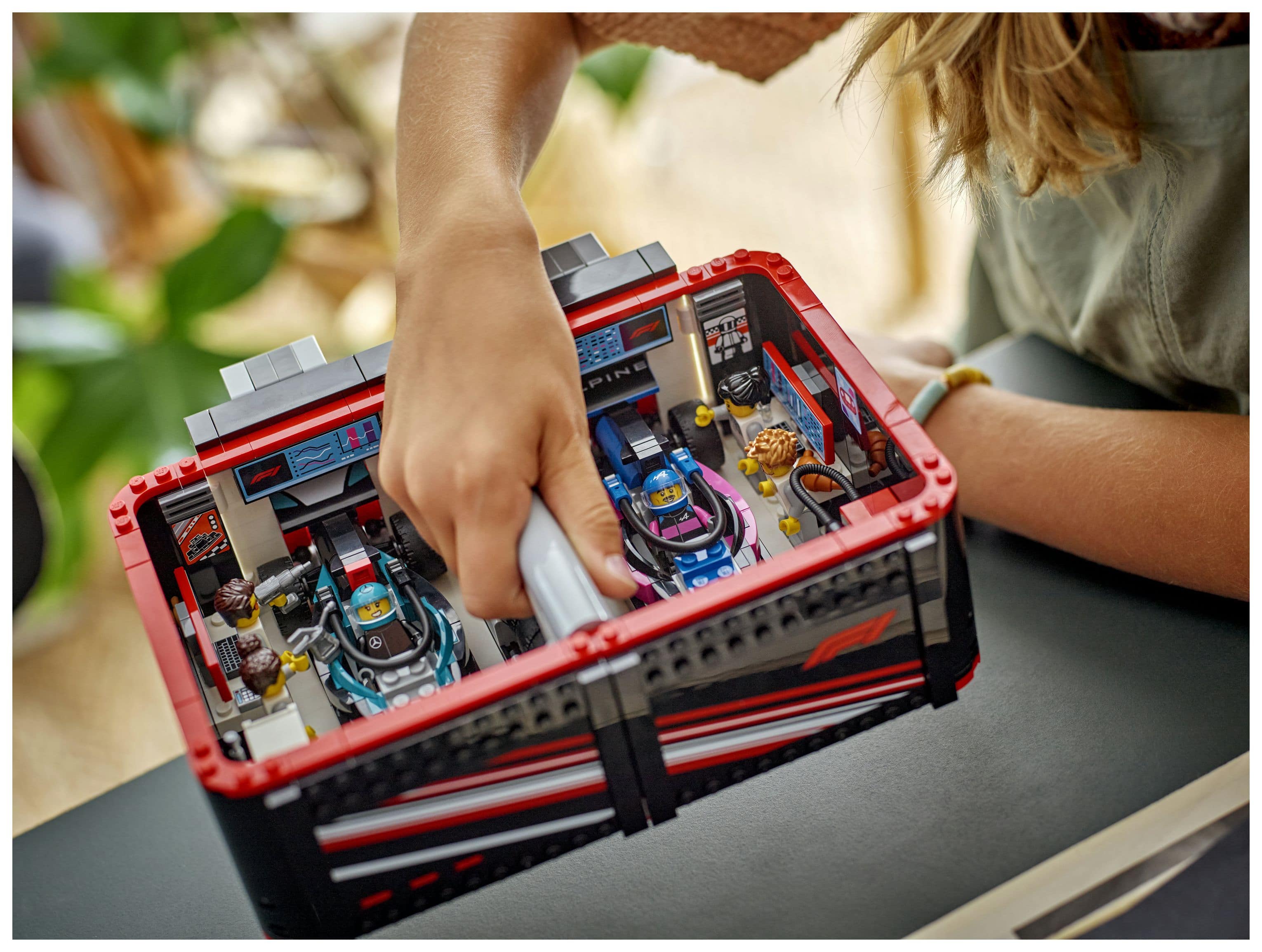 F1® Modell zum Mitnehmen: An der Box befindet sich ein praktischer Tragegriff. Klappt man die Box auf, kommt eine detailreiche Autowerkstatt zum Vorschein. Mithilfe eines Hebels können Kinder die F1-Rennautos aus den Startboxen losflitzen lassen