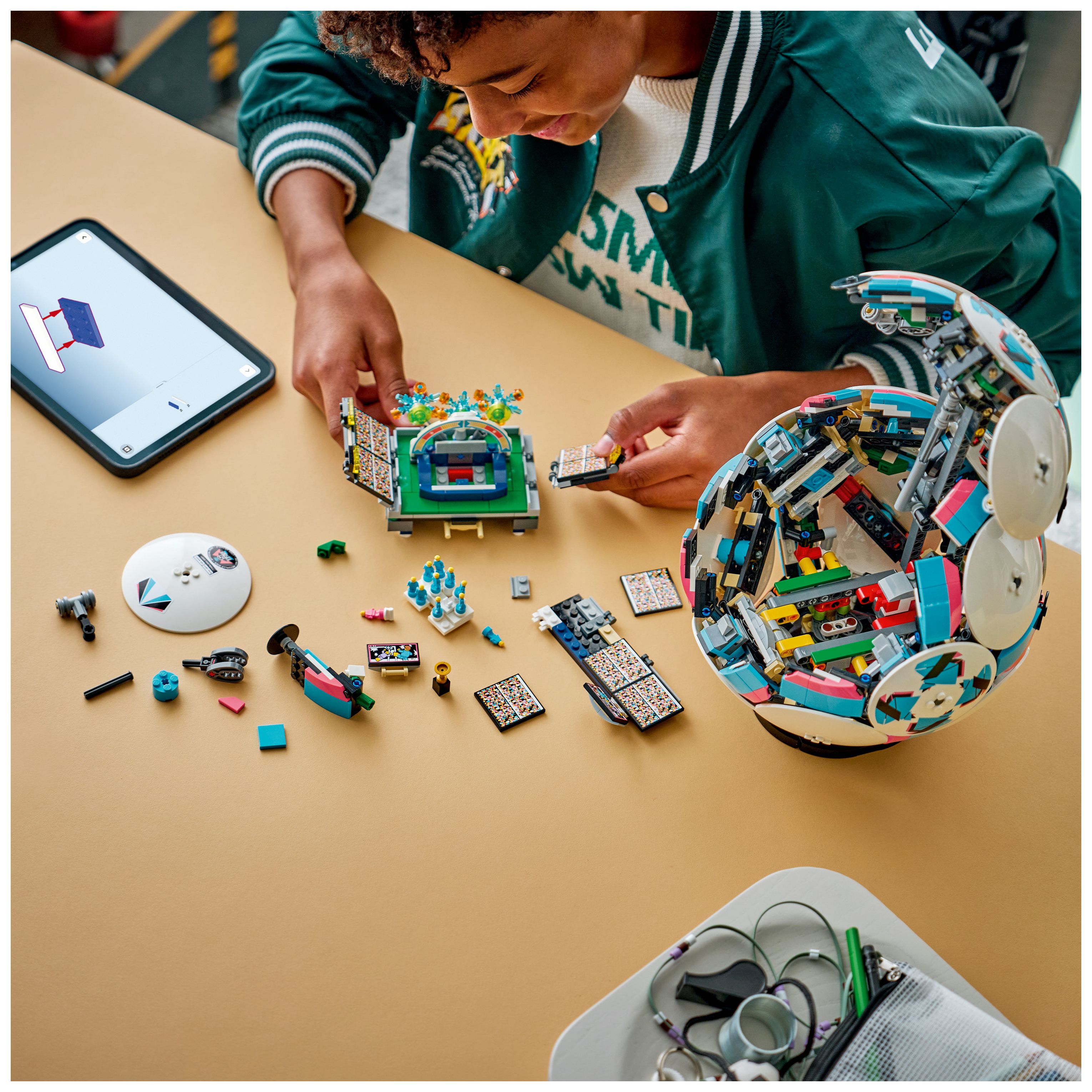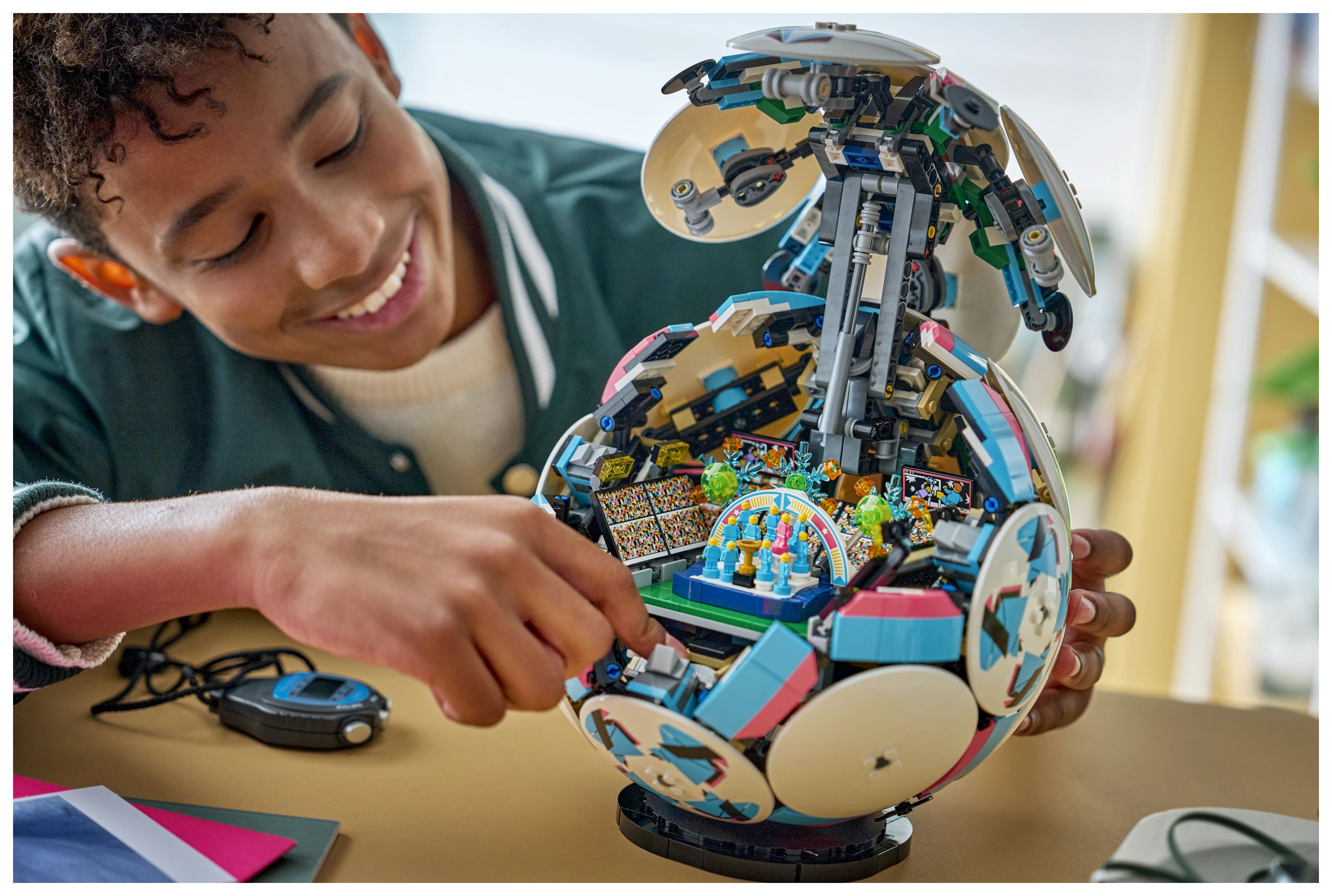 LEGO Technic Elemente verleihen dem Ball seine kugelrunde Form. Außen an dem Sammlerstück befinden sich 6 stylishe Dekoscheiben. Und in dem Ball kannst du eine spektakuläre Jubelszene im Mini-Stadion entdecken. Kinder müssen nur den Knopf drücken, um die Fußballspieler ihren Sieg mit einem Feuerwerk feiern zu lassen. Ein kleiner goldener Spielzeugpokal in der Mitte der Stadions sowie Großbildschirme sind weitere coole Details.