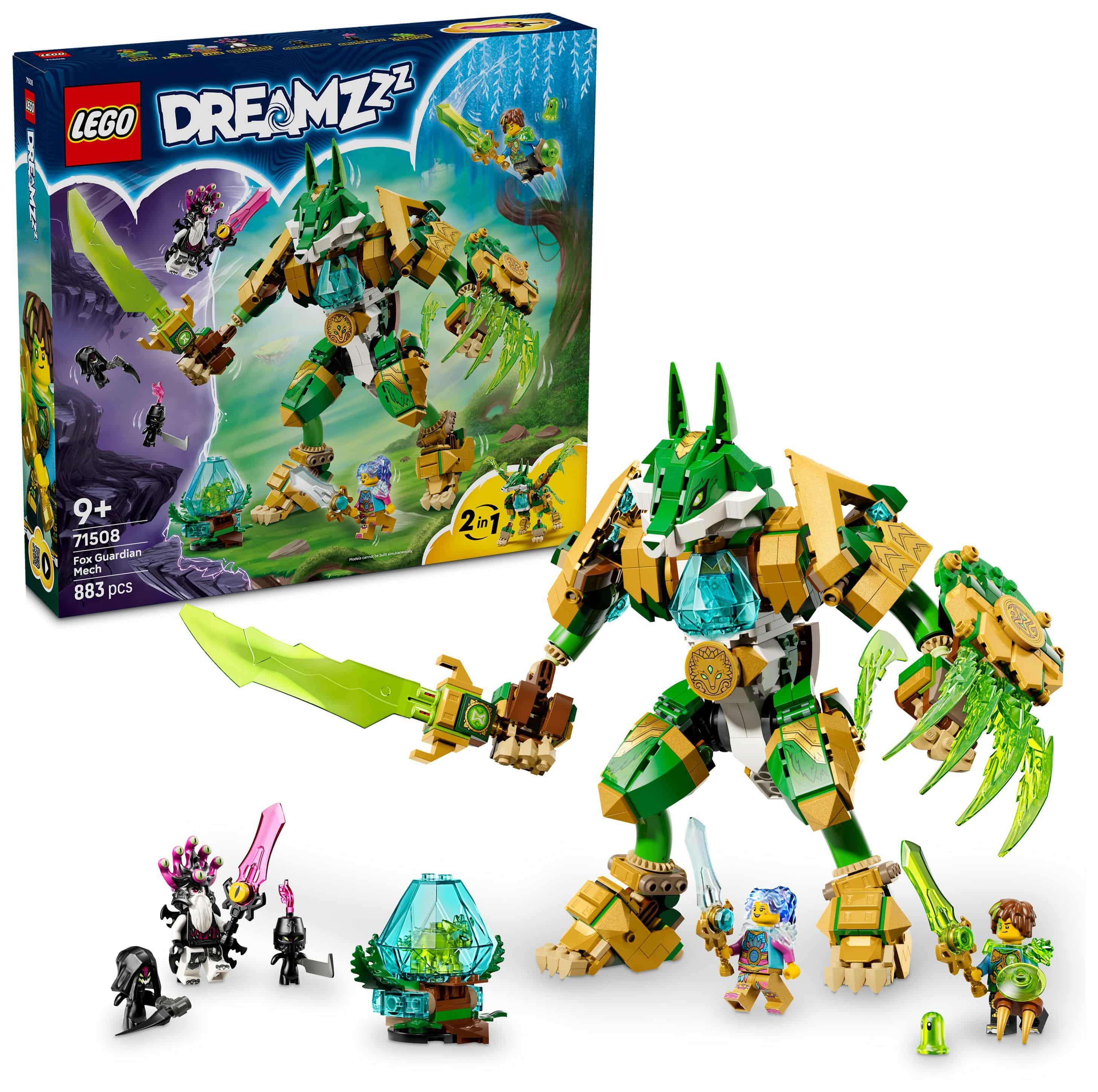 Junge Träumer können entweder einen mächtigen, auf zwei Beinen stehenden Fuchs-Mech mit Schwert und Schild oder einen majestätischen Fuchs-Wächter auf vier Beinen und mit Flügeln erschaffen. Bauspaß ist auf jeden Fall garantiert. Mateo, Izzie und der Albtraumkaiser laden zu vielen Rollenspielen ein. Jede dieser Minifiguren hat ein eigenes farblich zu ihr passendes Schwert. Kinder werden auch mit großer Begeisterung die beiden Albgnome, Z-Blob und das Diamant-Ei entdecken, aus dem eine Grüne Schatzkreatur schlüpft.
