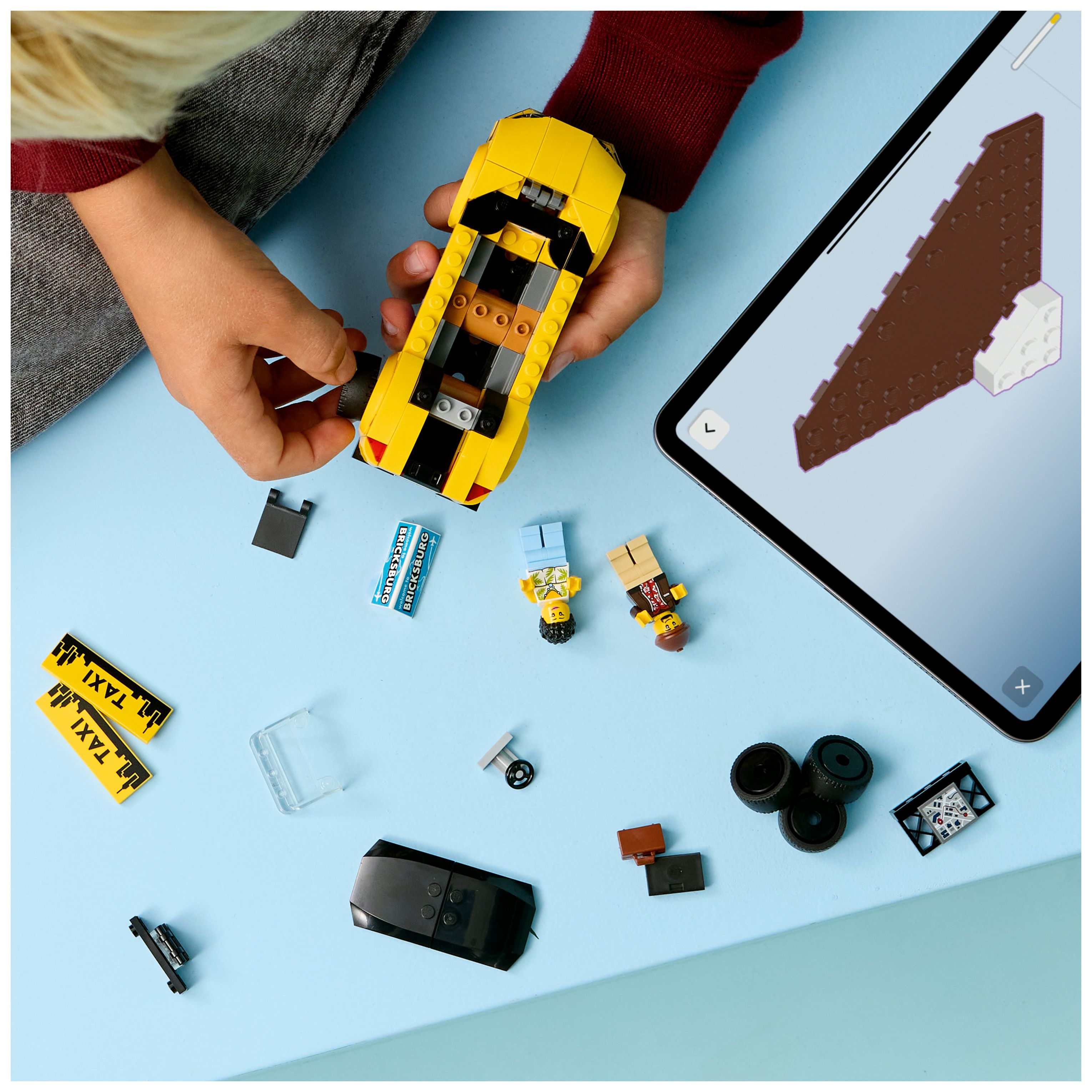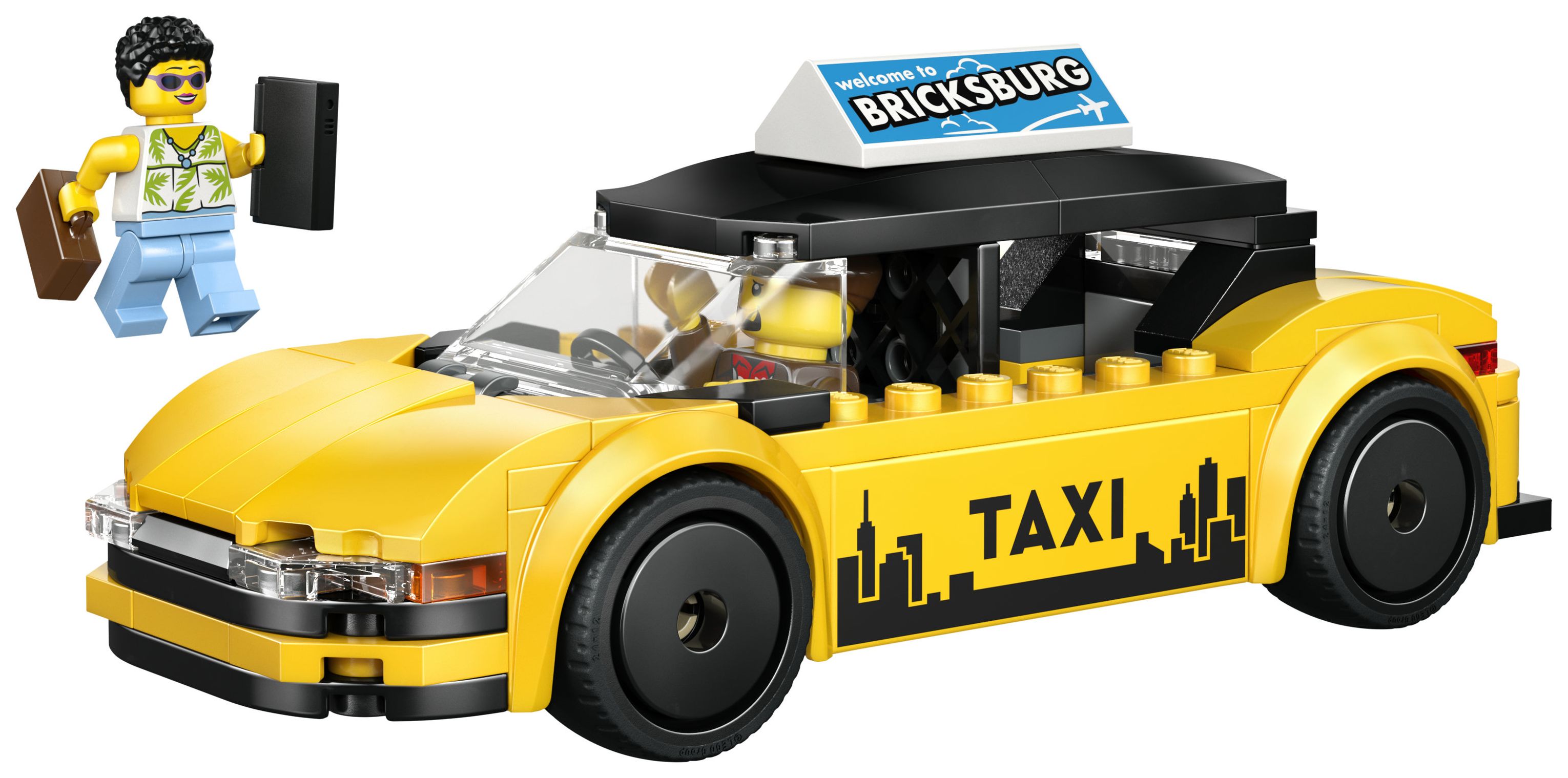 COOLE AUFKLEBER UND MINIFIGUR-ZUBEHÖR: Aufkleber stellen ein Navi-Display, ein Taxi-Logo, Werbung und einen Akku dar. Die Minifigur, die vom Taxi abgeholt wird, hat auch Gepäck dabei