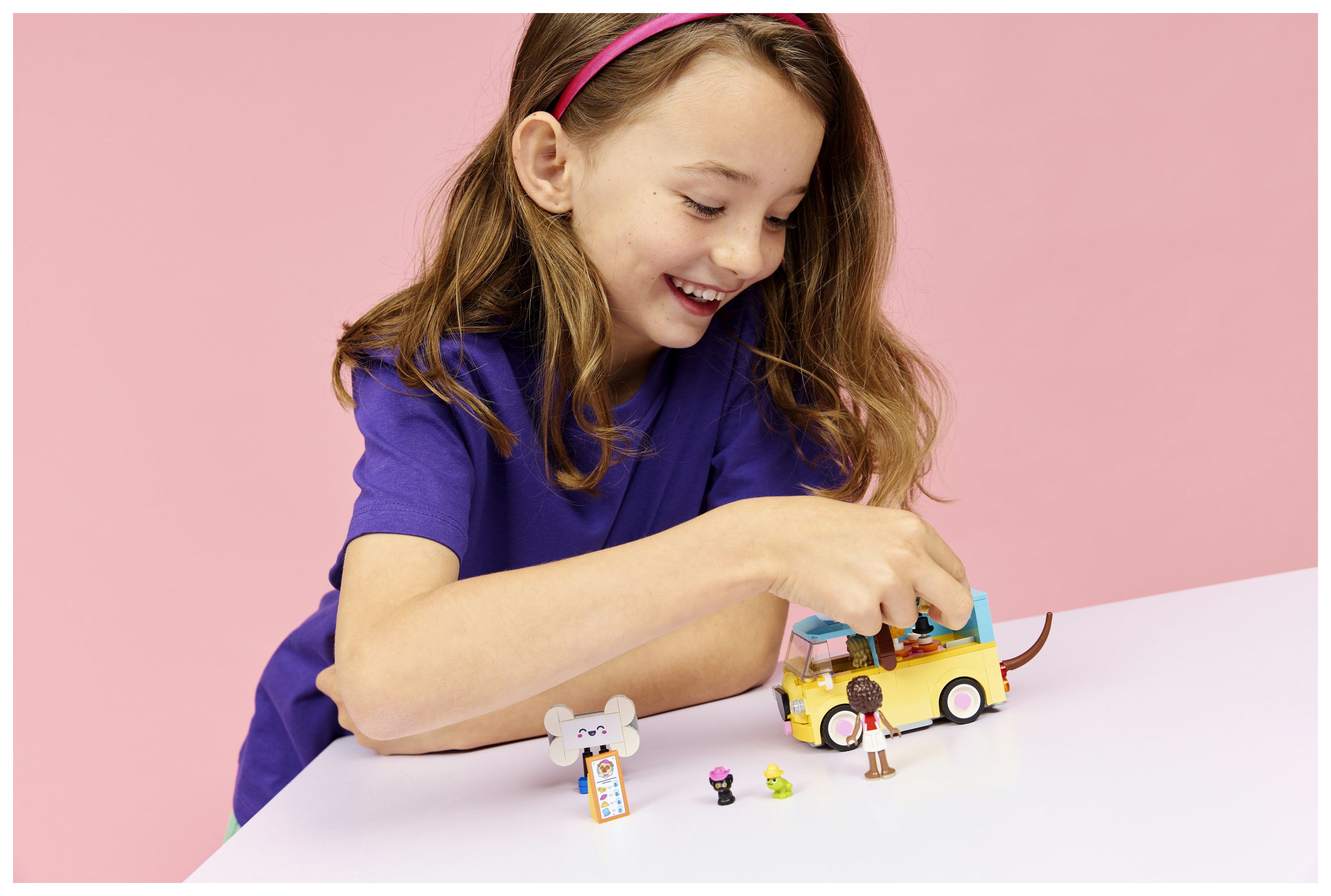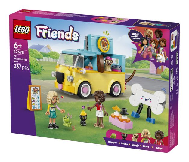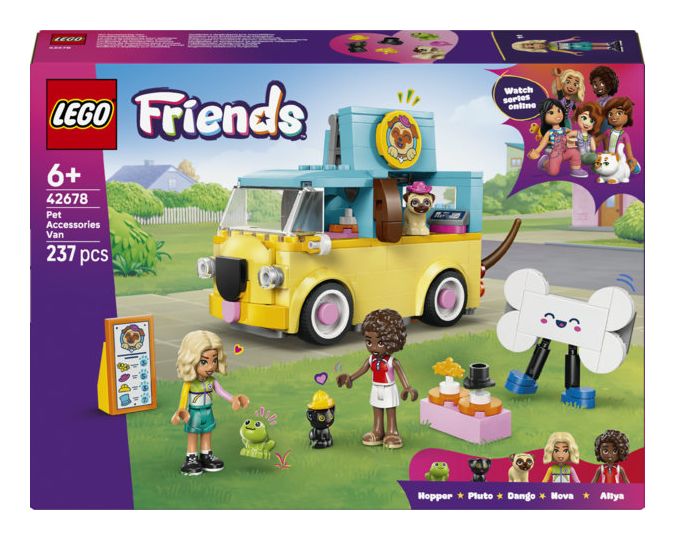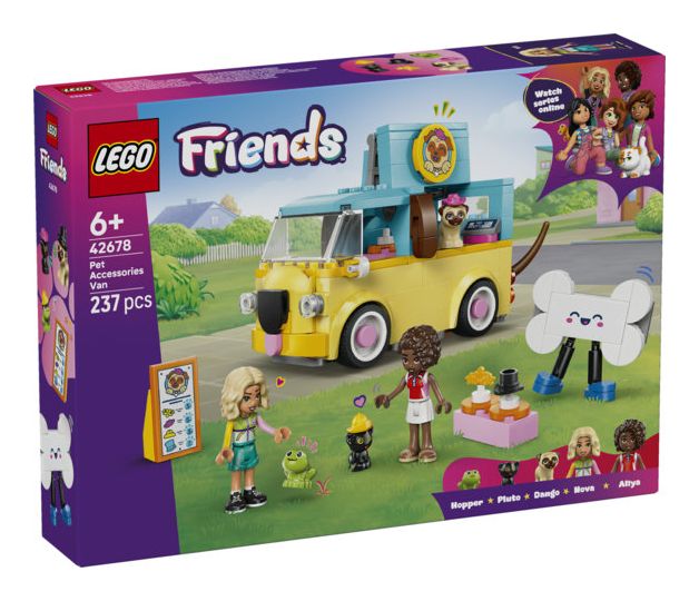 Der LEGO® Friends Haustierzubehör-Van (42678) ist ein Spielzeug, das kleine Tierfans fantasievoll spielen lässt. Kinder ab 6 Jahren können den Van beladen, die Accessoires ausstellen und eine Tiermodeschau veranstalten.
