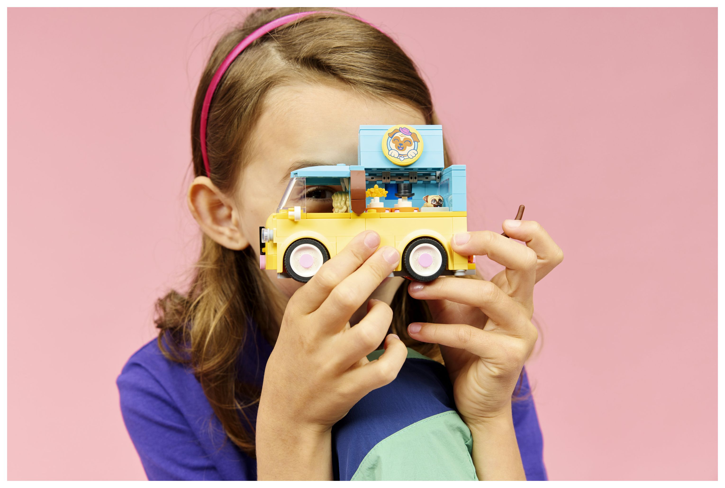 MOPS-VAN: Freu dich darauf, mit dem bezaubernden LEGO® Friends Haustierzubehör-Van (42678) Waren auszuliefern. Der Lieferwagen hat ein putziges Welpengesicht und einen Schwanz, der beim Fahren wedelt