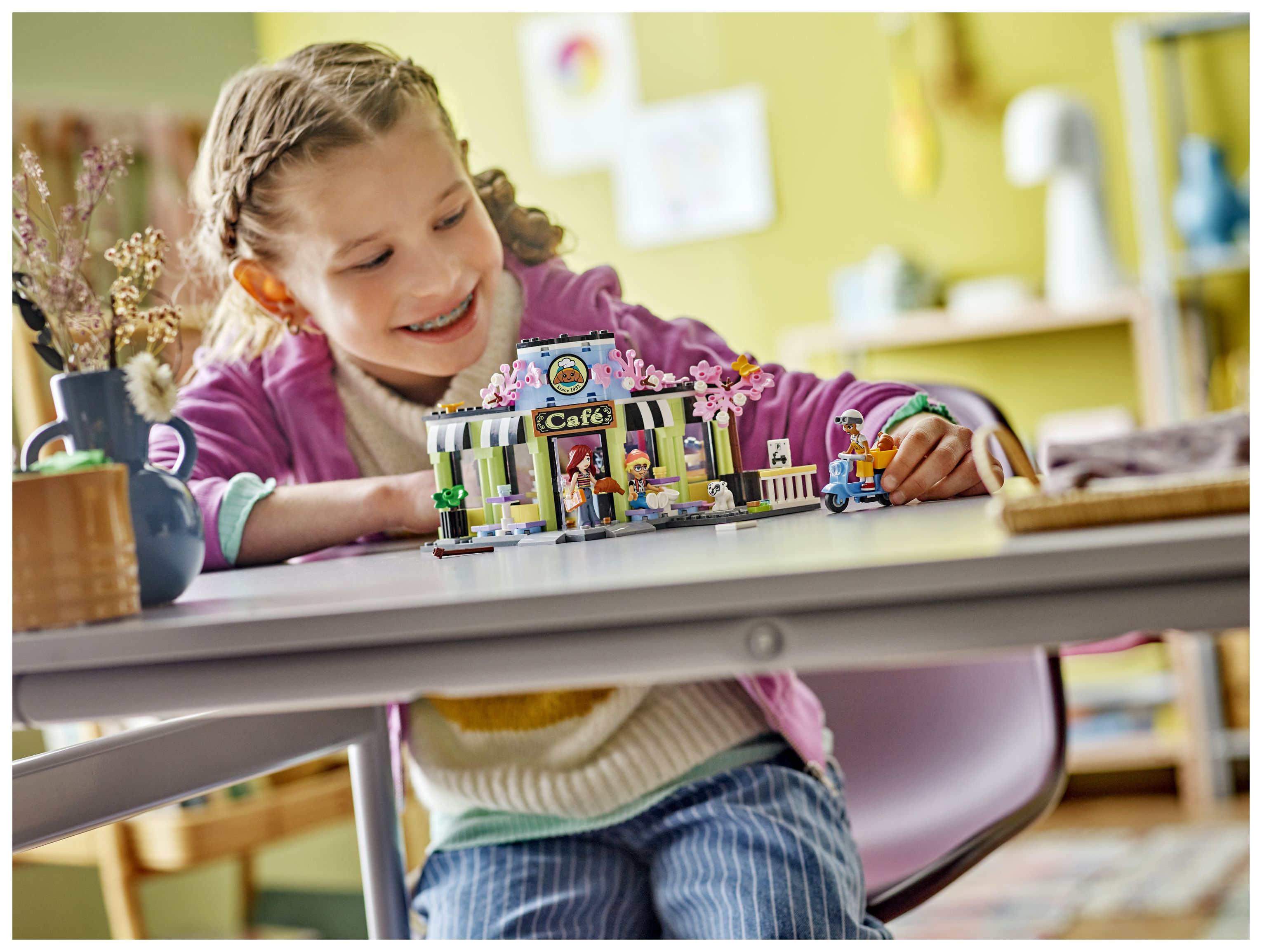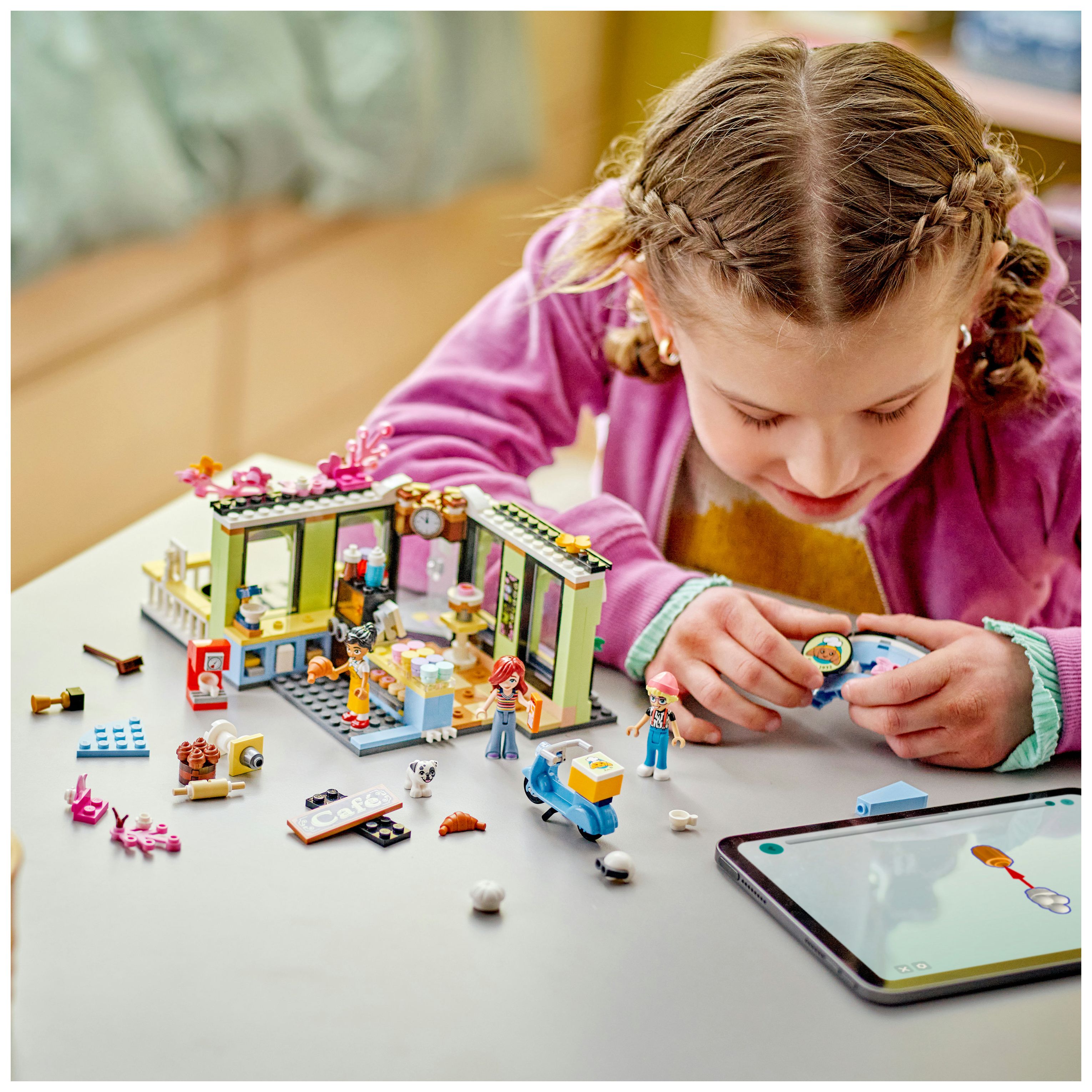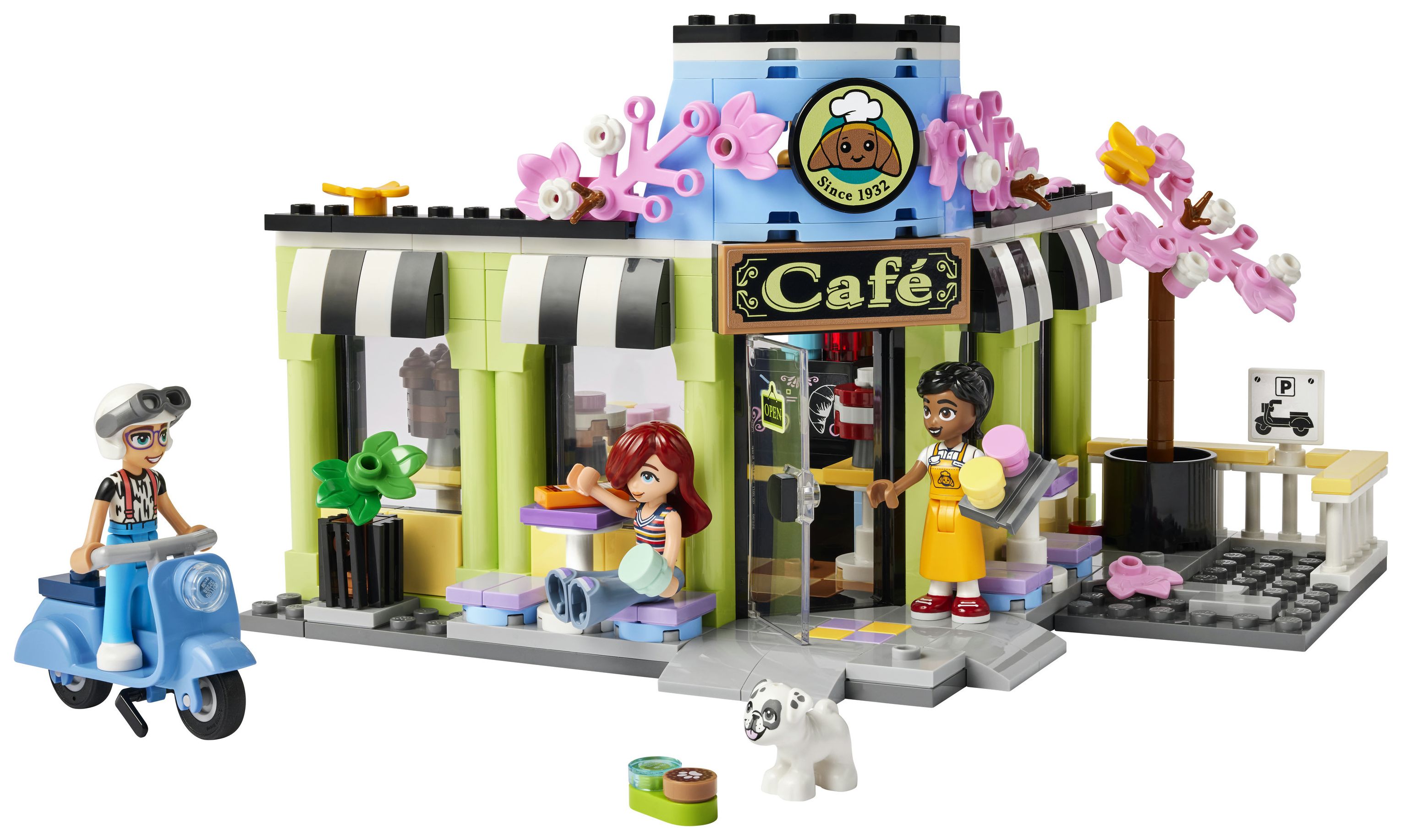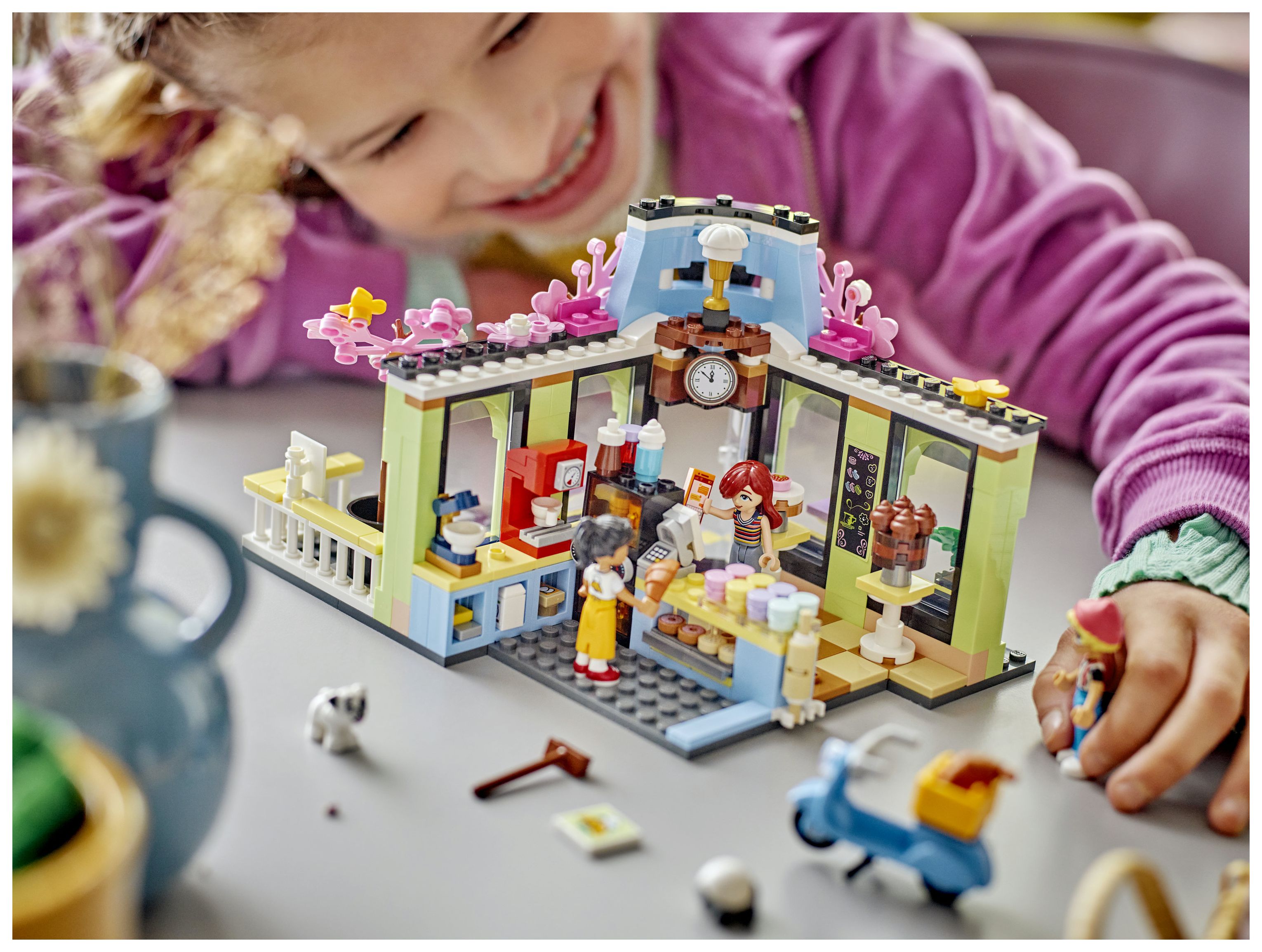 Kinderspielzeug für Rollenspiele im Café: Das Heartlake City Café ist ein Bauset für Mädchen und Jungen ab 6 Jahren. 3 Spielfiguren, ein Hund, Küchenutensilien und ein Roller lassen Kinder fantasievoll spielen
