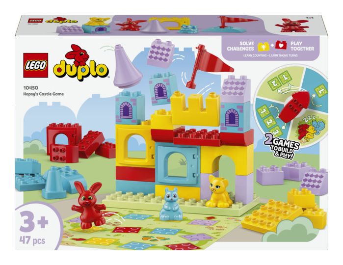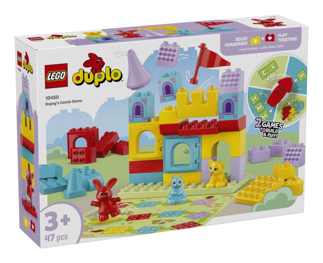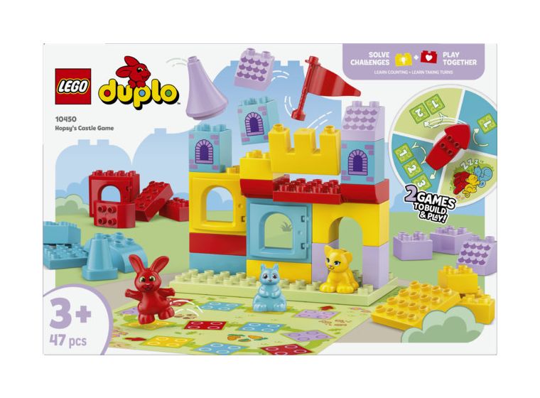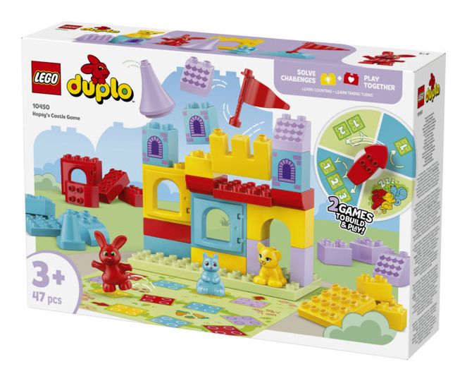 LEGO® DUPLO® Hopsys Burgspiel (10450) ist ein 2-in-1-Brettspiel für jede Menge Familienspaß, bei dem dein Kleinkind ganz spielerisch lernt. Kleinkinder können sich in ein LEGO DUPLO Lernabenteuer stürzen und bei 2 lustigen Spielen das Zählen und Farbensortieren üben.