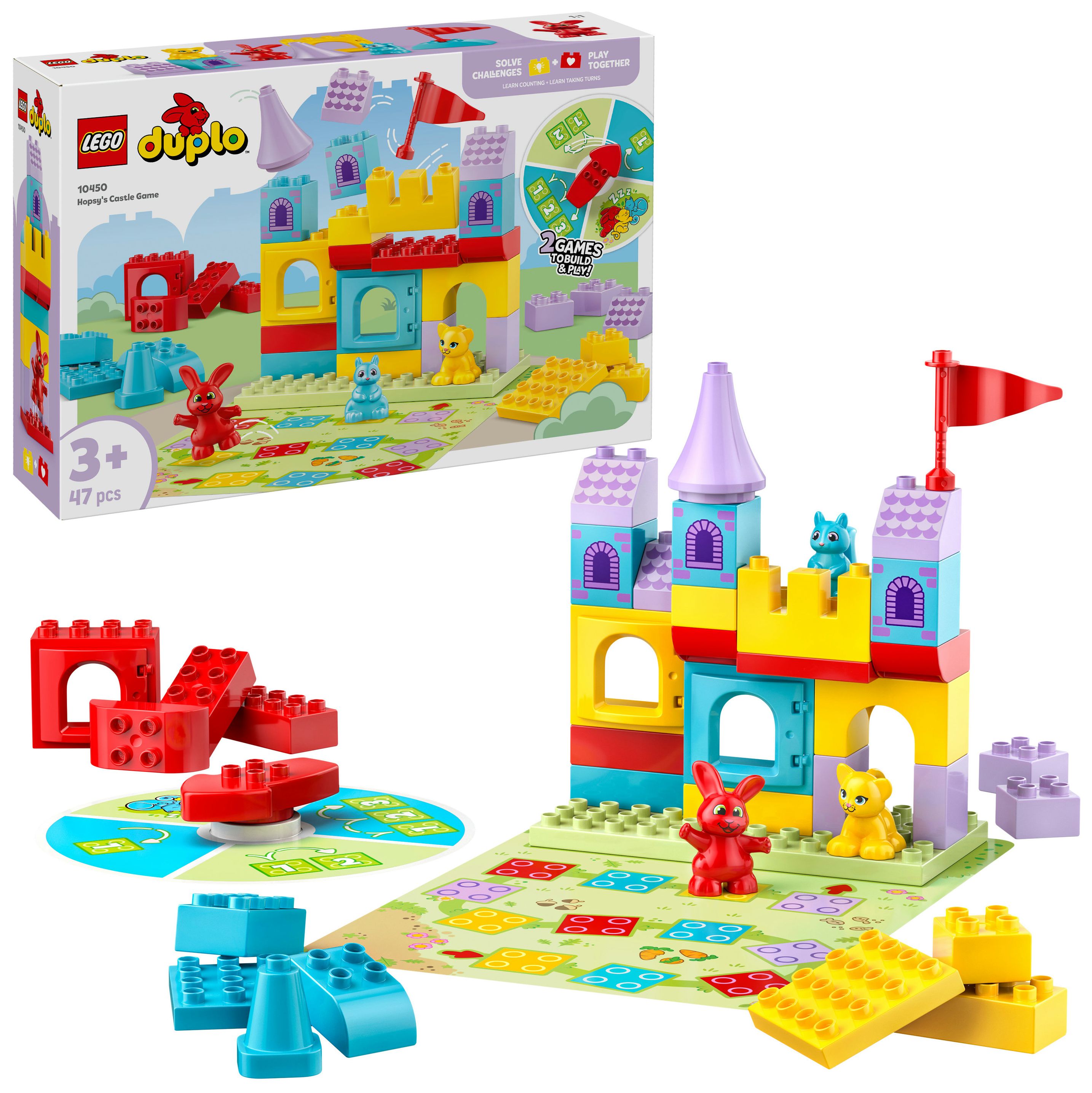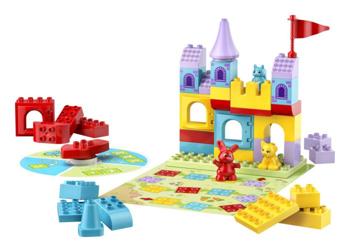 Bauspielzeug, das Kinder spielerisch lernen lässt: LEGO® DUPLO® Hopsys Burgspiel ist ein 2-in-1-Brettspiel für lustige Familienaktivitäten, bei denen Vorschulkinder sehr viel lernen können