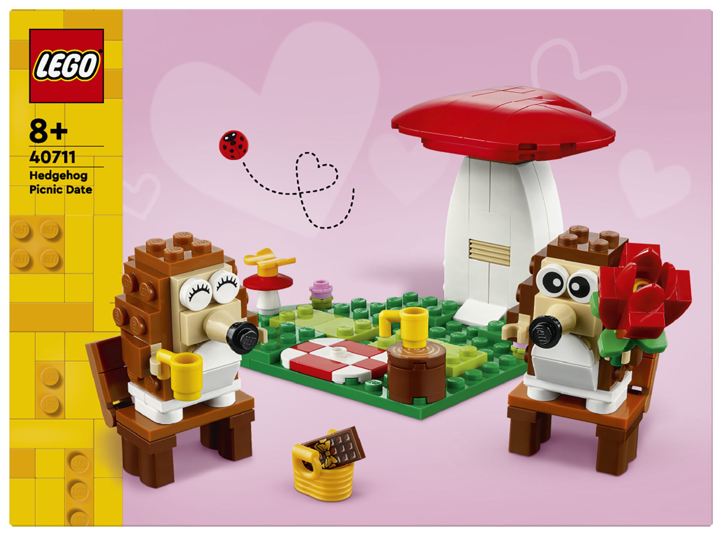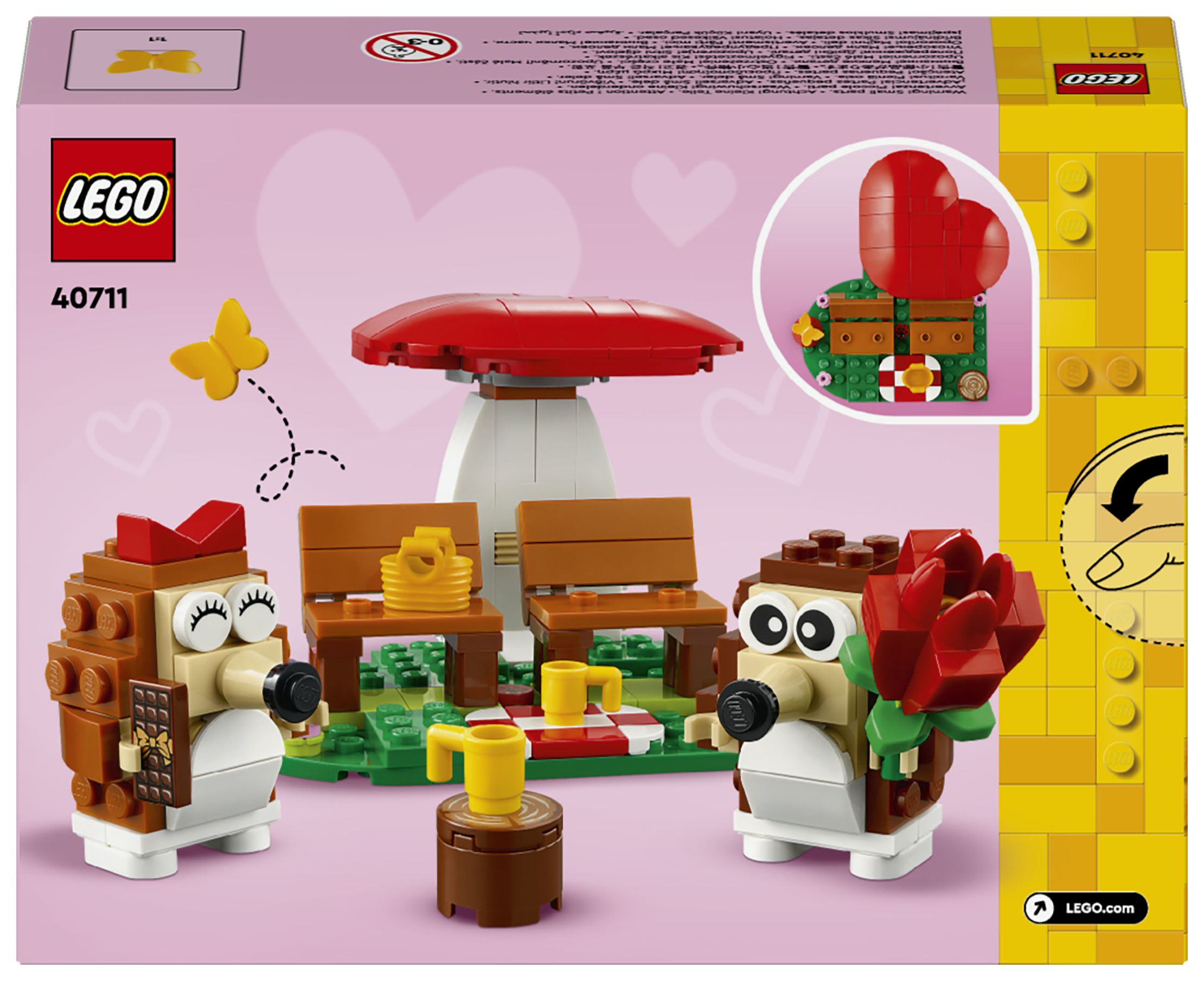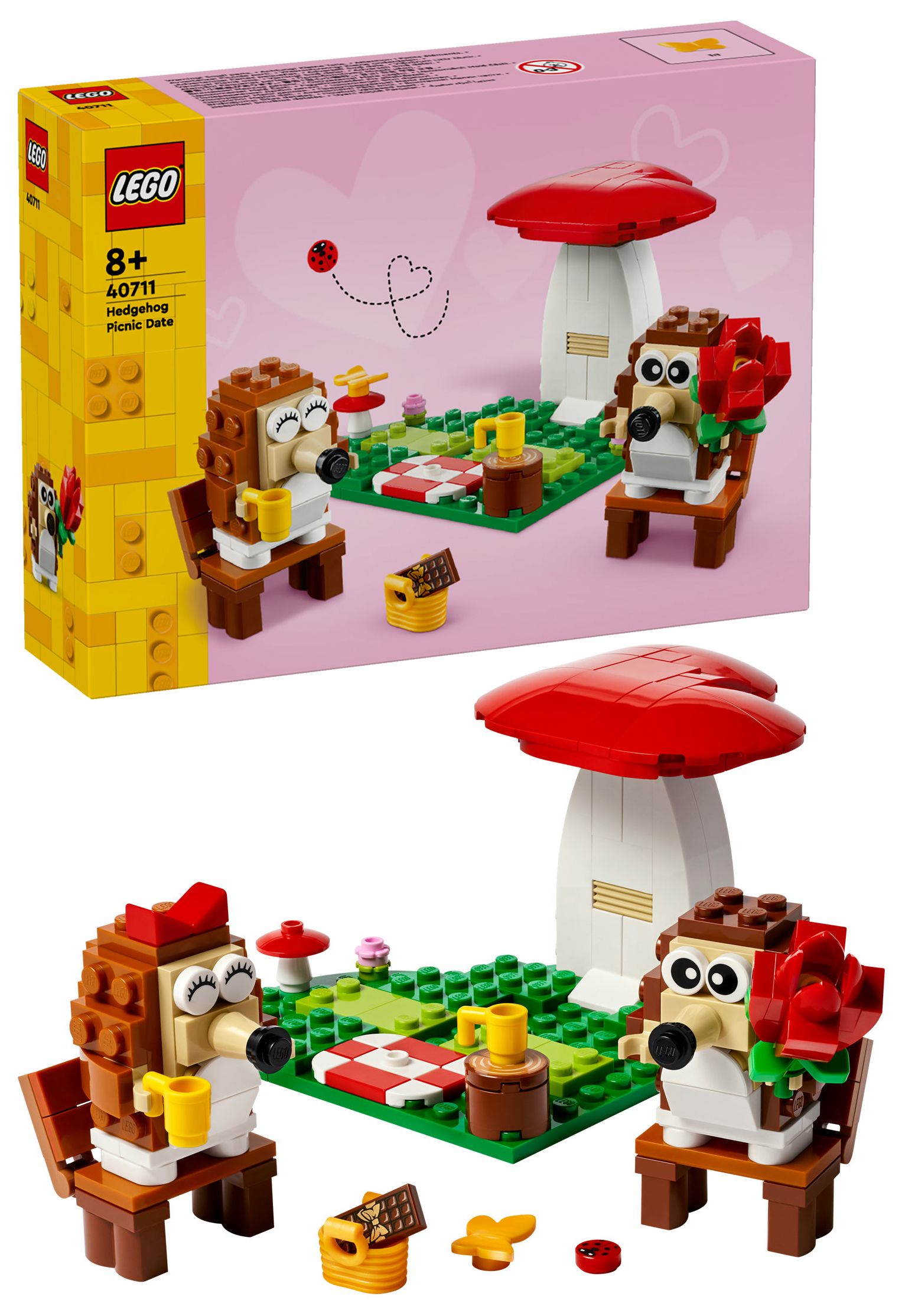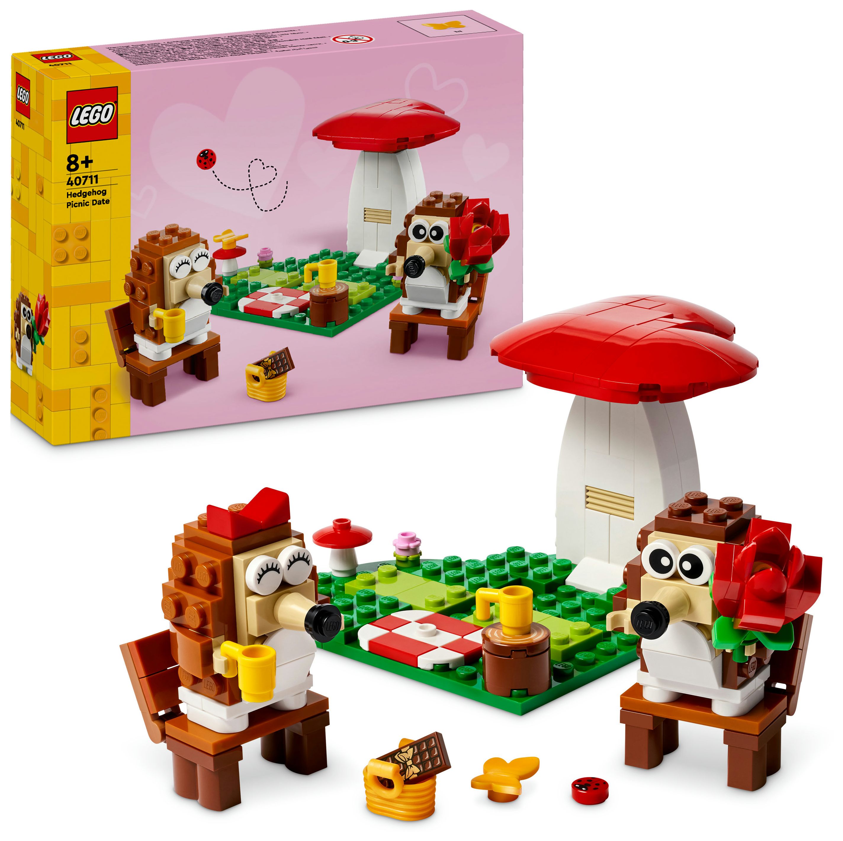 LEGO® Igel und ihr Picknick-Date (40711) ist ein zauberhaftes Bau- und Spielset mit niedlichen Tieren und coolen Funktionen. Mit diesem Set kannst du viele besondere Anlässe feiern. Dieses Set zum Bauen, Spielen und Ausstellen beinhaltet 2 Igel, die unter einem herzförmigen Pilz auf einer herzförmigen Wiese sitzen. Mit diesem Set können Jungen und Mädchen ab 8 Jahren viele Geschichten darstellen.