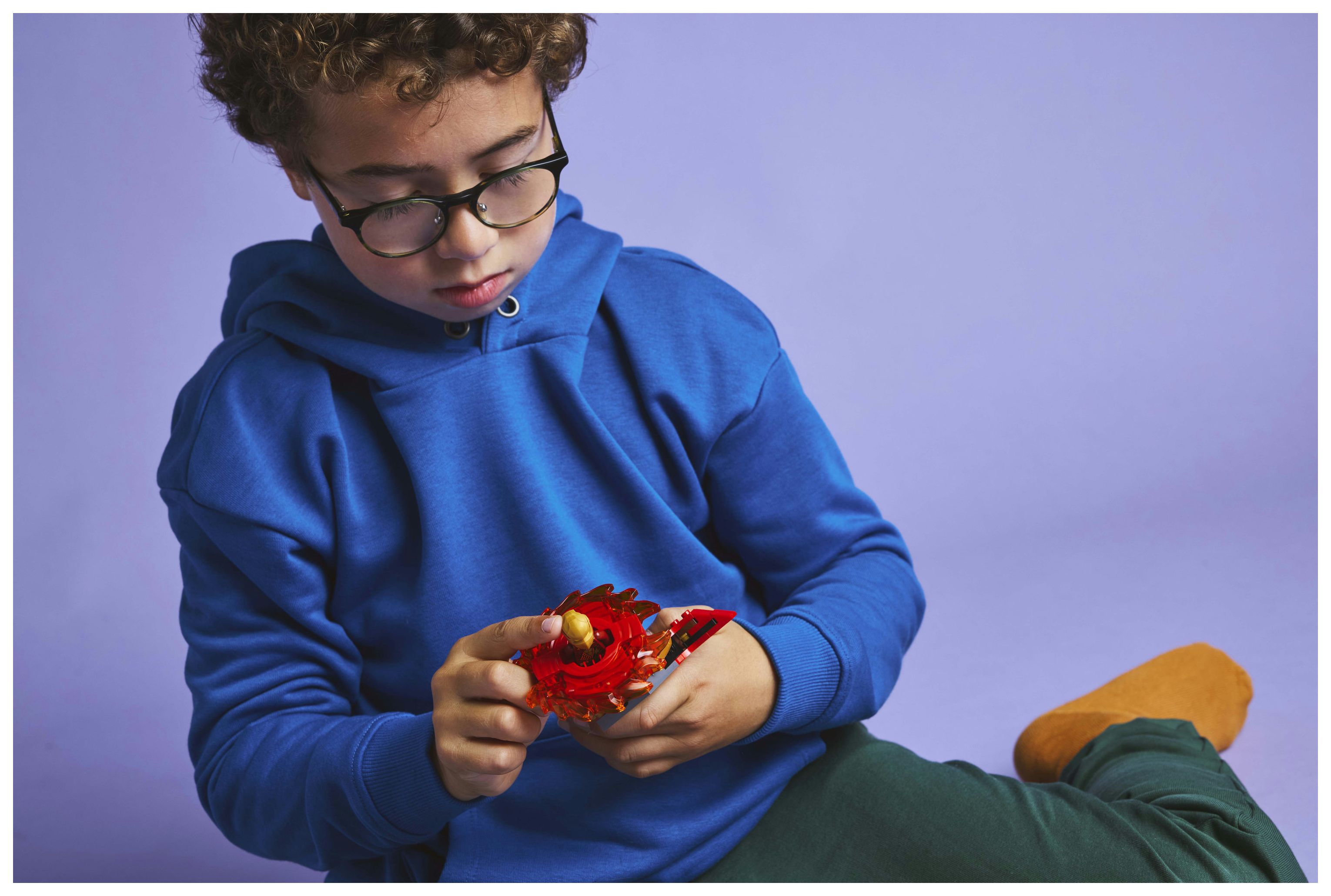 Spielzeug-Spinner für rasanten Actionspaß: Drück den Knopf am Startkatapult von Kais Drachen-Spinjitzu-Spinner, um das Spielzeug loswirbeln und beim Aufprall auf das Ziel 2 Energie-Elemente abplatzen zu lassen