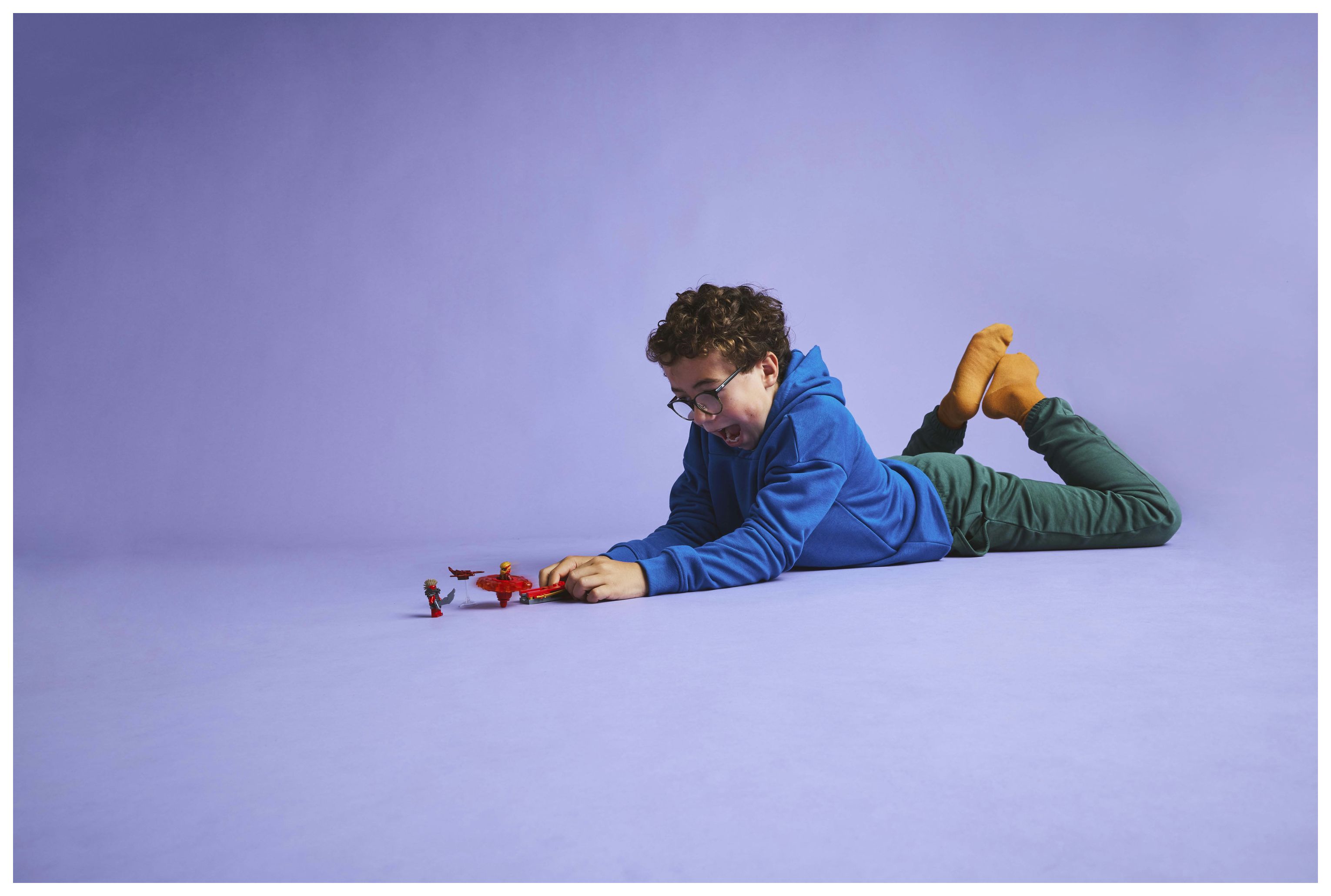 Das Abenteuer-Spielset beinhaltet das Modell einer kleinen Drachenkreatur und 2 Minifiguren. Kai trägt ein Schwert und sitzt im Drachen-Spinjitzu-Spinner. Der böse Drachenspäher schwingt dagegen eine Axt. Diese beliebten NINJAGO Charaktere laden Kinder zu actionreichen Rollenspielen und spannenden Duellen zwischen Gut und Böse ein.