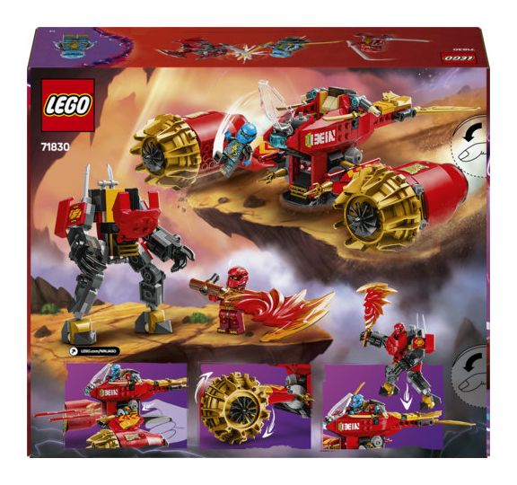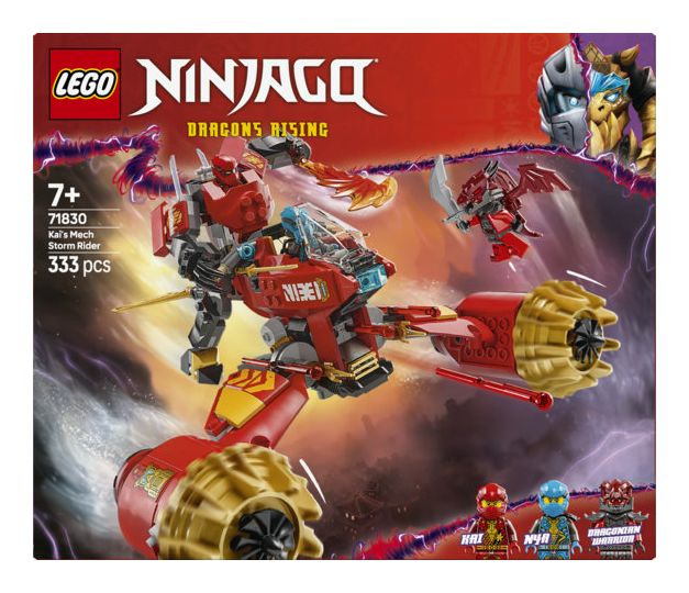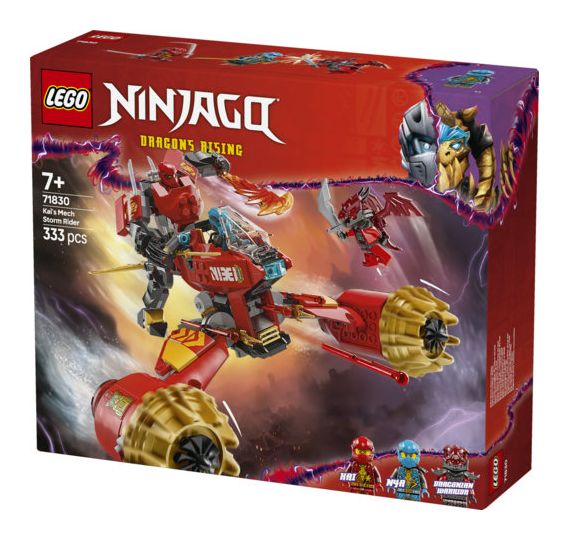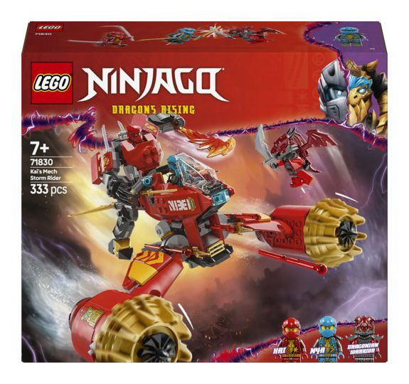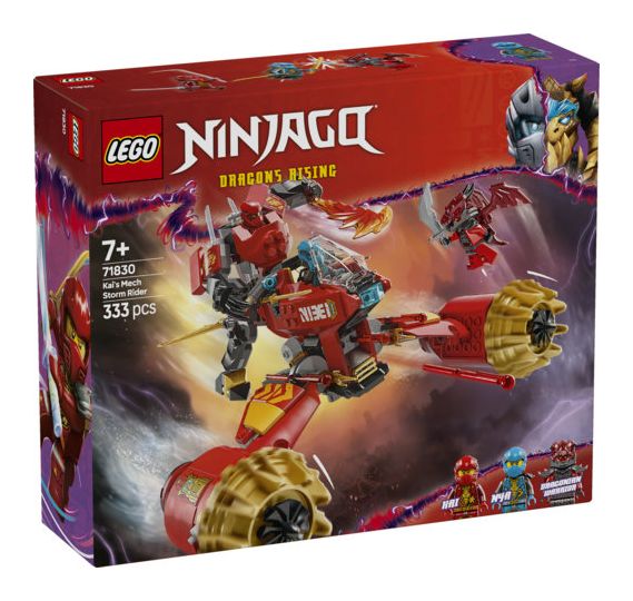 Kais Sturmreiter-Mech (71830) lässt Jungen und Mädchen ab 7 Jahren atemberaubende Szenen aus der TV-Serie NINJAGO® Aufstieg der Drachen nachstellen. Kinder können mit der großen Actionfigur spielen und den Mech dann in zwei kleinere Modelle zerteilen. Kais Mech hat ein Cockpit sowie ein große Sturmklinge und kann Kopf, Arme und Beine bewegen. Nyas fliegendes Motorrad hat neben einem Cockpit auch noch bewegliche Flügel und 2 Shooter mit Federmechanismus.