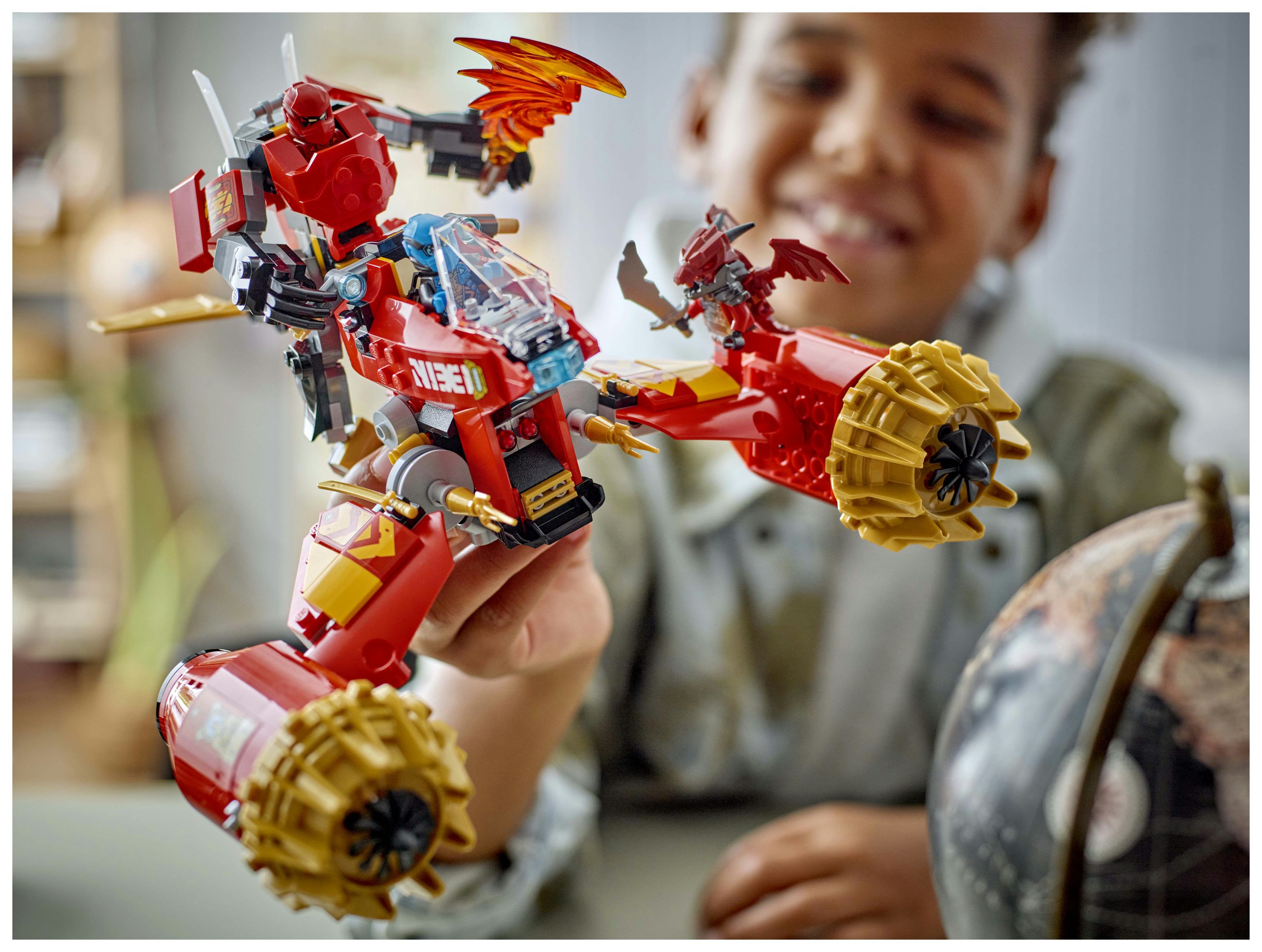 Ninja-Kombi-Mech: Dieses große NINJAGO® Actionspielzeug lässt sich in 2 kleinere Modelle zerteilen. Kais Mech und Nyas fliegendes Motorrad bieten Kinder noch viele weitere spannende Ninja-Abenteuer und Rollenspiele