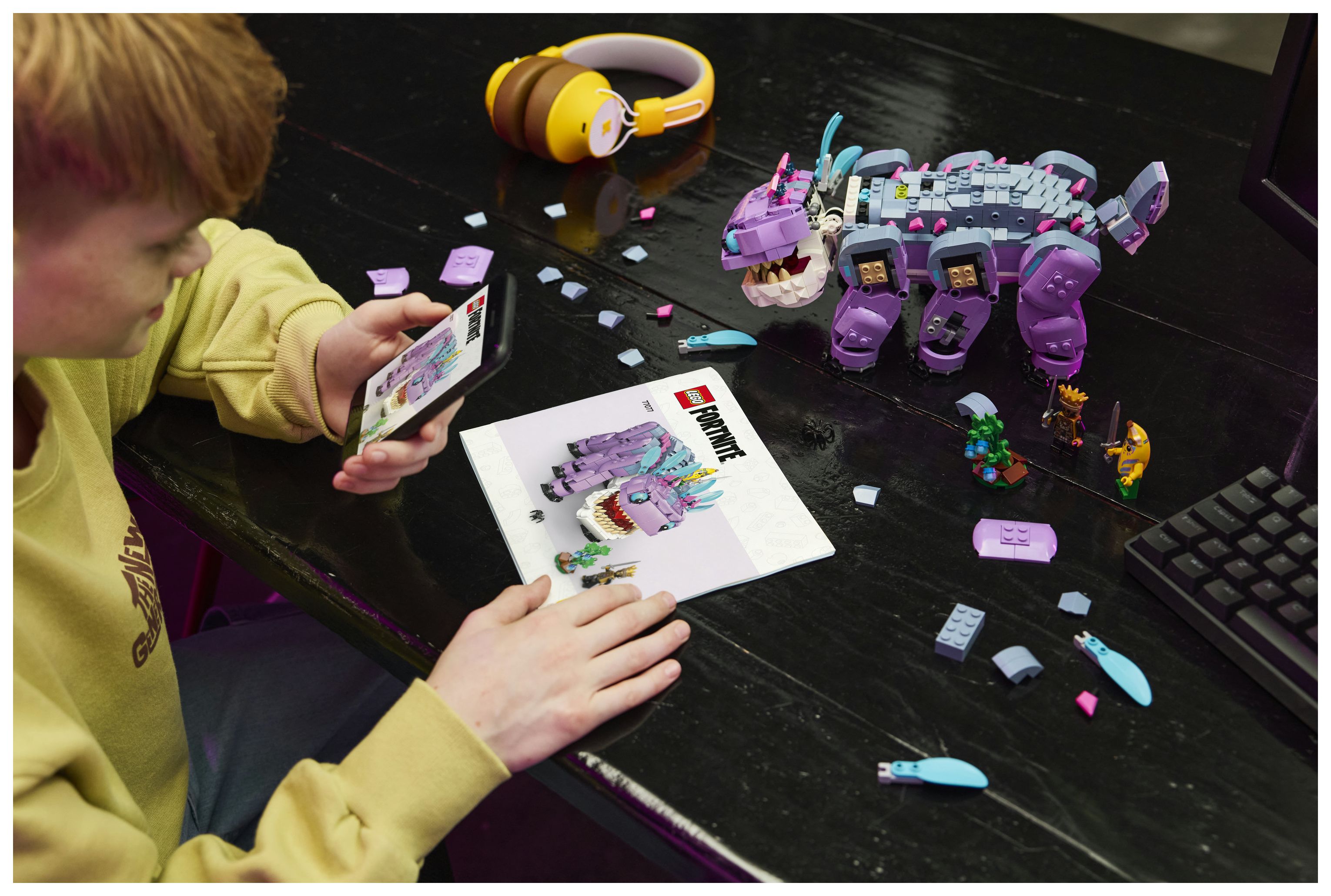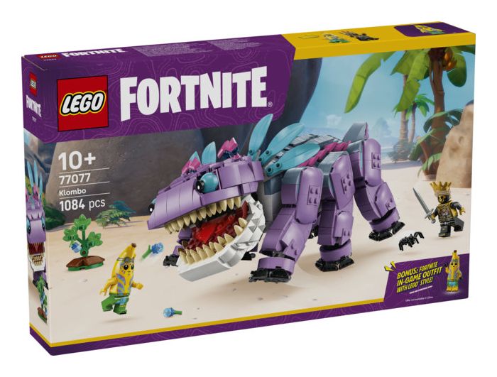 Klombo ist ein großes Monster aus dem Videospiel LEGO Fortnite. Dieses Bauset lässt Jungen und Mädchen das Monster mit LEGO Steinen nachbilden. Kinder bauen zunächst das Spielzeug zum Videospiel und entdecken dann all die coolen Details, beispielsweise die beweglichen Beine, das aufklappbare Maul und den drehbaren Schwanz. Zum Set gehört auch ein kleiner Klombeerstrauch mit abnehmbaren Klombeeren. Kinder können so tun, als würden sie Klombo ärgern und ihn dann mit Klombeeren besänftigen, um sich mit ihm anzufreunden. Für fantasievolle Rollenspiele kann man die Minifiguren Inselabenteuer-Schali und Aurum auf Klombos Rücken setzen.