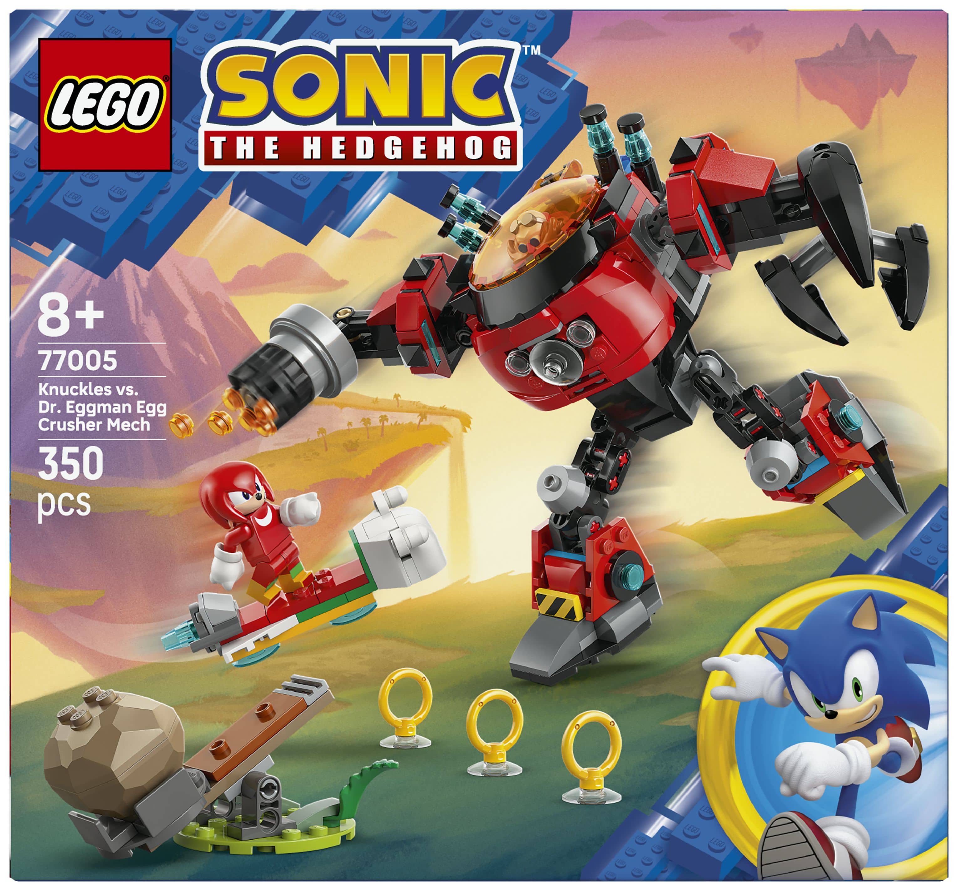 Knuckles vs. Dr. Eggmans Egg Crusher Mech (77005) ist ein LEGO® Sonic the Hedgehog™ Set mit vielen Details und Funktionen für Jungen, Mädchen und Sonic-Fans ab 8 Jahren, die spannende Abenteuer lieben. Für ein interaktives Spielerlebnis verfügt der bewegliche Spielzeug-Mech über ein aufklappbares Cockpit, eine drehbare 6-schüssige Kanone, eine gewaltige drehbare Pranke und gelenkige Glieder. 2 Charaktere, Knuckles The Echidna und Dr. Eggman, laden ebenso zu packenden Rollenspielen ein wie das Hoverboard, das Spielzeugkatapult mit 2 Felsbrocken, 3 Goldringe und 2 Chaos Emeralds.