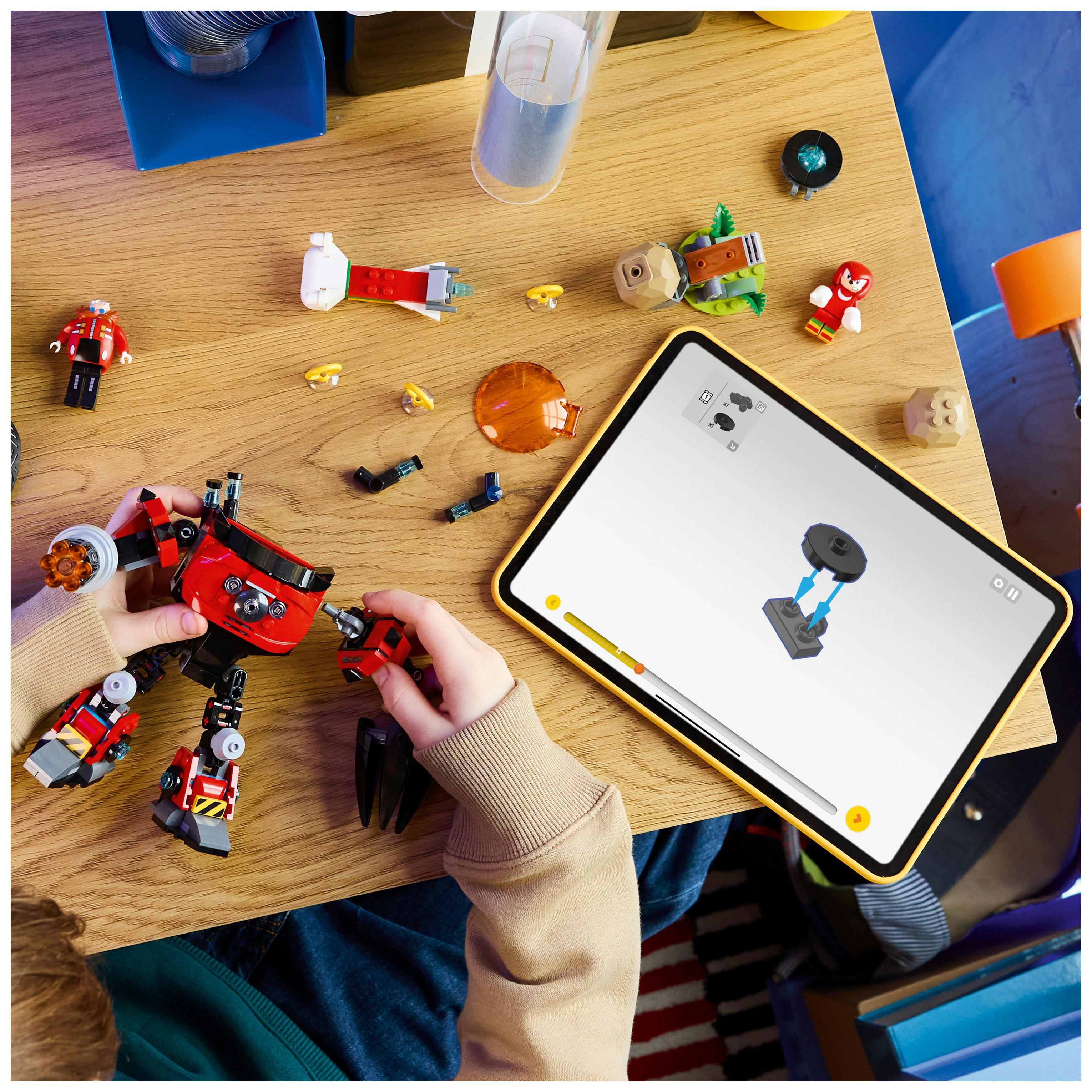 Dr. Eggmans Mech: Ein baubarer beweglicher Mech, ein Hoverboard und ein Katapult mit 2 Felsbrocken sowie Knuckles und Dr. Eggman laden Kinder zu vielen Rollenspielen ein