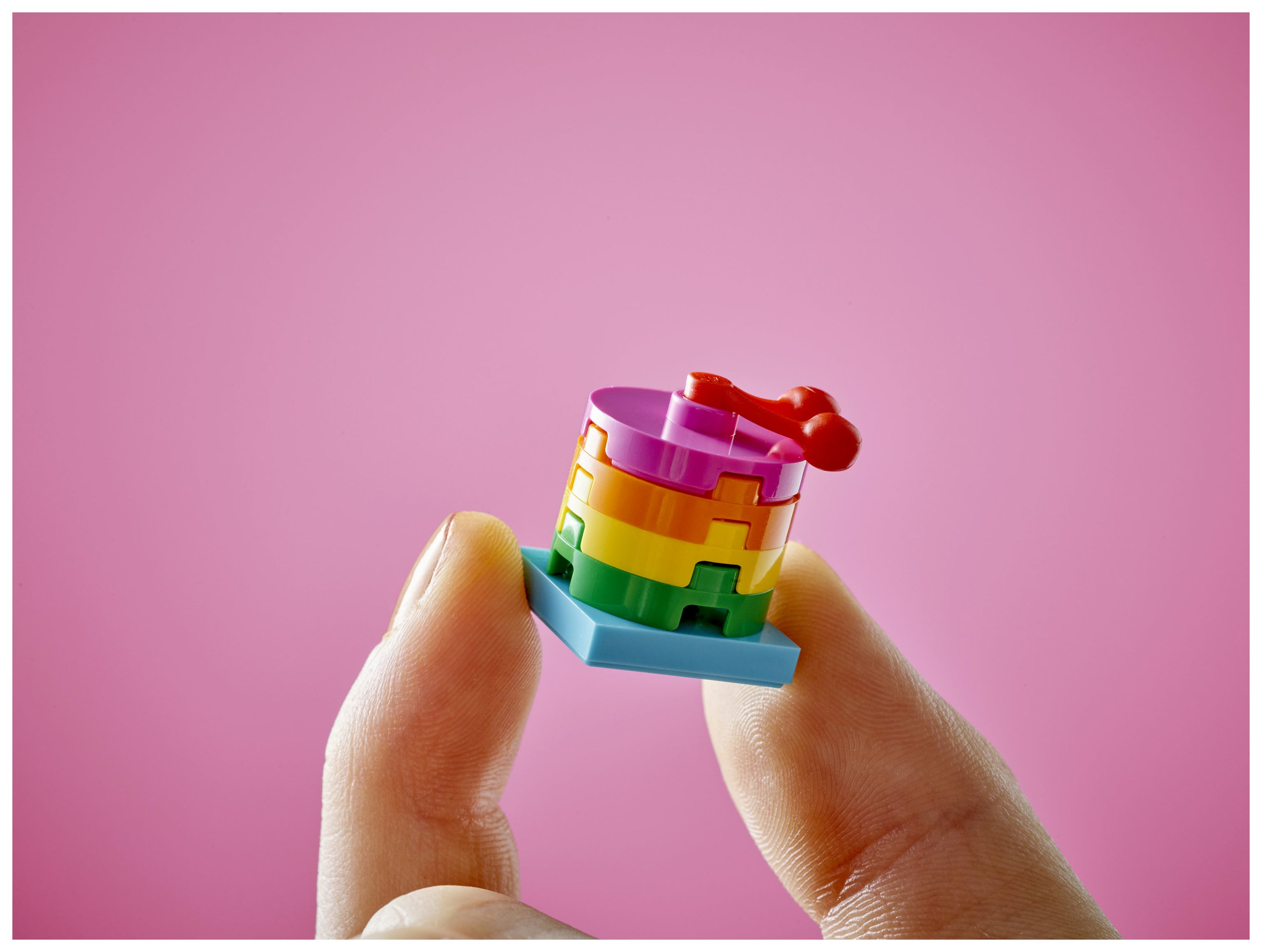 Zubehör für eine Kostümparty: Das LEGO® Spielset beinhaltet jede Menge Zubehör für lustige Rollenspiele. Hierzu zählen eine Slush-Eis-Maschine, Torten, Getränke, Luftballons, Hüte, der Dreizack des Wassermanns, ein Feenzauberstab und Ähnliches