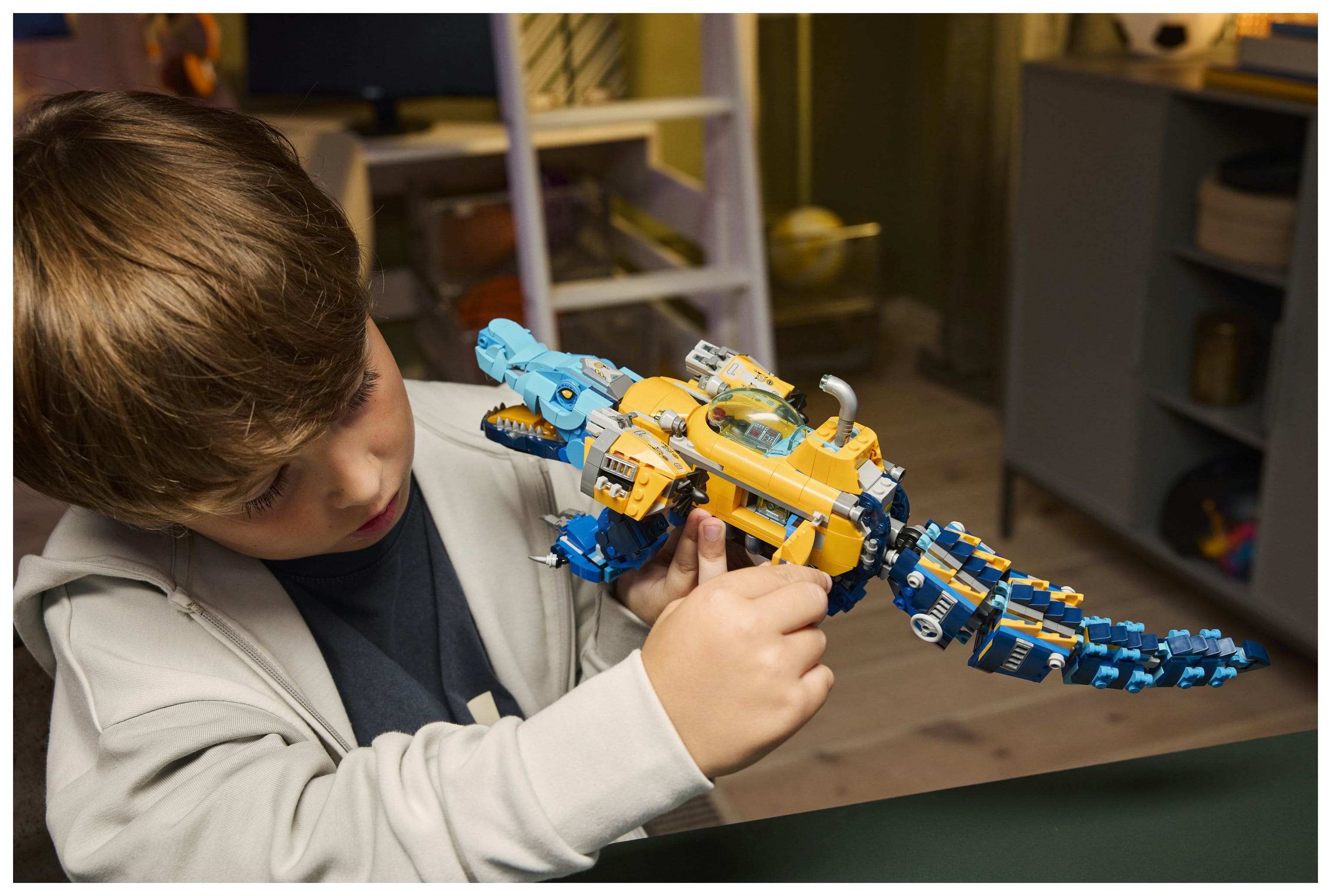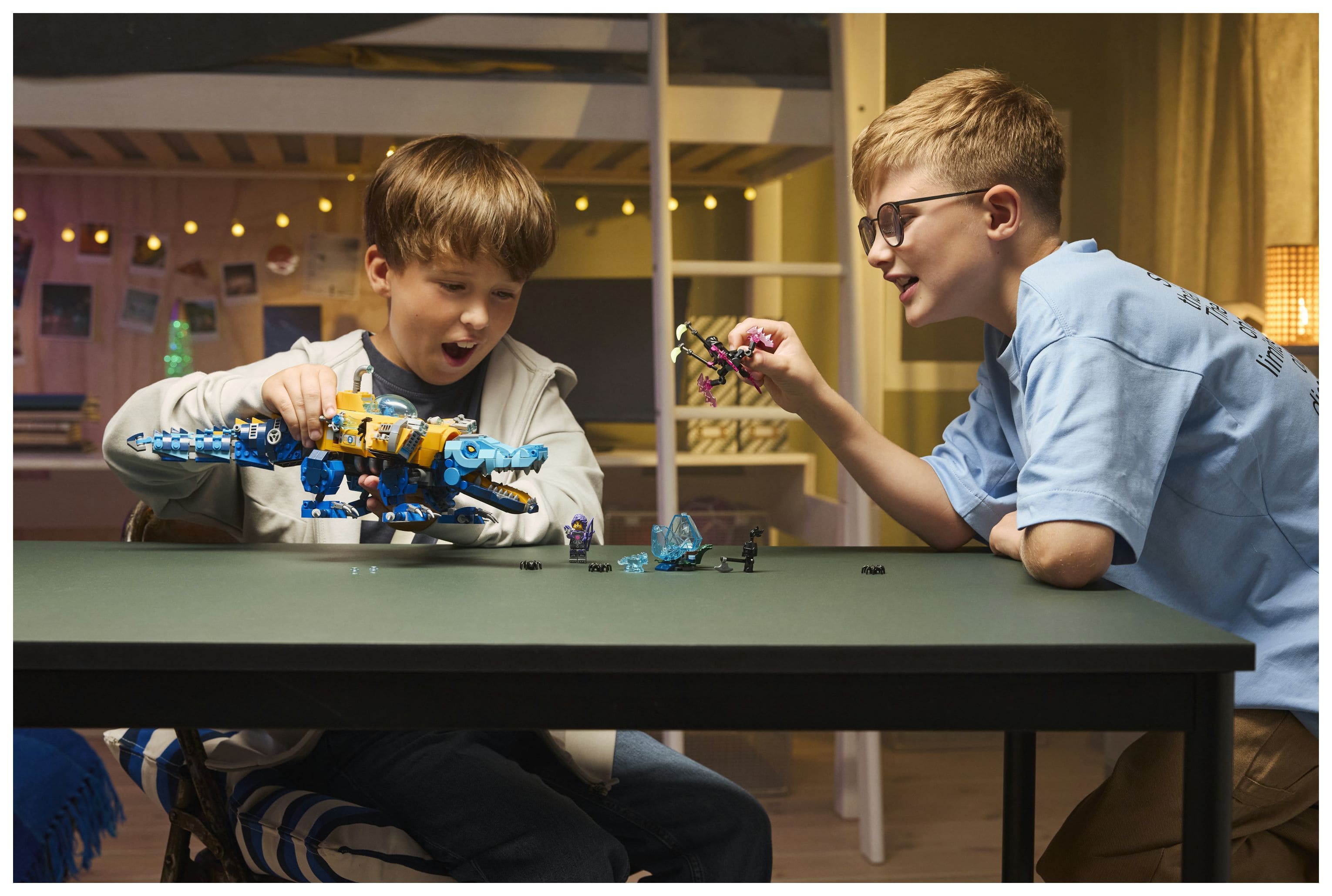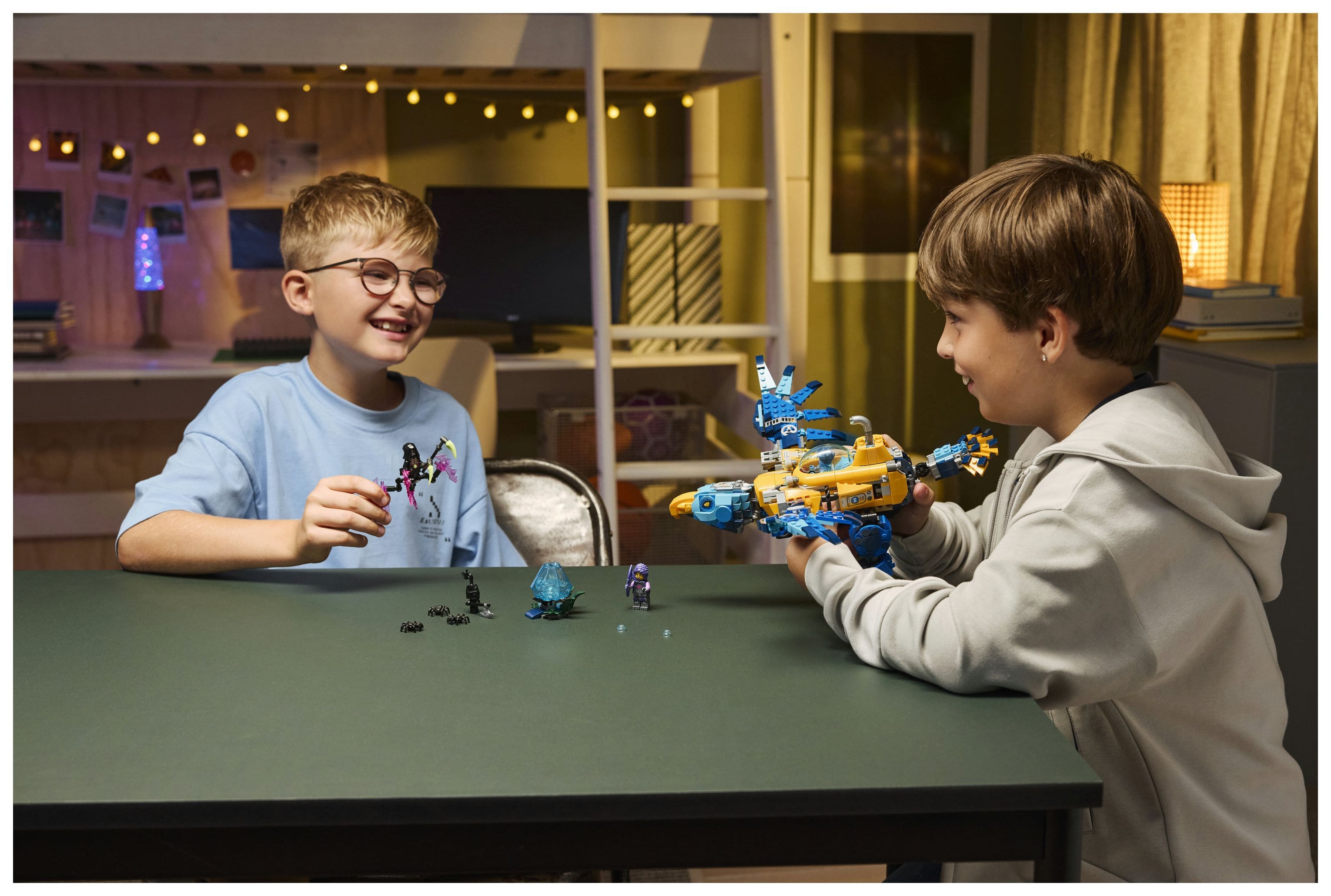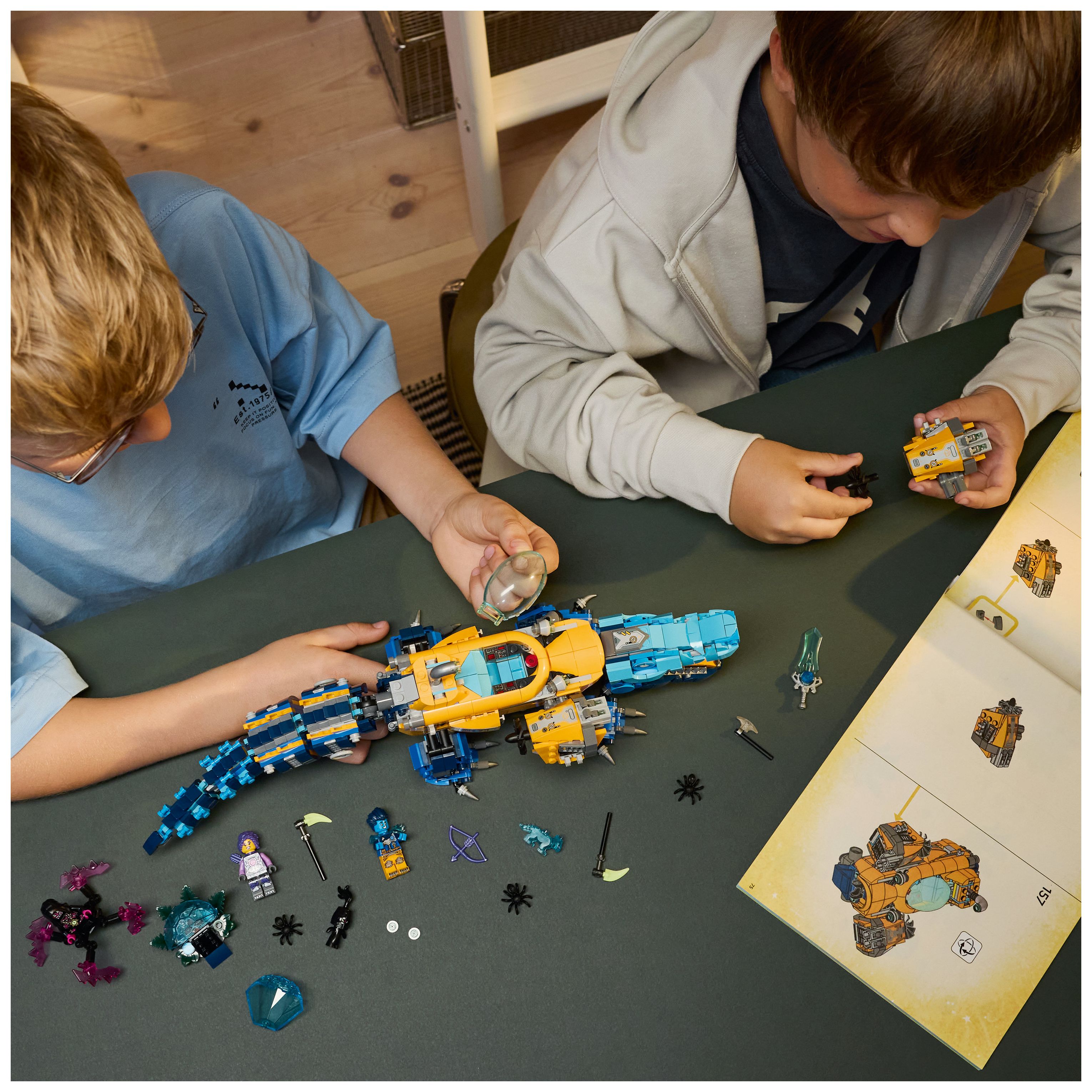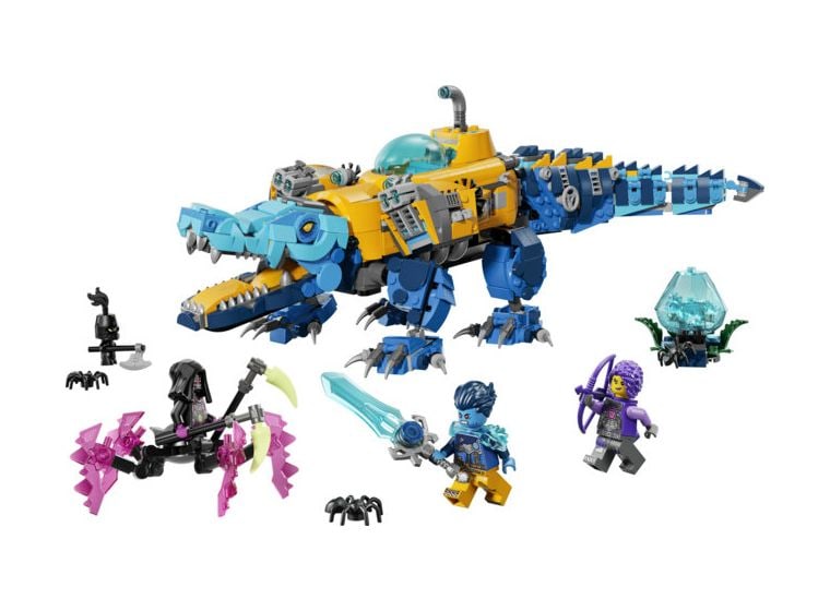 Das U-Boot hat zwei Shooter und ein Geheimfach sowie ein Cockpit, in das eine Minifigur passt. Das Krokodil kann Kopf, Beine und Schwanz bewegen, und der Adler hat bewegliche Flügel mit Federn, die an Boostern stecken. Neben den Minifiguren Logan, Zoey und Arika laden auch ein Albgnom, 2 Spinnen und eine Blaue Schatzkreatur zu fantasievollen Rollenspielen ein. Logan schwingt ein blaues Schwert zum Sammeln, Zoey trägt einen Bogen und Arika hat eine Sense.