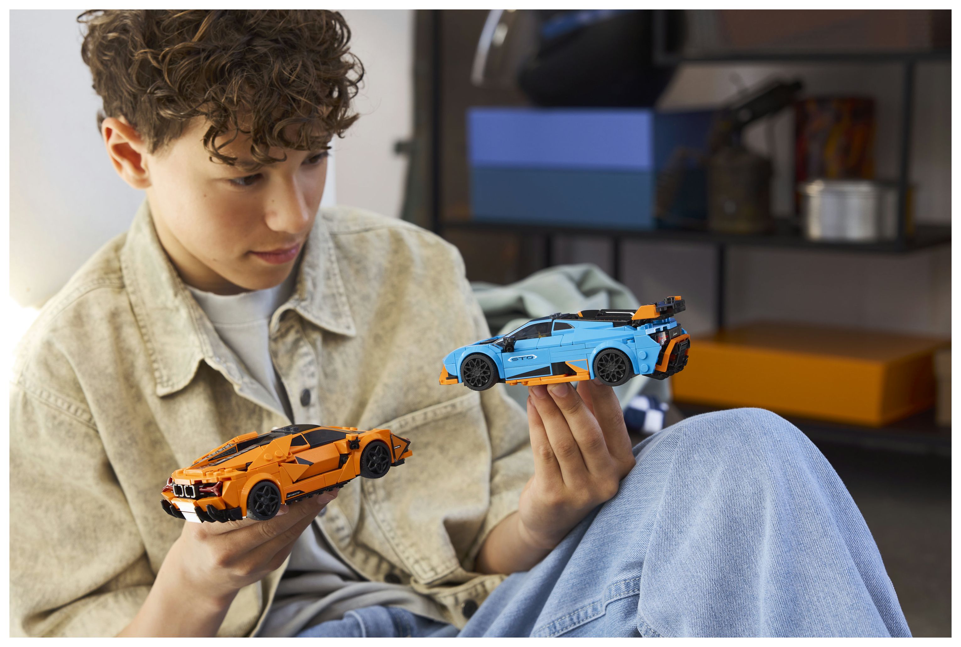 Mit seinem V12-Motor ist der Revuelto das bisher leistungsstärkste Modell des italienischen Autobauers. Und der Huracán STO ist sowohl auf der Straße als auch auf der Rennstrecke zu Hause. Beide Spielzeugautos haben die authentischen Lamborghini Details der echten Flitzer. Hierzu zählen unter anderem die Lufteinlässe, die Heckflügel sowie die futuristischen Y-förmigen Scheinwerfer und Rückleuchten. Zu beiden Spielzeugautos gehört auch eine Rennfahrer- und eine Rennfahrerin-Minifigur, die man für Rennen hinters Lenkrad setzen kann.