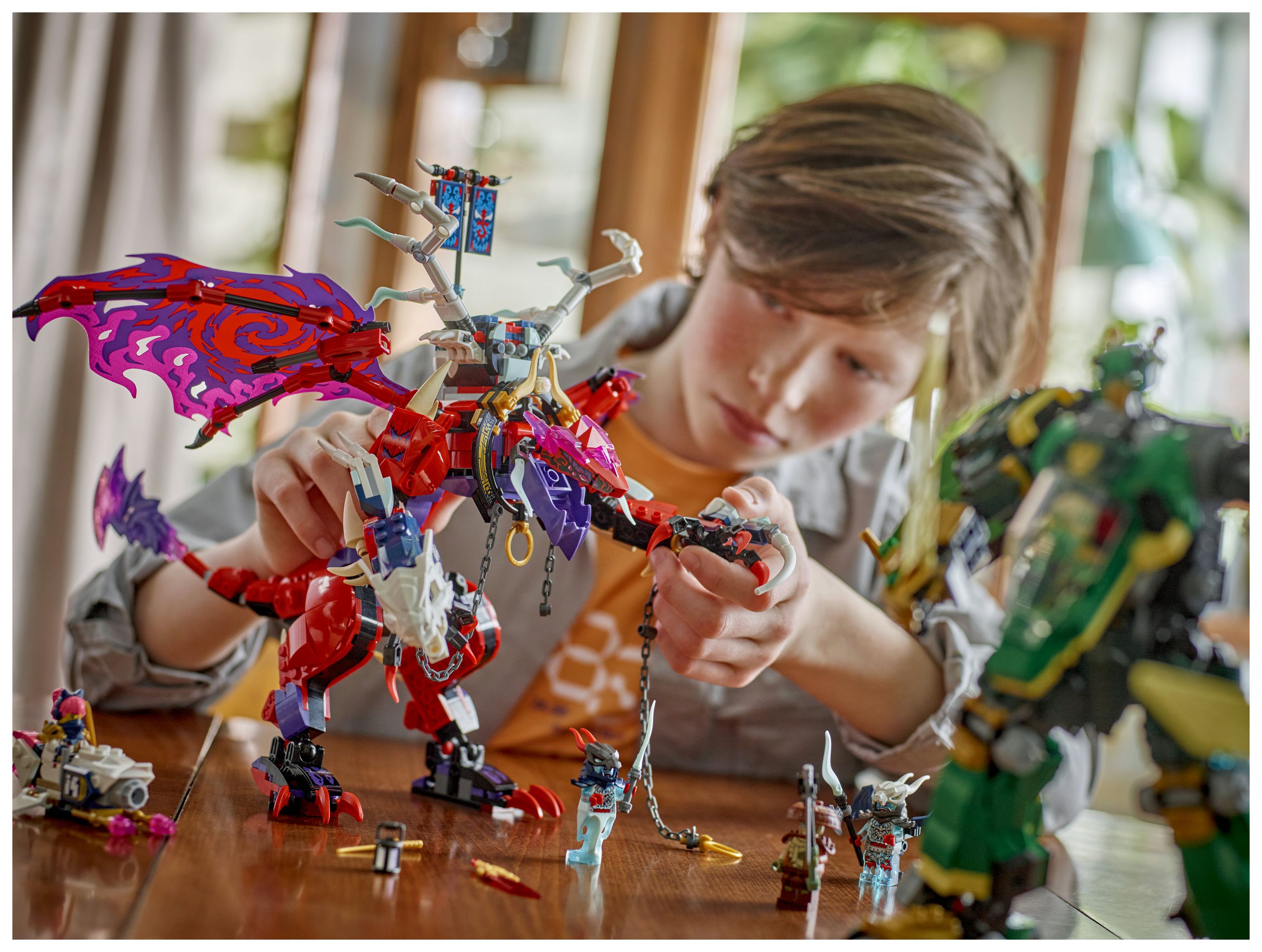 Dieses Abenteuerset für jede Menge Actionspaß beinhaltet 5 Minifiguren. Sora und Lloyd tragen Ninja-Ausrüstung, um es mit den 3 Bösewichten aufzunehmen. Kur, Tyr und ein Geisterdrachenkämpfer haben ein Banner mit einer Geheimbotschaft, die sich nur mit Lloyds Enthüllungsklinge entschlüsseln lässt. Sora hat ein fliegendes Motorrad, und die Bösewichte haben einen beweglichen Geisterdrachen, der sich mit Teilen aus dem separat erhältlichen Spielset Chaosdrache Donnerzahn (71832) kombinieren lässt. Das Set besteht aus 1.112 Teilen.