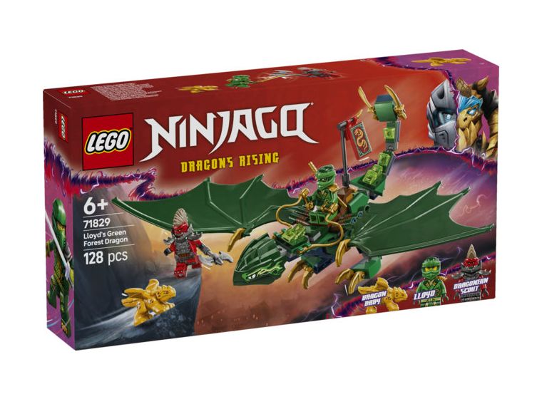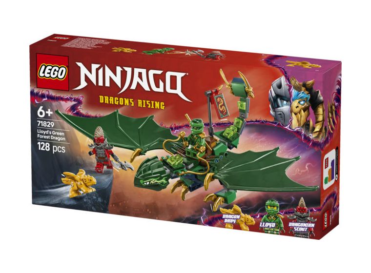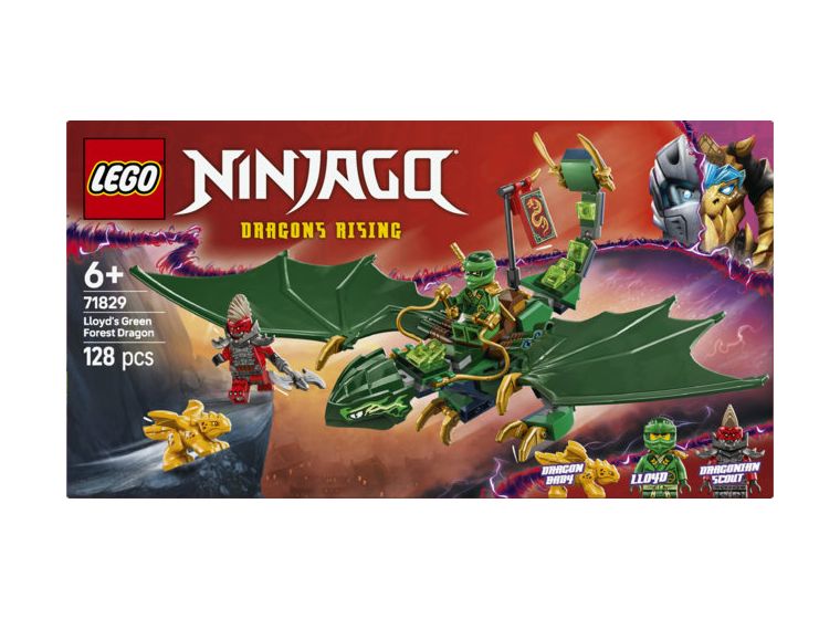 Lloyds grüner Walddrache (71829) ist ein Bau- und Spielset, mit dem Jungen und Mädchen ab 6 Jahren packende Actionszenen in der Luft aus der 3. Staffel der TV-Serie NINJAGO® Aufstieg der Drachen nachstellen können. Das Set beinhaltet einen imposanten Spielzeugdrachen, der Schwanz, Hals, Beine, Flügel und Hände bewegen kann. Der Drache trägt einen Sattel auf dem Rücken, damit eine Minifigur auf ihm reiten kann.