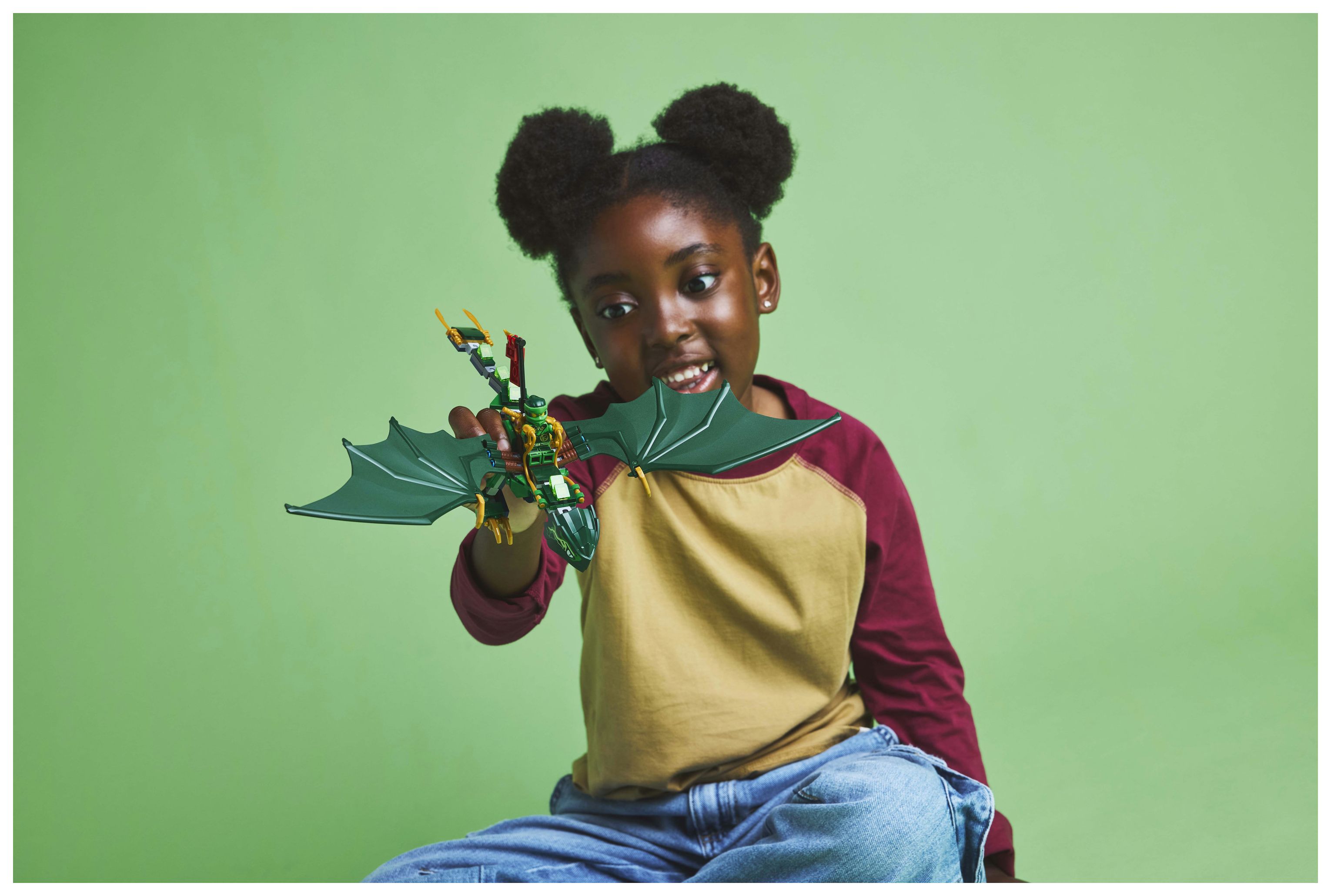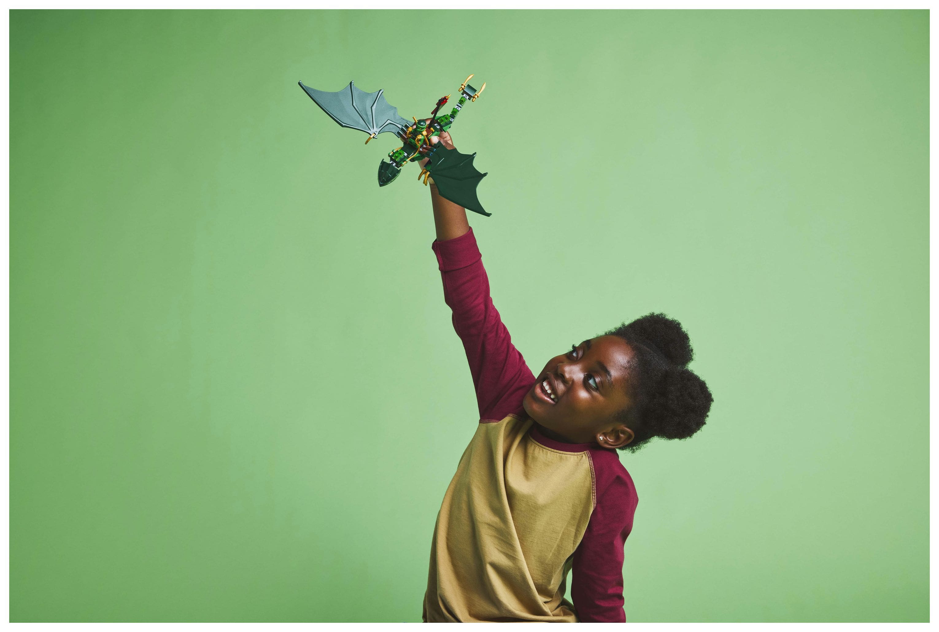 Beweglicher NINJAGO® Drache: Lloyds grüner Walddrache ist ein baubares Modell, das Schwanz, Hals, Beine, Hände und Flügel bewegen kann. Der Drache trägt einen Sattel auf dem Rücken, damit eine Minifigur auf ihm reiten kann